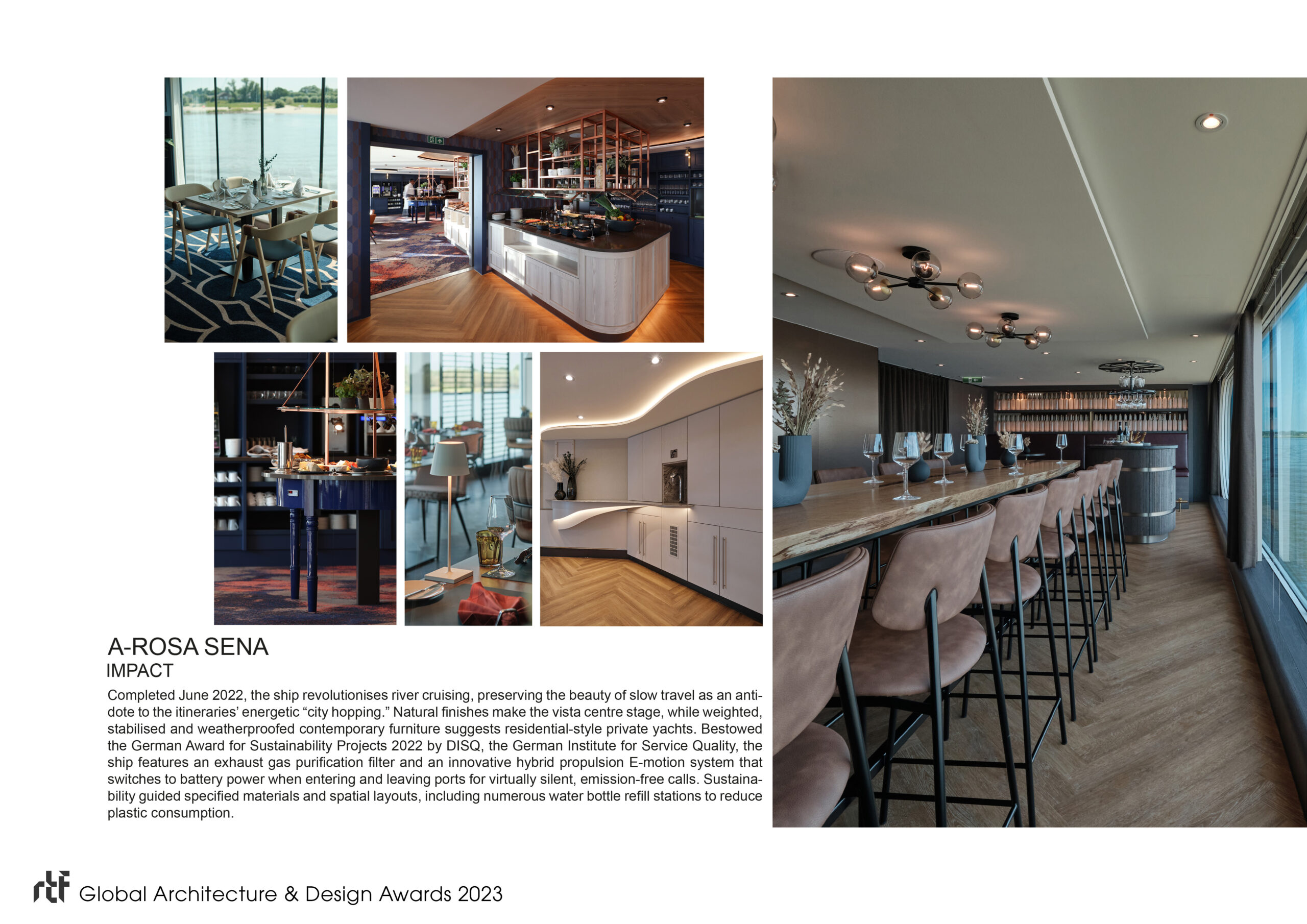 Completed June 2022, the ship revolutionises river cruising, preserving the beauty of slow travel as an antidote to the itineraries’ energetic “city hopping.” Natural finishes make the vista centre stage, while weighted, stabilised and weatherproofed contemporary furniture suggests residential-style private yachts. Bestowed the German Award for Sustainability Projects 2022 by DISQ, the German Institute for Service Quality, the ship features an exhaust gas purification filter and an innovative hybrid propulsion E-motion system that switches to battery power when entering and leaving ports for virtually silent, emission-free calls. Sustainability guided specified materials and spatial layouts, including numerous water bottle refill stations to reduce plastic consumption.