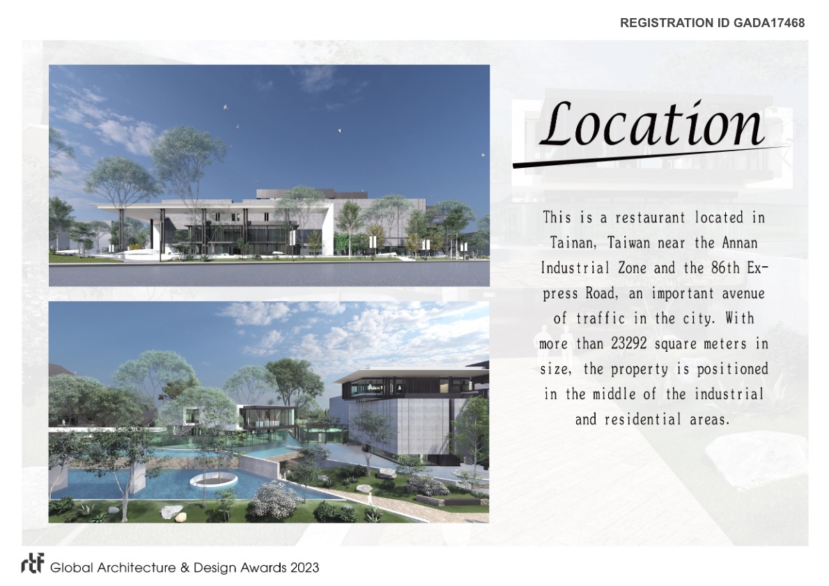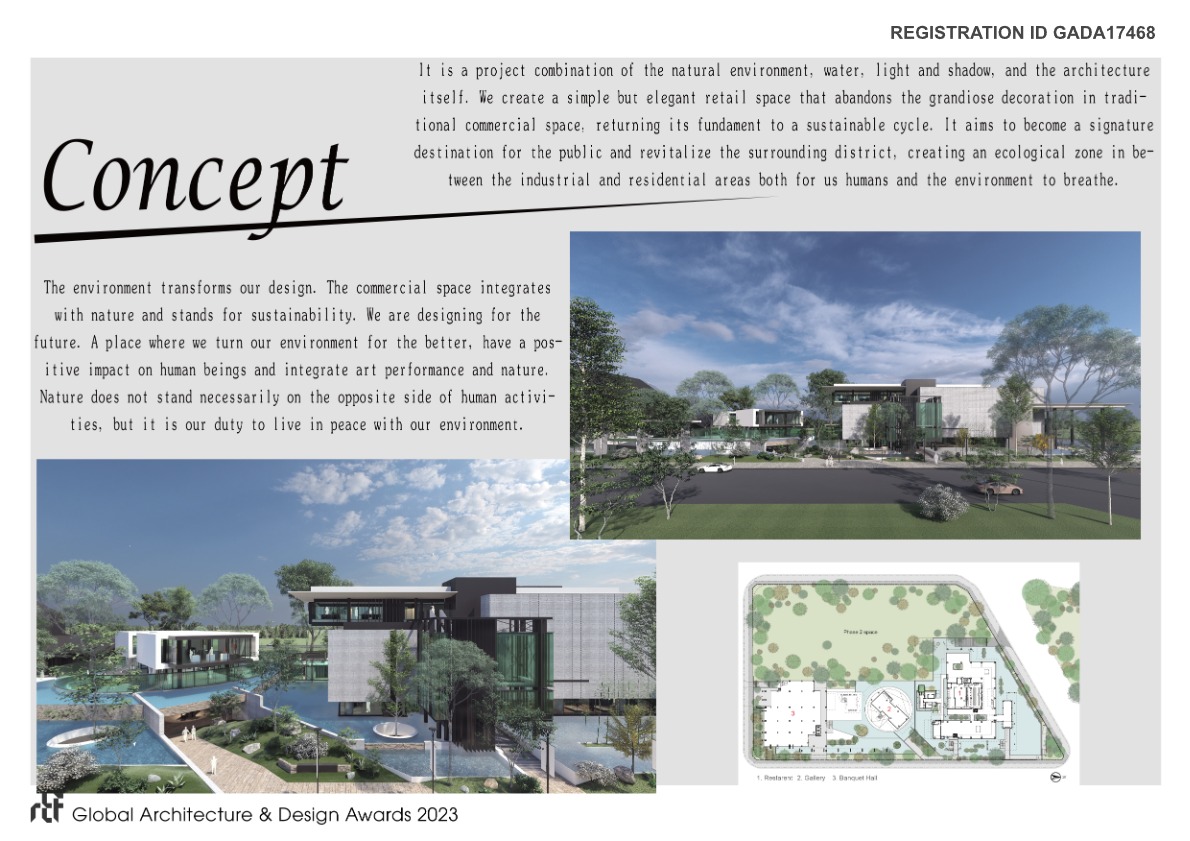It is a project combination of the natural environment, water, light and shadow, and the architecture itself. We create a simple but elegant restaurant space that abandons the grandiose decoration in traditional commercial space, returning its fundament to a sustainable cycle. It aims to become a signature destination for the public and revitalize the surrounding district, creating an ecological zone in between the industrial and residential areas both for us humans and the environment to breathe.