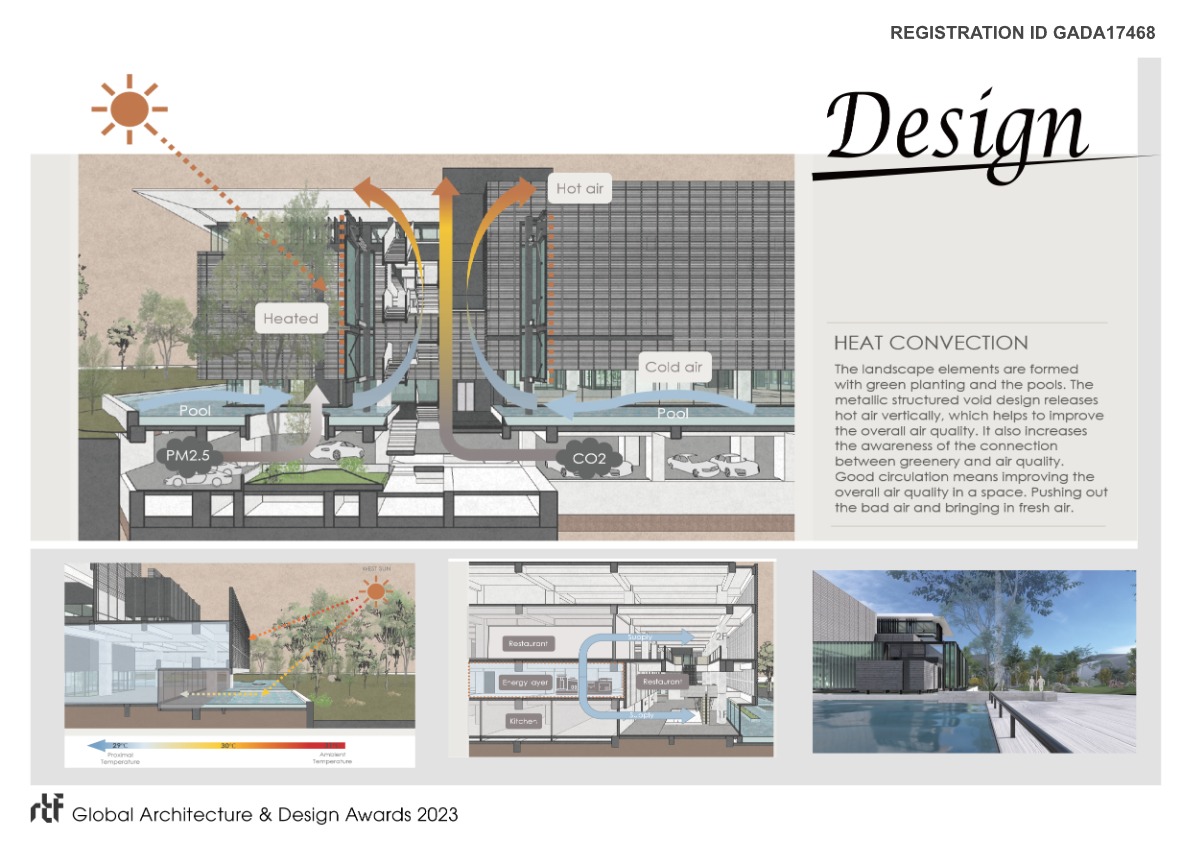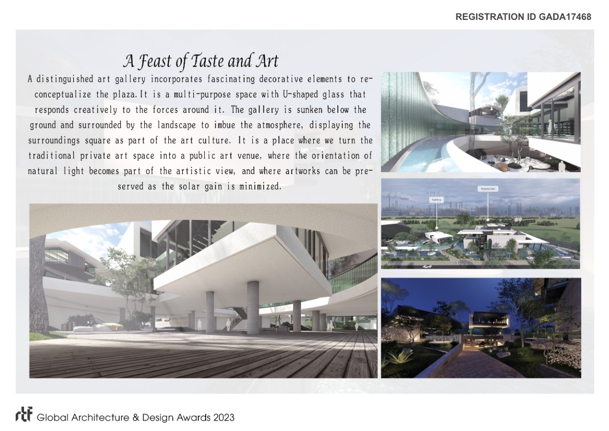 Although nature matters, it is still a place for human activities. We want to create a space where every function works seamlessly together. It is not just a restaurant or an art gallery, but a place where people can feel relaxed and at home in the bustling urban area. Our entrance encourages diners and visitors to change different mindsets by pushing the retreat line meters back, letting the surrounding vegetation brings back the sense of calmness and peacefulness. After a deep breath of the soothing environment, a feast of taste and art is ready. A distinguished art gallery incorporates fascinating decorative elements to reconceptualize the plaza. It is a multi-purpose space with U-shaped glass that responds creatively to the forces around it. The gallery is sunken below the ground and surrounded by the landscape to imbue the atmosphere, displaying the surroundings square as part of the art culture. It is a place where we turn the traditional private art space into a public art venue, where the orientation of natural light becomes part of the artistic view, and where artworks can be preserved as the solar gain is minimized.