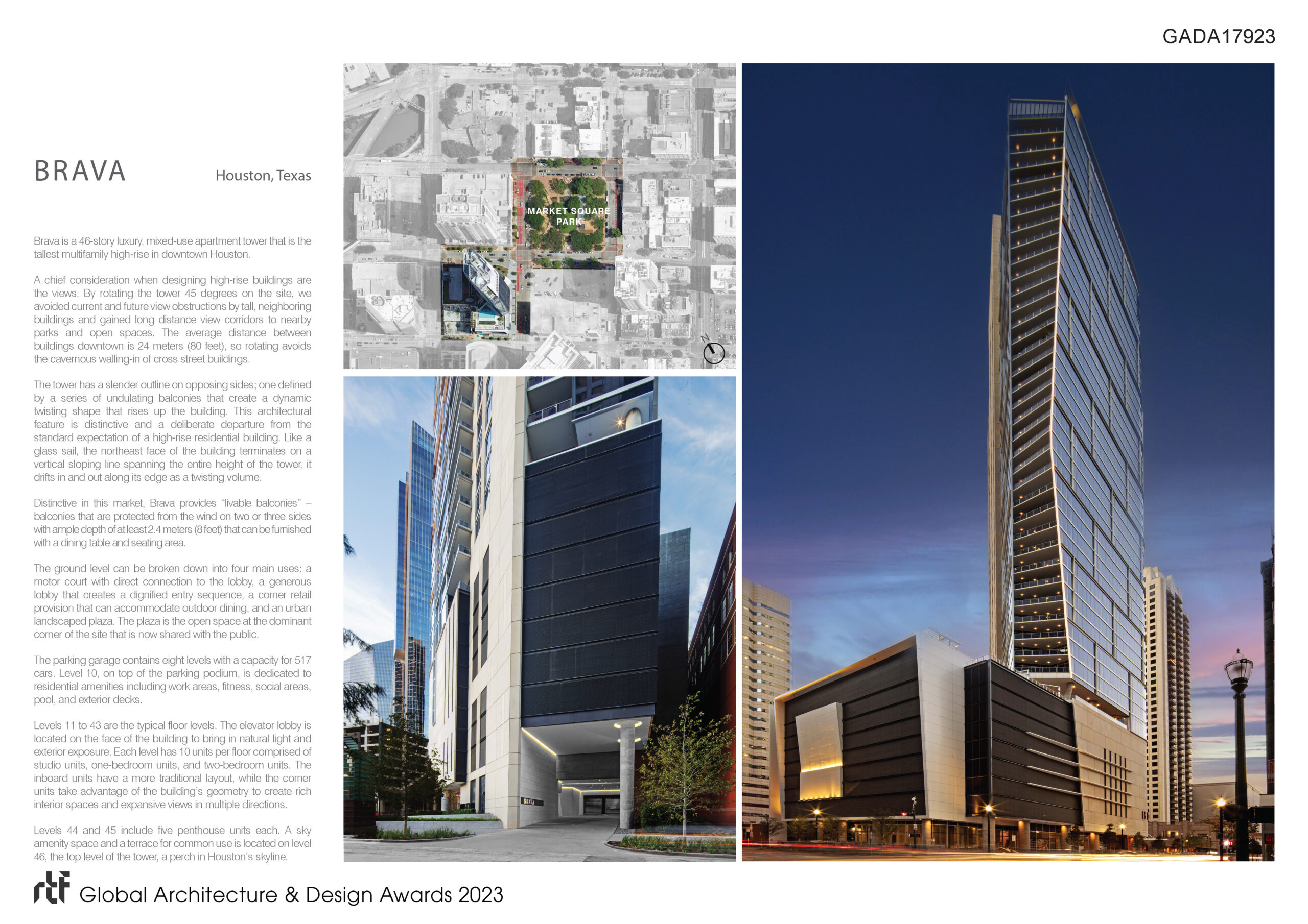Brava is a 46-story luxury, mixed-use apartment tower that is the tallest multifamily high-rise in downtown Houston.