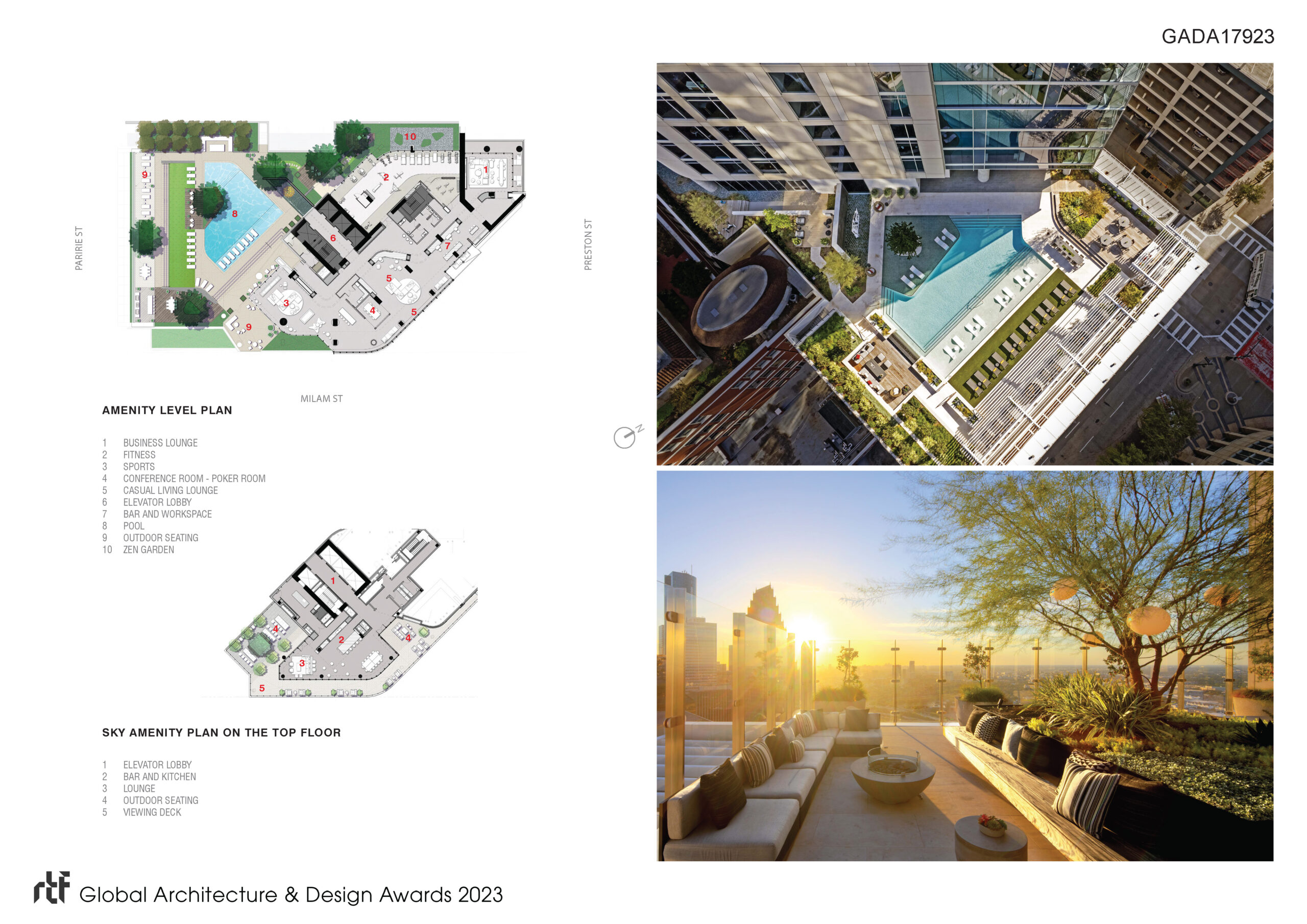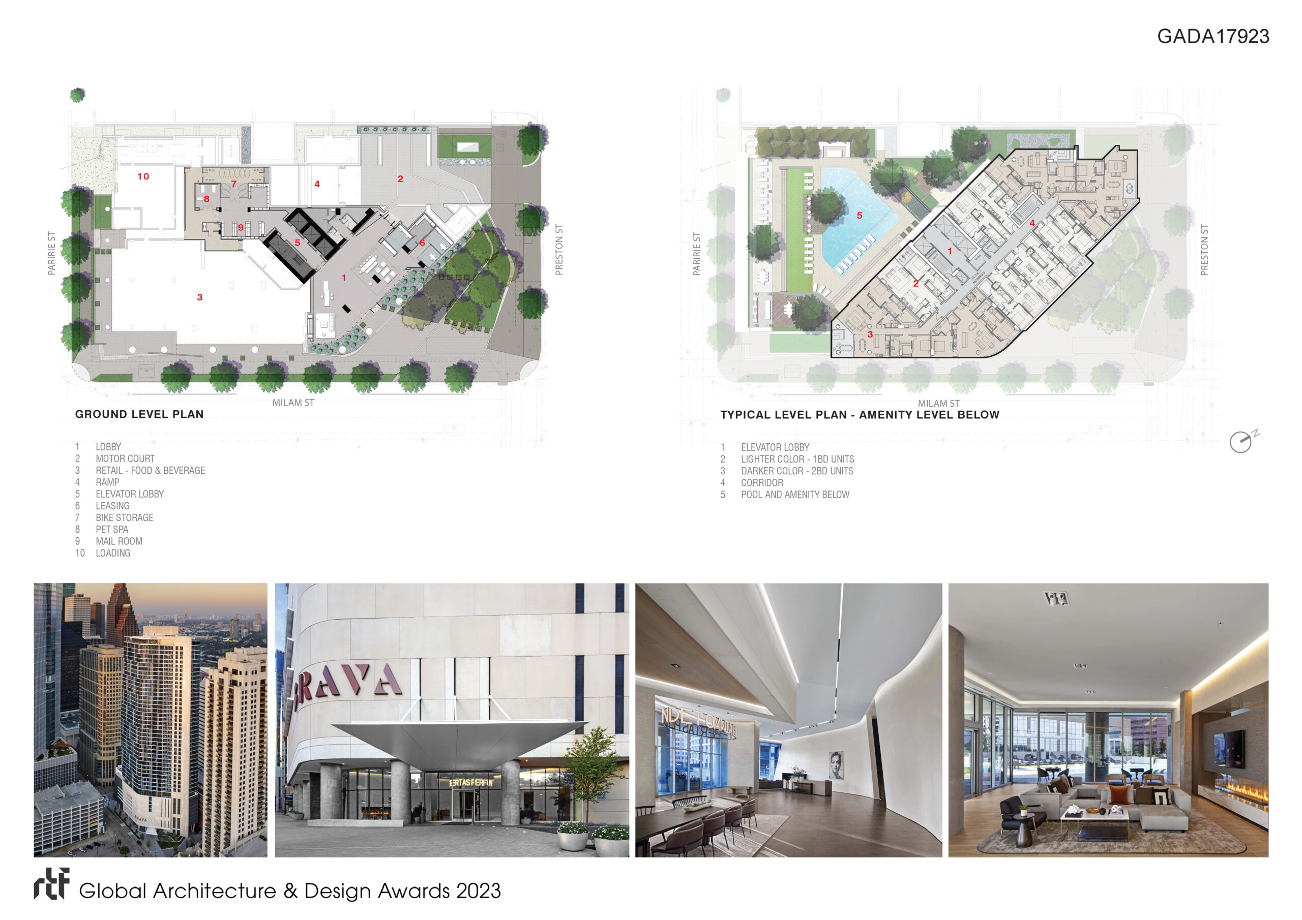The parking garage contains eight levels with a capacity for 517 cars. Level 10, on top of the parking podium, is dedicated to residential amenities including work areas, fitness, social areas, pool, and exterior decks.