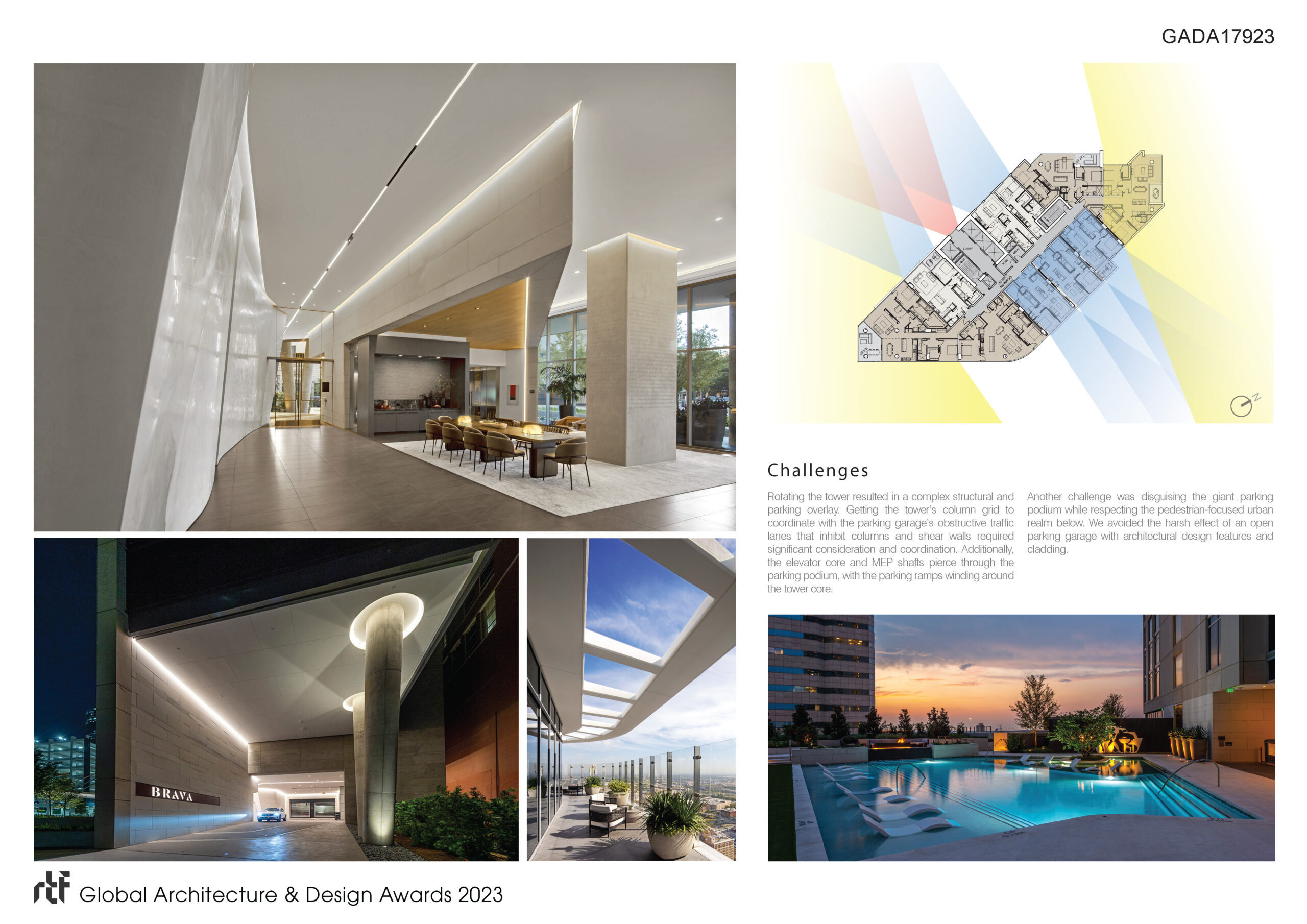 Rotating the tower resulted in a complex structural and parking overlay. Getting the tower’s column grid to coordinate with the parking garage’s obstructive traffic lanes that inhibit columns and shear walls required significant consideration and coordination. Additionally, the elevator core and MEP shafts pierce through the parking podium, with the parking ramps winding around the tower core.