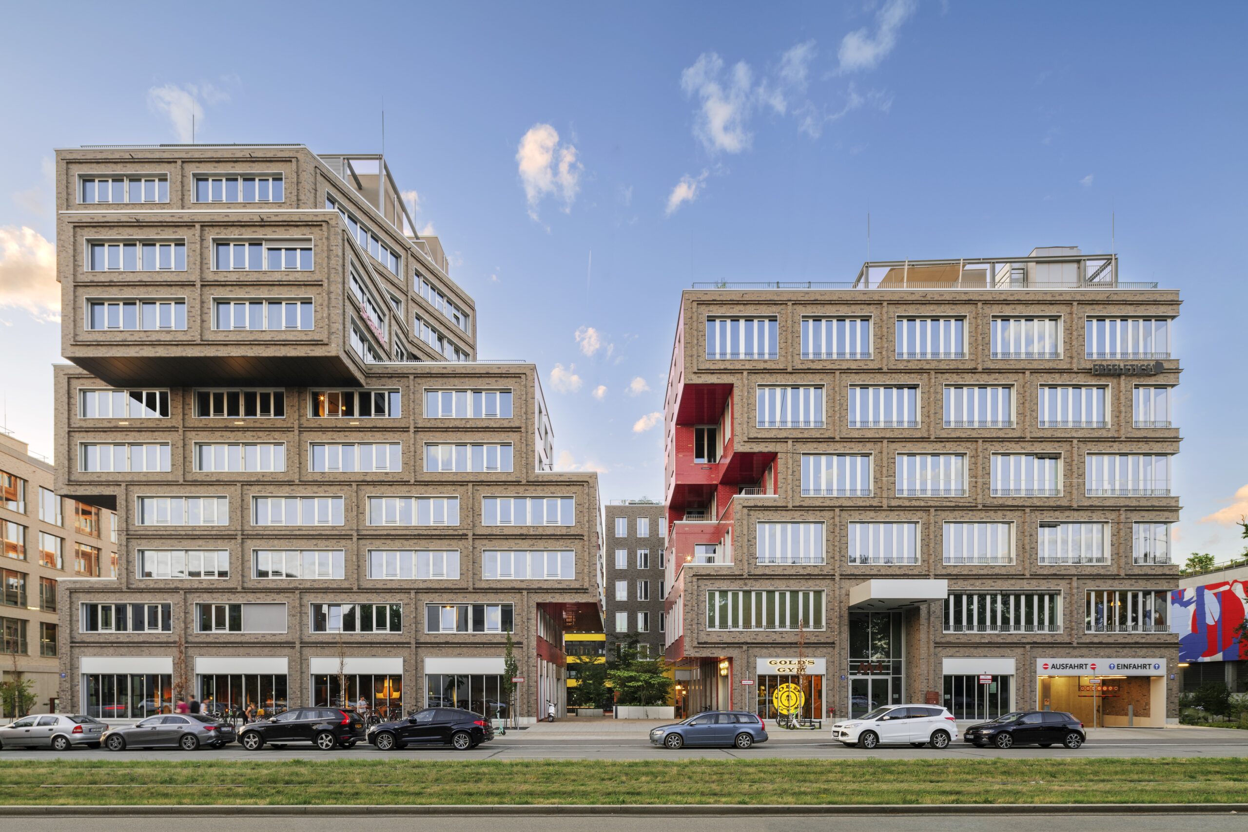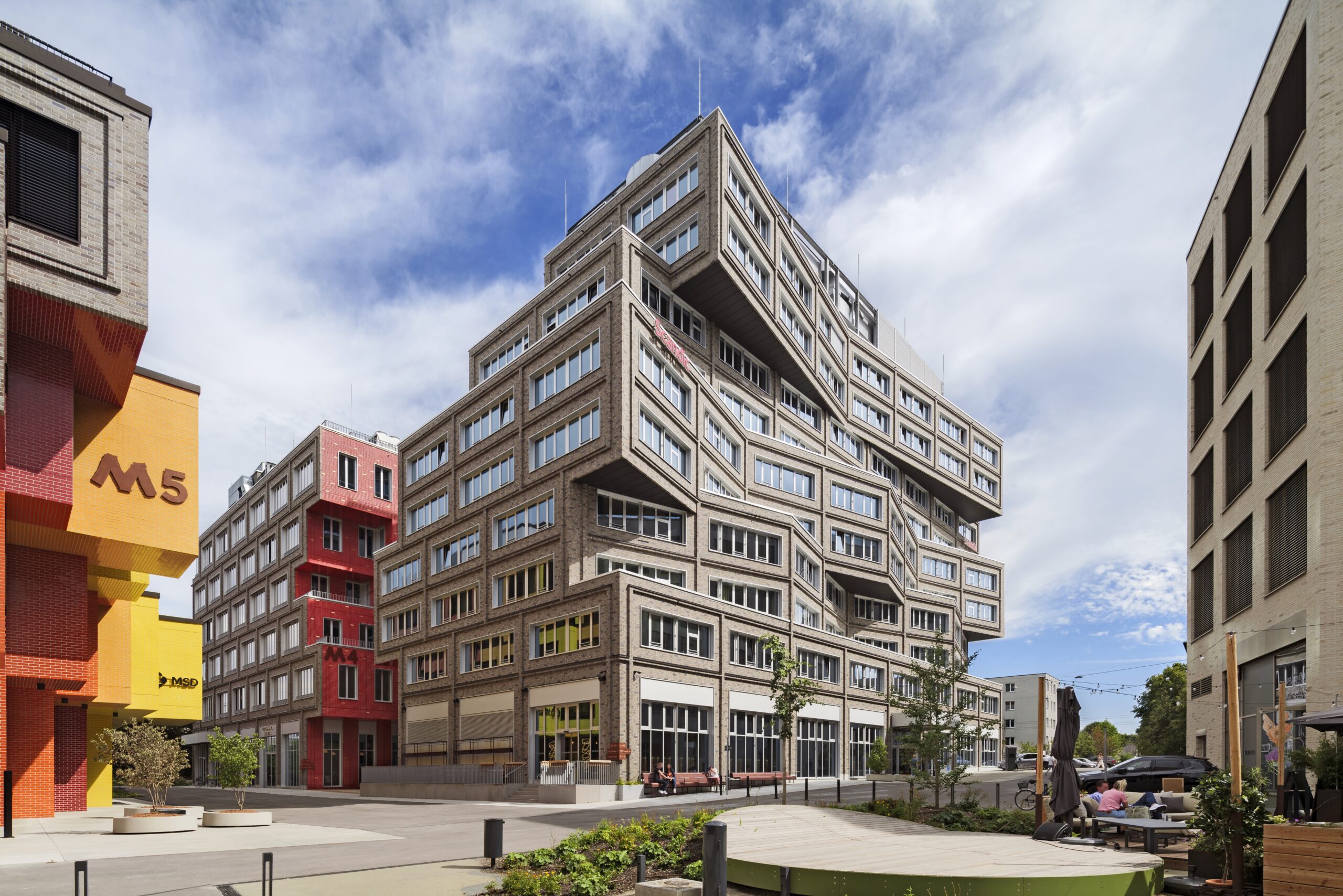 Die Macherei, the first LEED-GOLD neighborhood in Europe, was designed in collaboration between three architecture firms. Die Macherei comprises six multi-purpose buildings, including a new hotel, the Scandic München Macherei, a Coworking Building by Design Office, Retail as Amenity with a grocer, gym, restaurant, and bar and office space.