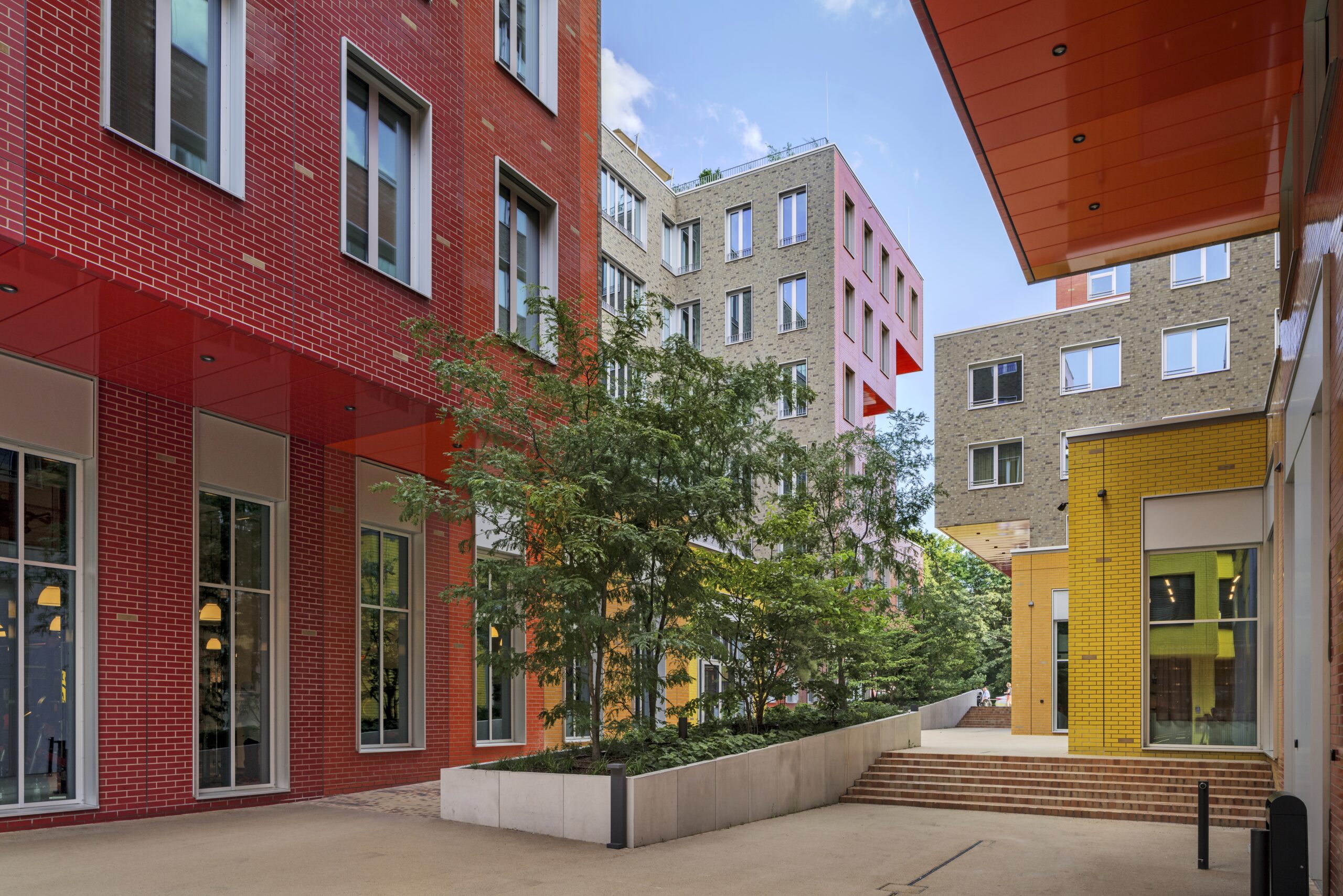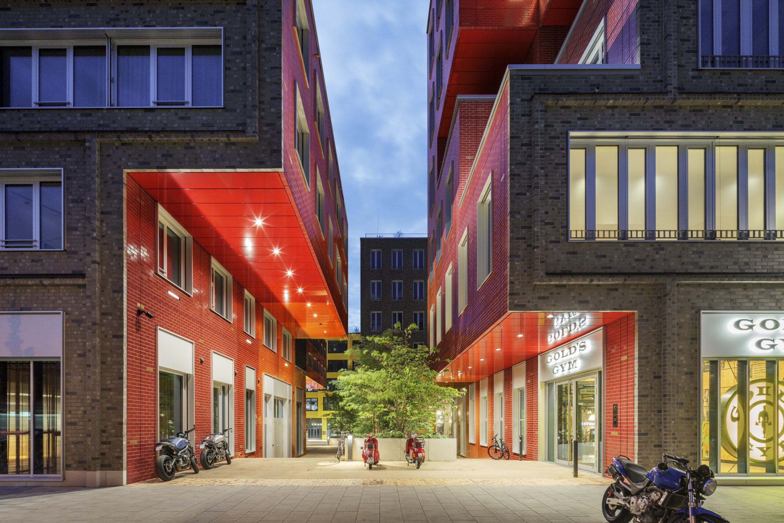 Separated from the Scandic hotel by a new pedestrian canyon is a Gold’s Gym with offices above. Carving out this, and two additional, canyons was key to making the neighborhood more welcoming, and introducing a sense of place to the community beyond simply the new development. The main canyon leads to another office building and a public plaza, the facade of which is clad in the same glossy, red-to-orange brick as the sides of the canyon—an image of pure joy that draws people toward it.