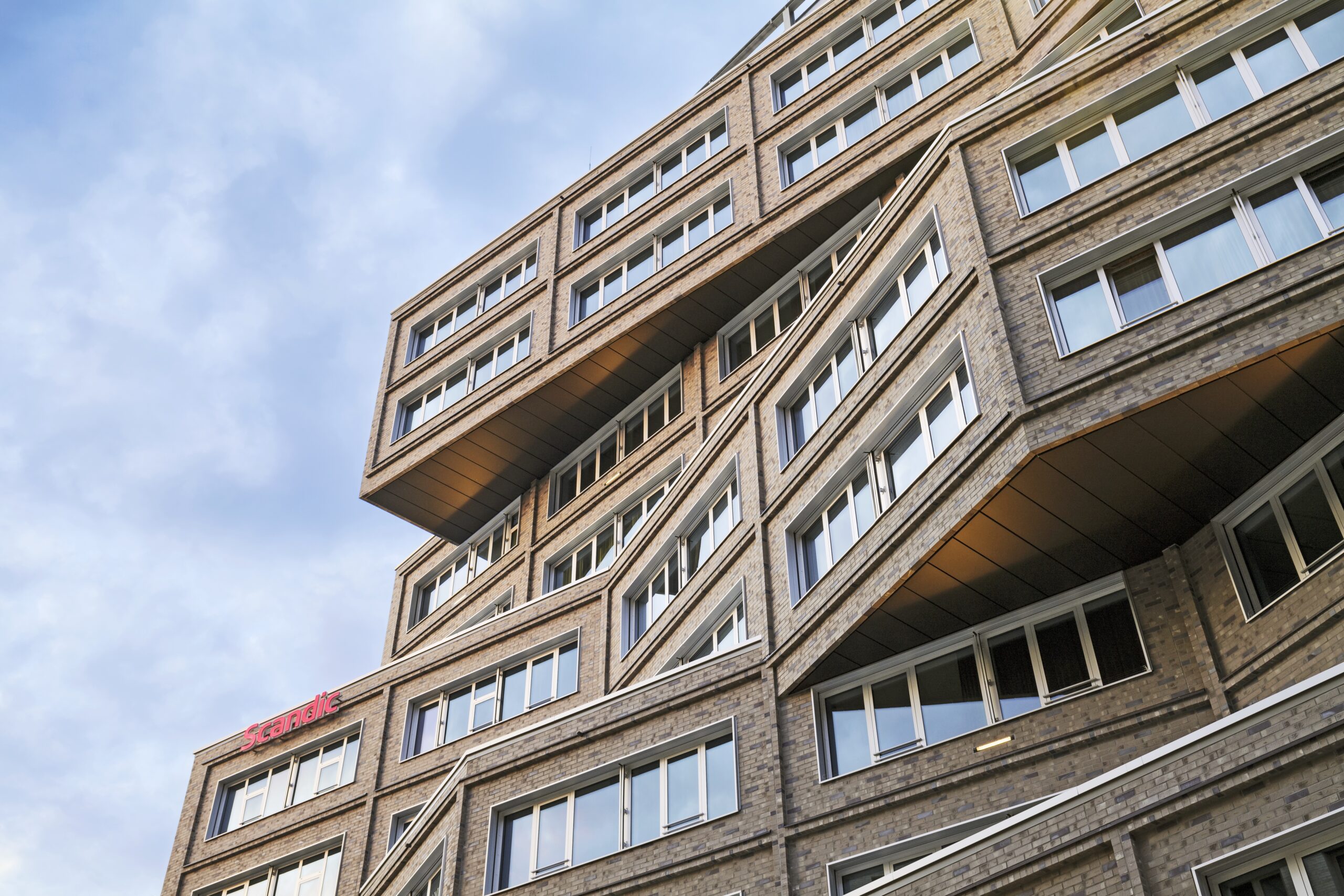 This place-shaping, new neighborhood transforms a once-barren, industrial area into a neighborhood that is welcoming, human, eventful, and filled with emotion. The Scandic München Macherei hotel, ten stories high like its neighbors, is clad in a rough, earthen-brown brick. The hotel is immediately unforgettable due to its stacked and sculpted façade. From a distance, the entire face of the hotel appears to be in motion, with individual folds rippling across the exterior.