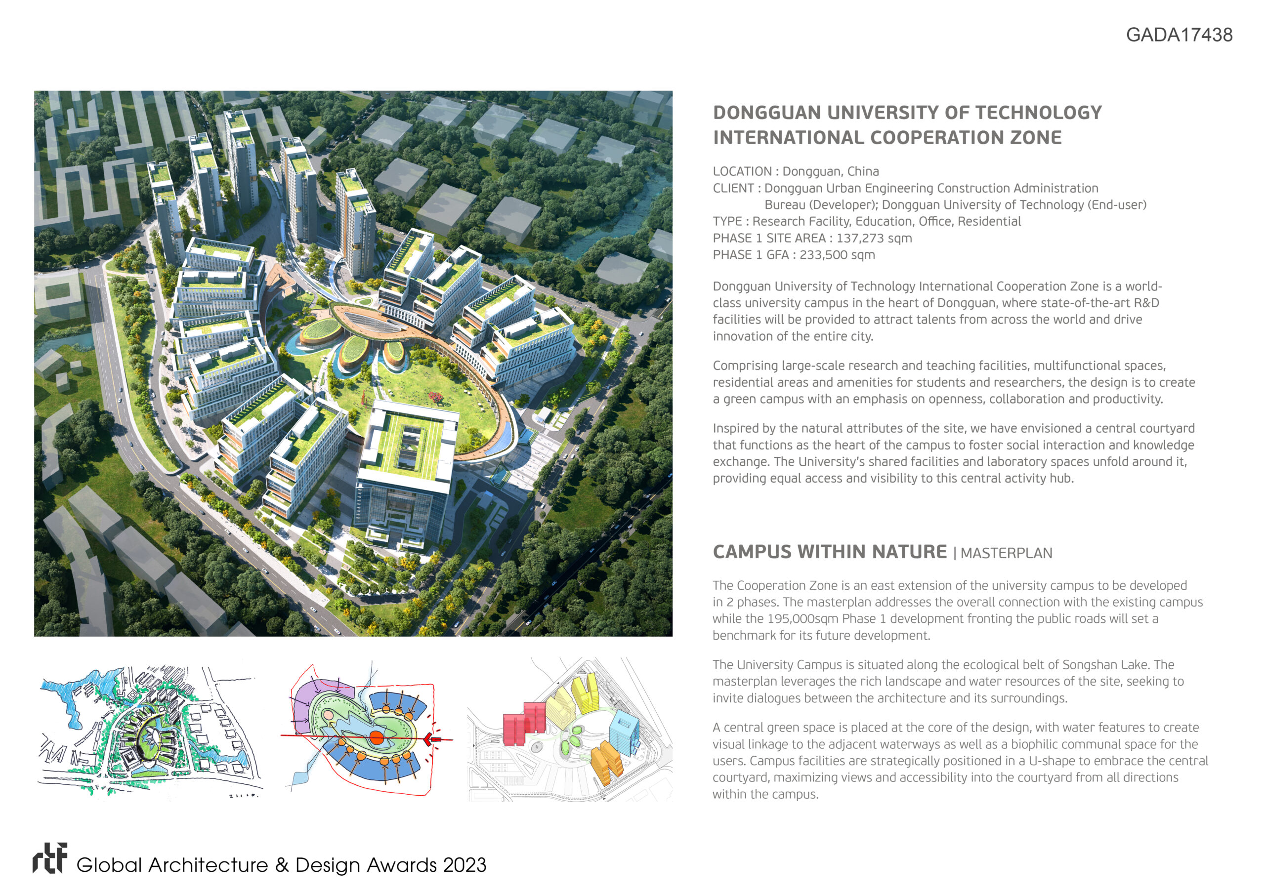 Dongguan University of Technology International Cooperation Zone is a world-class university campus in the heart of Dongguan, where state-of-the-art R&D facilities will be provided to attract talents from across the world and drive innovation of the entire city. Comprising large-scale research and teaching facilities, multifunctional spaces, residential areas and amenities for students and researchers, the design is to create a green campus with an emphasis on openness, collaboration and productivity.