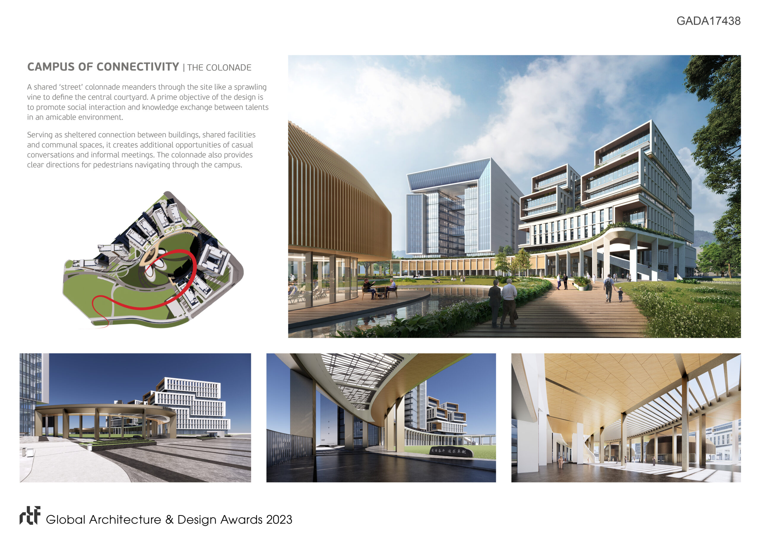 A shared ‘street’ colonnade meanders through the site like a sprawling vine to define the central courtyard. A prime objective of the design is to promote social interaction and knowledge exchange between talents in an amicable environment. Serving as sheltered connection between buildings, shared facilities and communal spaces, it creates additional opportunities of casual conversations and informal meetings.