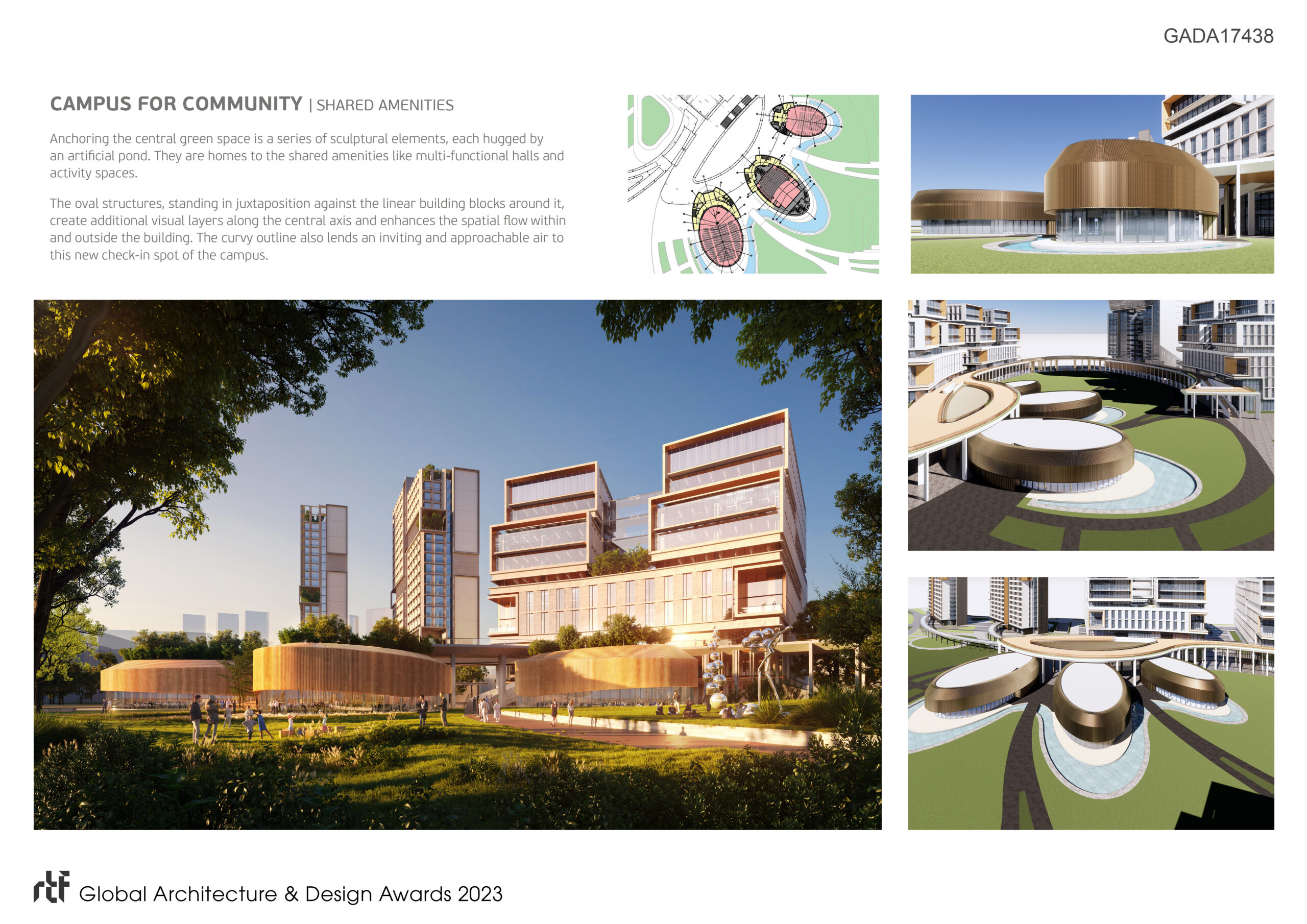 Anchoring the central green space is a series of sculptural elements, each hugged by an artificial pond. They are homes to the shared amenities like multi-functional halls and activity spaces. The oval structures, standing in juxtaposition against the linear building blocks around it, create additional visual layers along the central axis and enhances the spatial flow within and outside the building. The curvy outline also lends an inviting and approachable air to this new check-in spot of the campus.