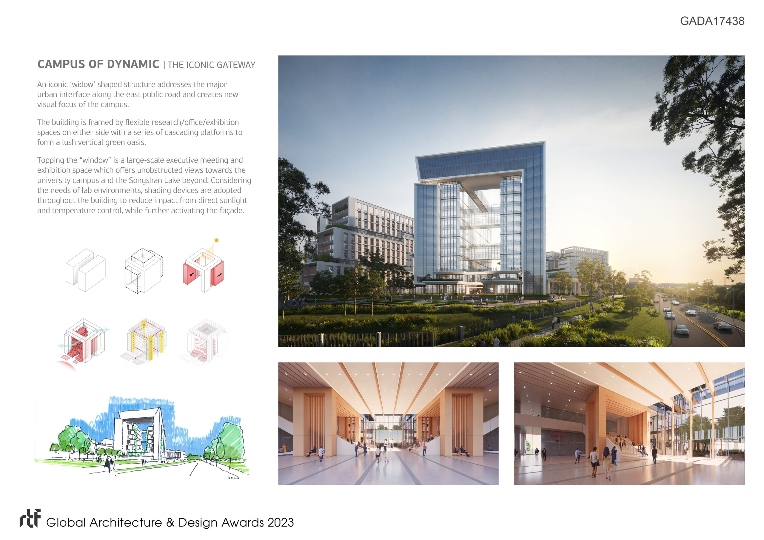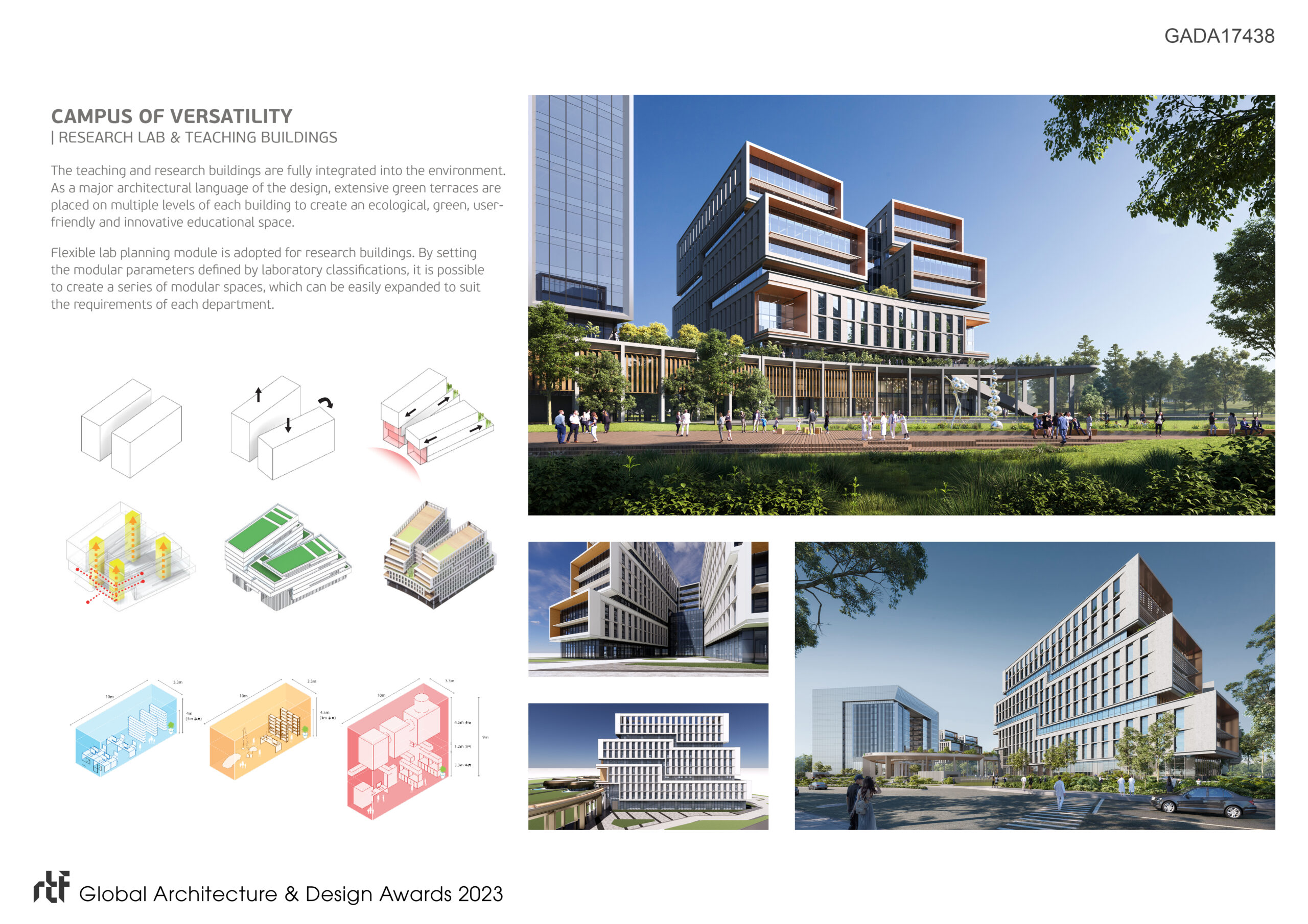 The teaching and research buildings are fully integrated into the environment. As a major architectural language of the design, extensive green terraces are placed on multiple levels of each building to create an ecological, green, user-friendly and innovative educational space. Flexible lab planning module is adopted for research buildings. By setting the modular parameters defined by laboratory classifications, it is possible to create a series of modular spaces, which can be easily expanded to suit the requirements of each department.The design of the Dongguan University of Technology maximises the natural texture of the site and brings together landscape, science and talent.