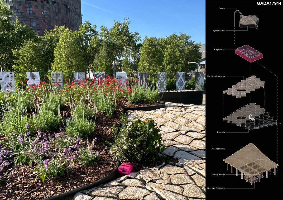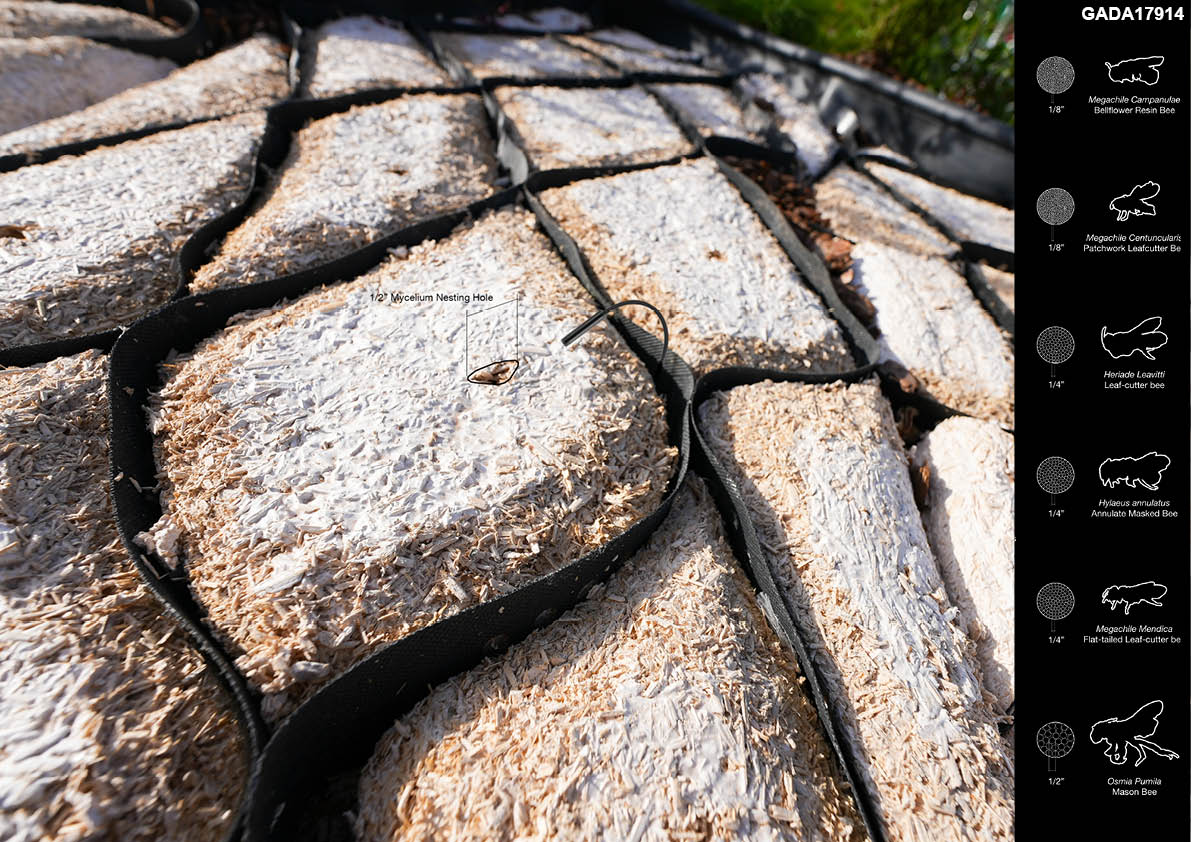 The surface of this installation is made of mycelium-hempcrete solitary “bee nests,” cast in place into geocells, and native plants: it offers a surface of encounter and empathy between human and non-humans. The mycelium was grown over two weeks for the installation; it has air dried to its current hardness. After the installation we propose that these bee panels be given away: people can place a bee panel under a plant or bush in a garden and it can provide a new habitat until it eventually decomposes and can become compost for the garden.