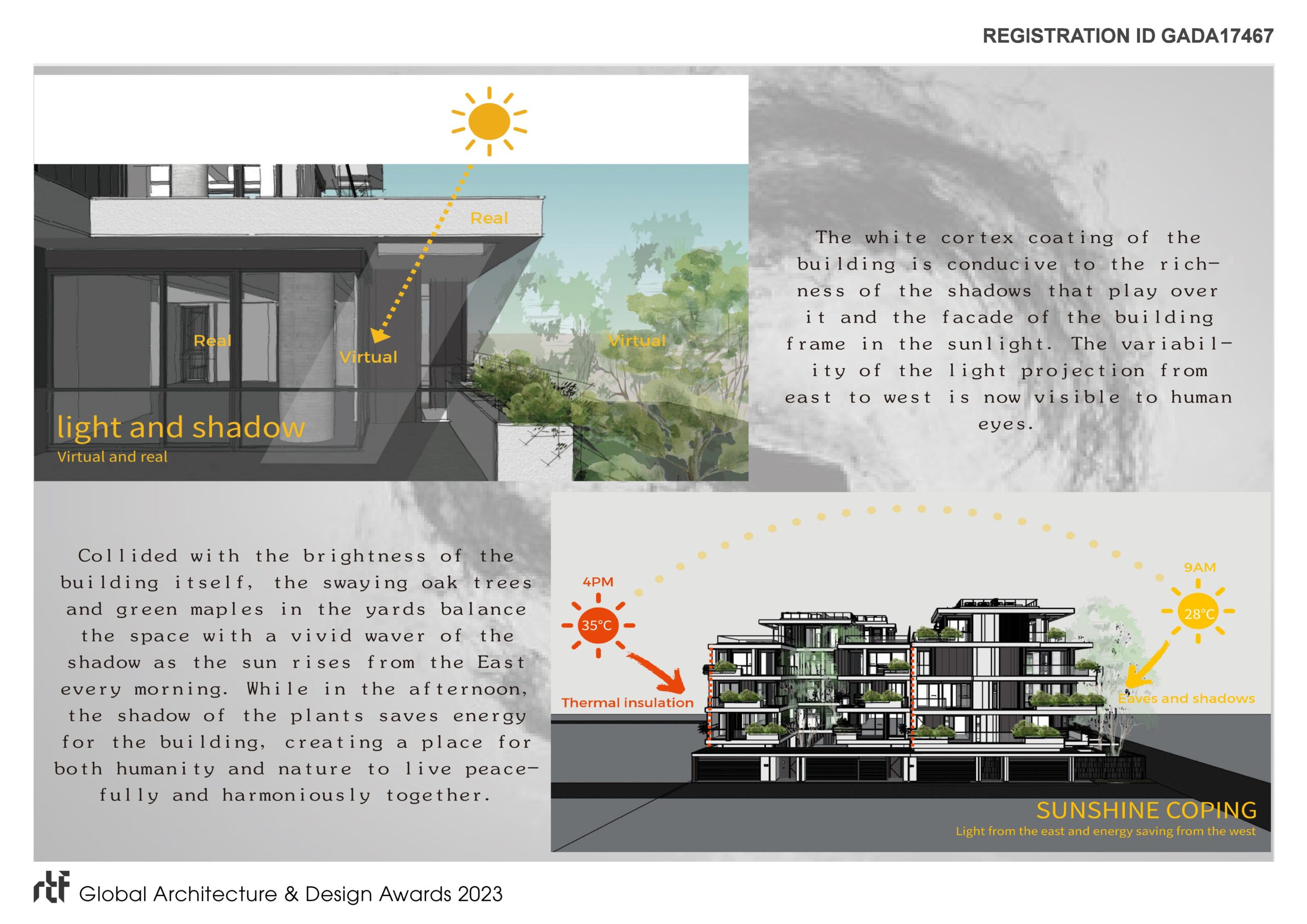 As mentioned, the white cortex coating of the building is conducive to the richness of the shadows that play over it and the facade of the building frame in the sunlight. The variability of the light projection from east to west is now visible to human eyes. We apply the Chinese philosophy of “Yin and Yang” and traditional Chinese “Feng Shui” to the architecture, making the architecture an attractive appearance and enriching meaningful connotations. Collided with the brightness of the building itself, the swaying oak trees and green maples in the yards balance the space with a vivid waver of the shadow as the sun rises from the East every morning. While in the afternoon, the shadow of the plants saves energy for the building, creating a place for both humanity and nature to live peacefully and harmoniously together.