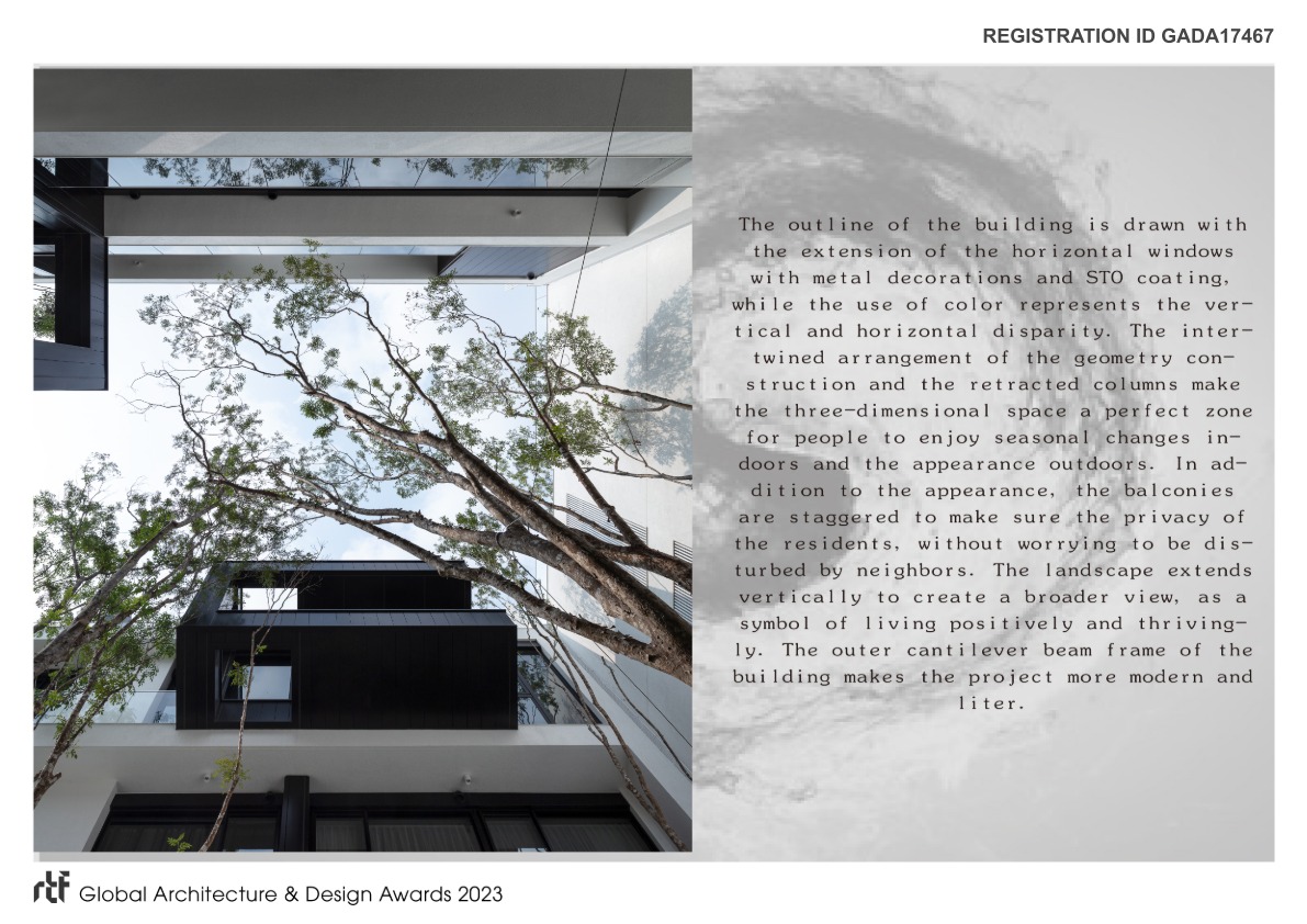 The outline of the building is drawn with the extension of the horizontal windows with metal decorations and STO coating, while the use of color represents the vertical and horizontal disparity. The intertwined arrangement of the geometry construction and the retracted columns make the three-dimensional space a perfect zone for people to enjoy seasonal changes indoors and the appearance outdoors. In addition to the appearance, the balconies are staggered to make sure the privacy of the residents, without worrying to be disturbed by neighbors. The landscape extends vertically to create a broader view, as a symbol of living positively and thrivingly. The outer cantilever beam frame of the building makes the project more modern and liter.