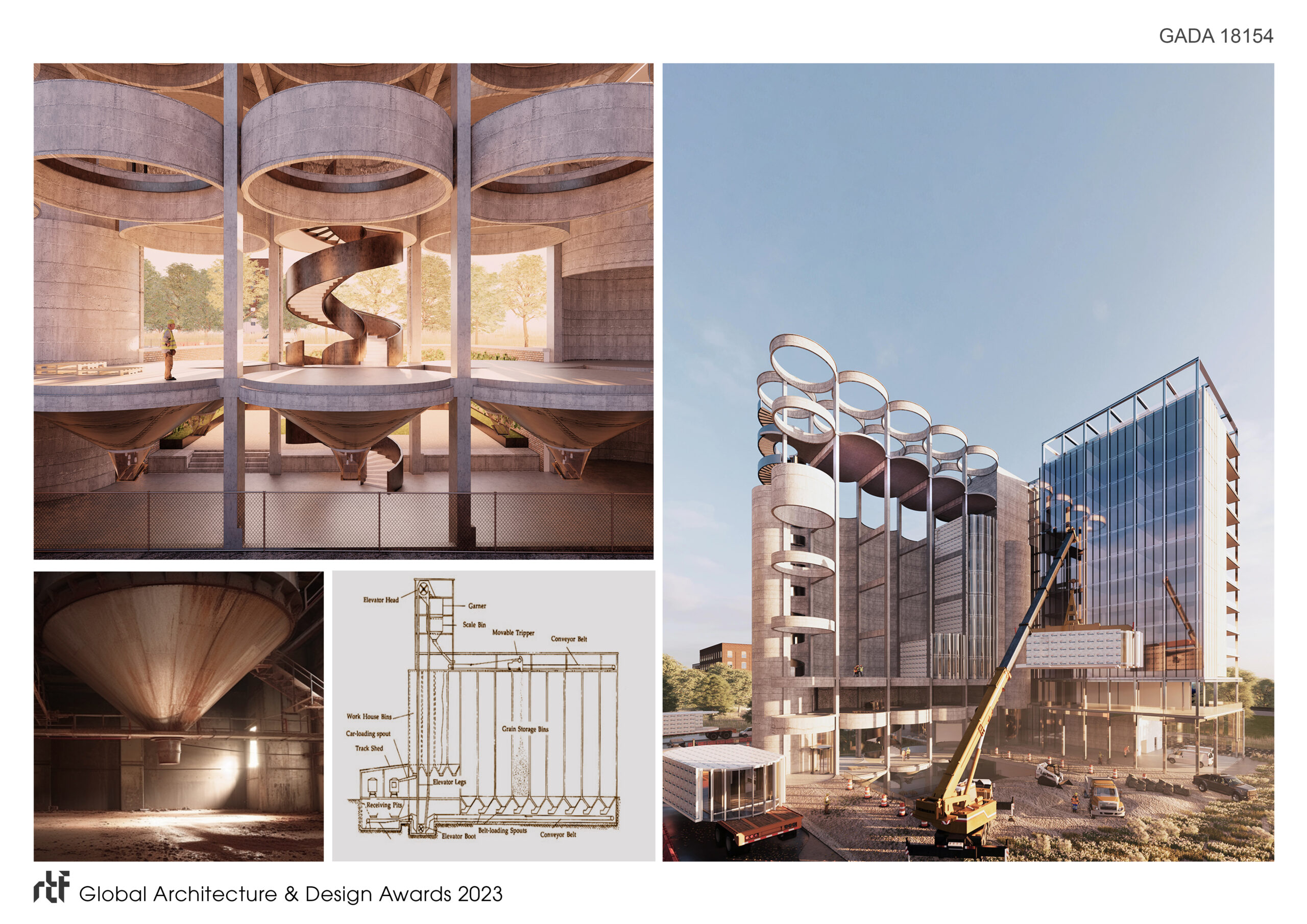 – The silhouette of the silos and elevator are preserved on the west end of the building, while the east side carefully excises out portions of the concrete drums to expose the inner workings, allowing for modular residential and hotel rooms to be stacked within in.