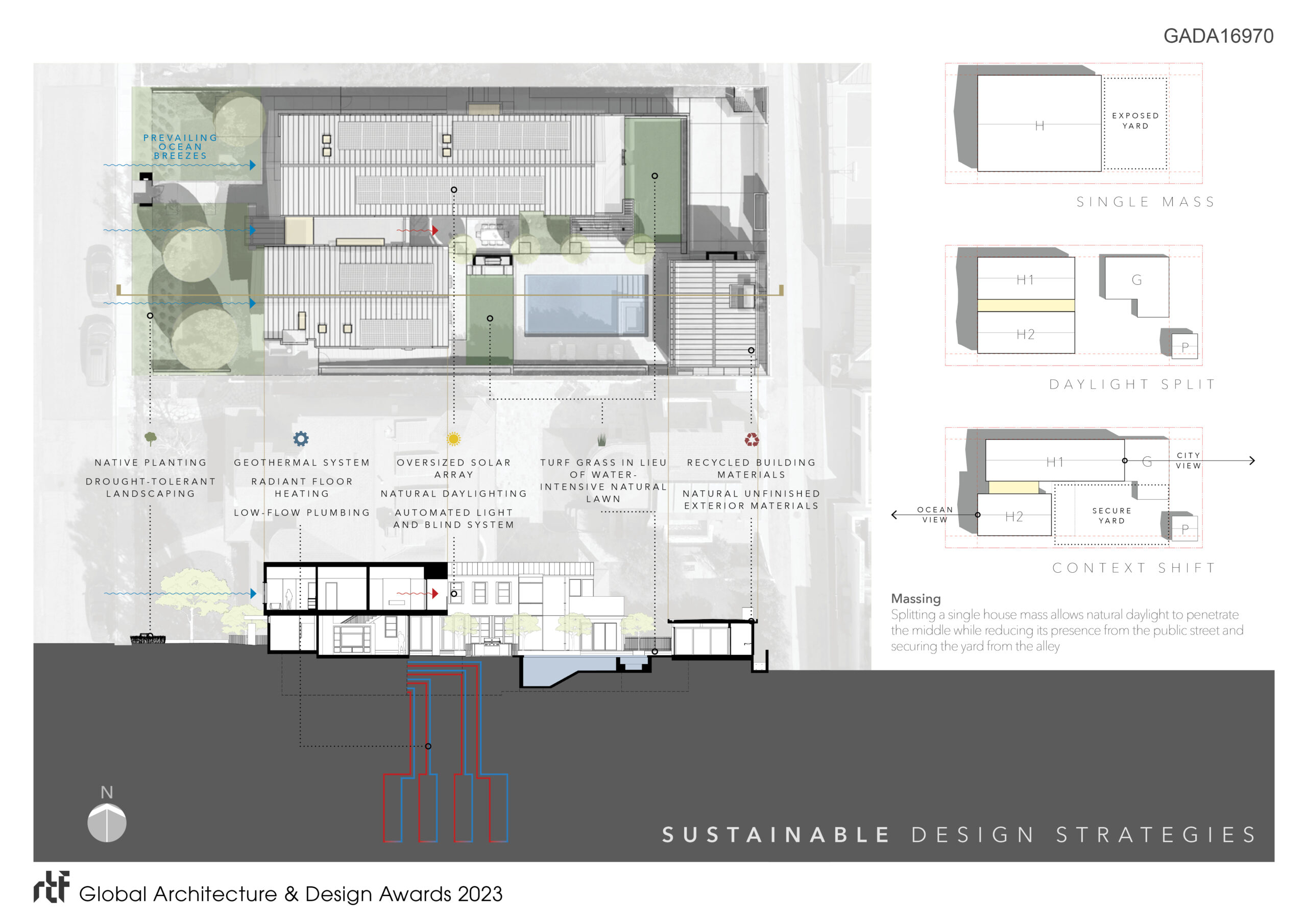 In addition to daylighting and passive cooling through the thermal chimney effect of the glass hall, the house uses a sizable geothermal system and PV array to minimize its environmental impact greatly.