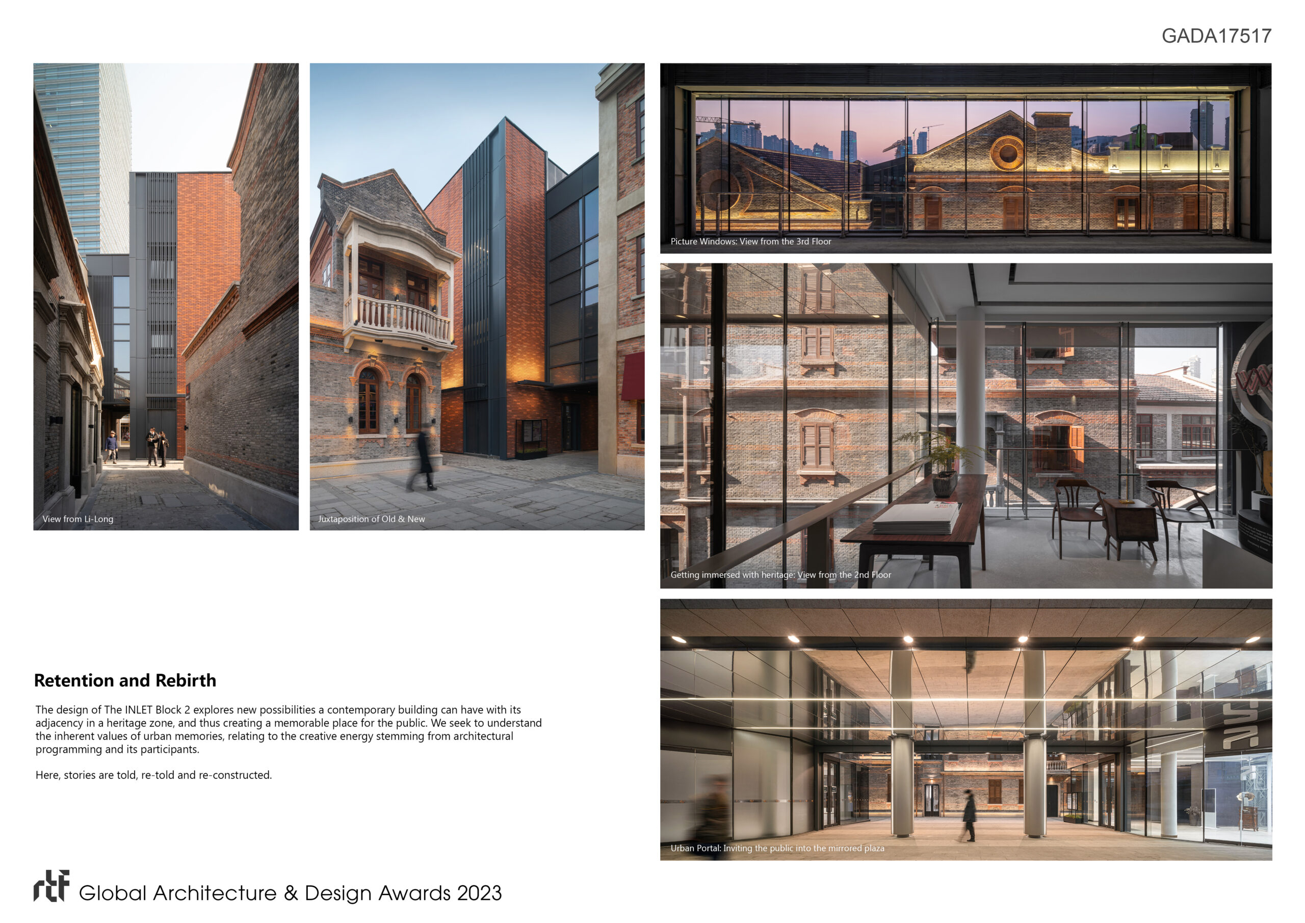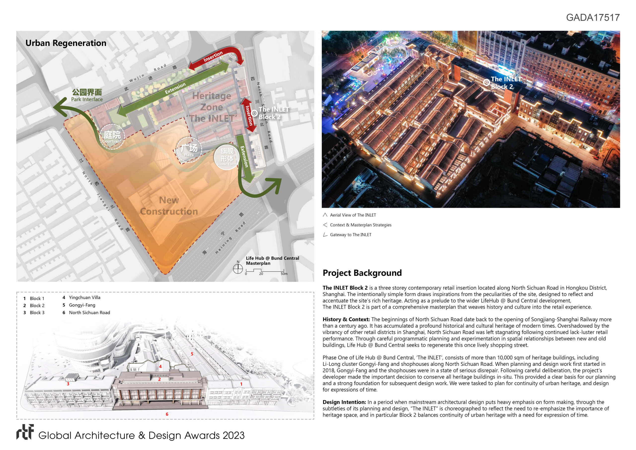 The INLET – Block 2 is a three storey contemporary retail insertion located along North Sichuan Road in Hongkou District, Shanghai. The intentionally simple form draws inspirations from the peculiarities of the site, designed to reflect and accentuate the site’s rich heritage. Acting as a prelude to the wider Life Hub @ Bund Central development, The INLET – Block 2 is part of a comprehensive masterplan that weaves history and culture into the retail experience.