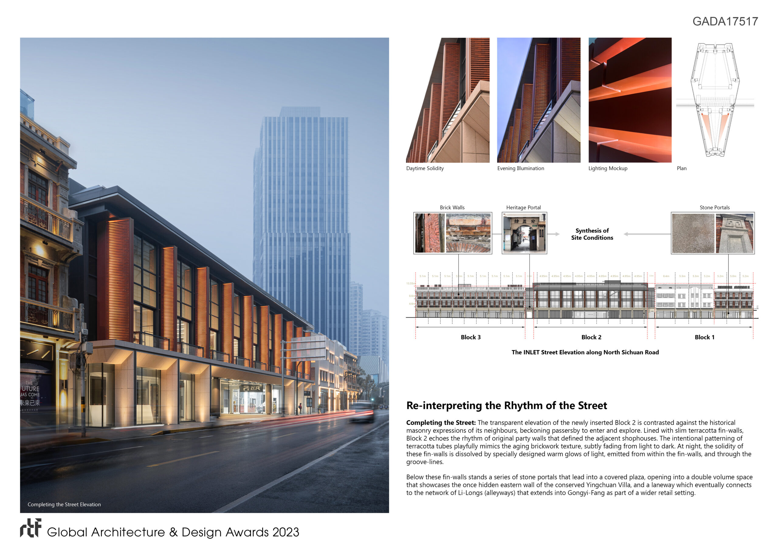 The street elevation echoes the rhythm of the party walls from adjacent shophouses along North Sichuan Road with slim terracotta fin-walls that line the transparent façade. At night, the solidity of these fin-walls is dissolved by warm glows of light, emitted through the groove-lines. Below these fin-walls stands a series of stone portals which lead into a covered plaza that opens into a double volume space, showcasing the once hidden eastern wall of the conserved Yingchuan Villa. Running alongside this face is a laneway which connects to a network of li-longs (alleyways) extending into Gongyi Fang as part of a wider retail setting.