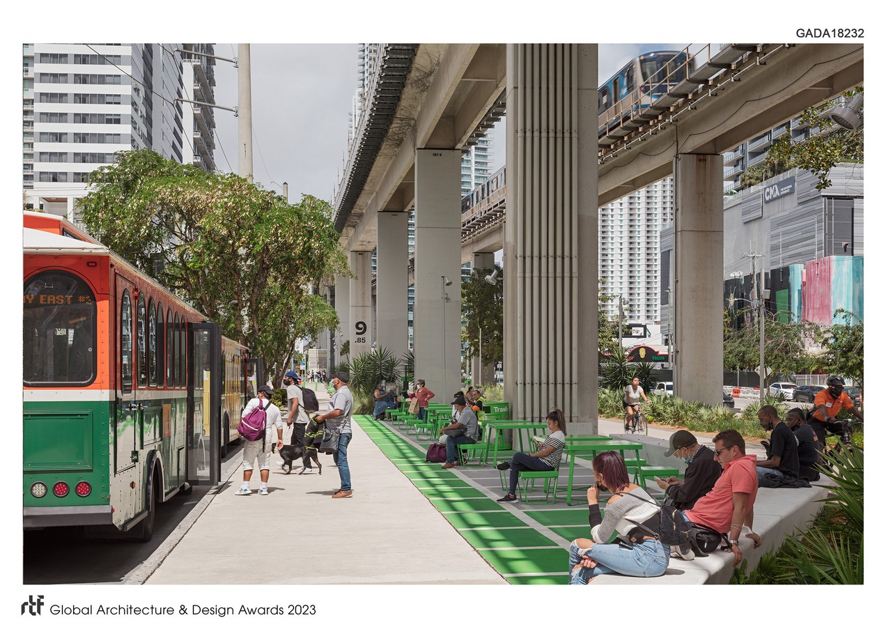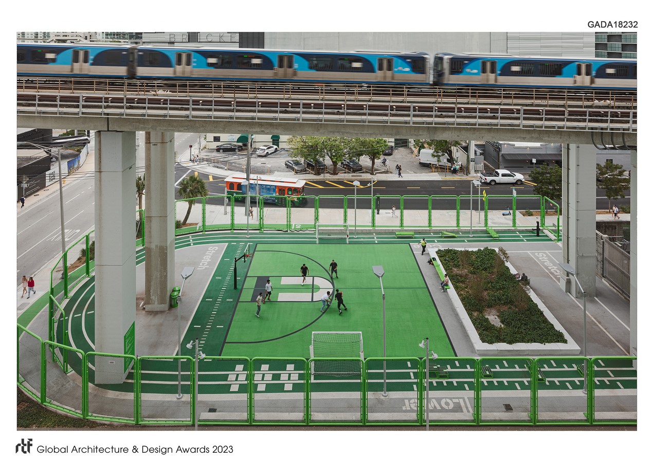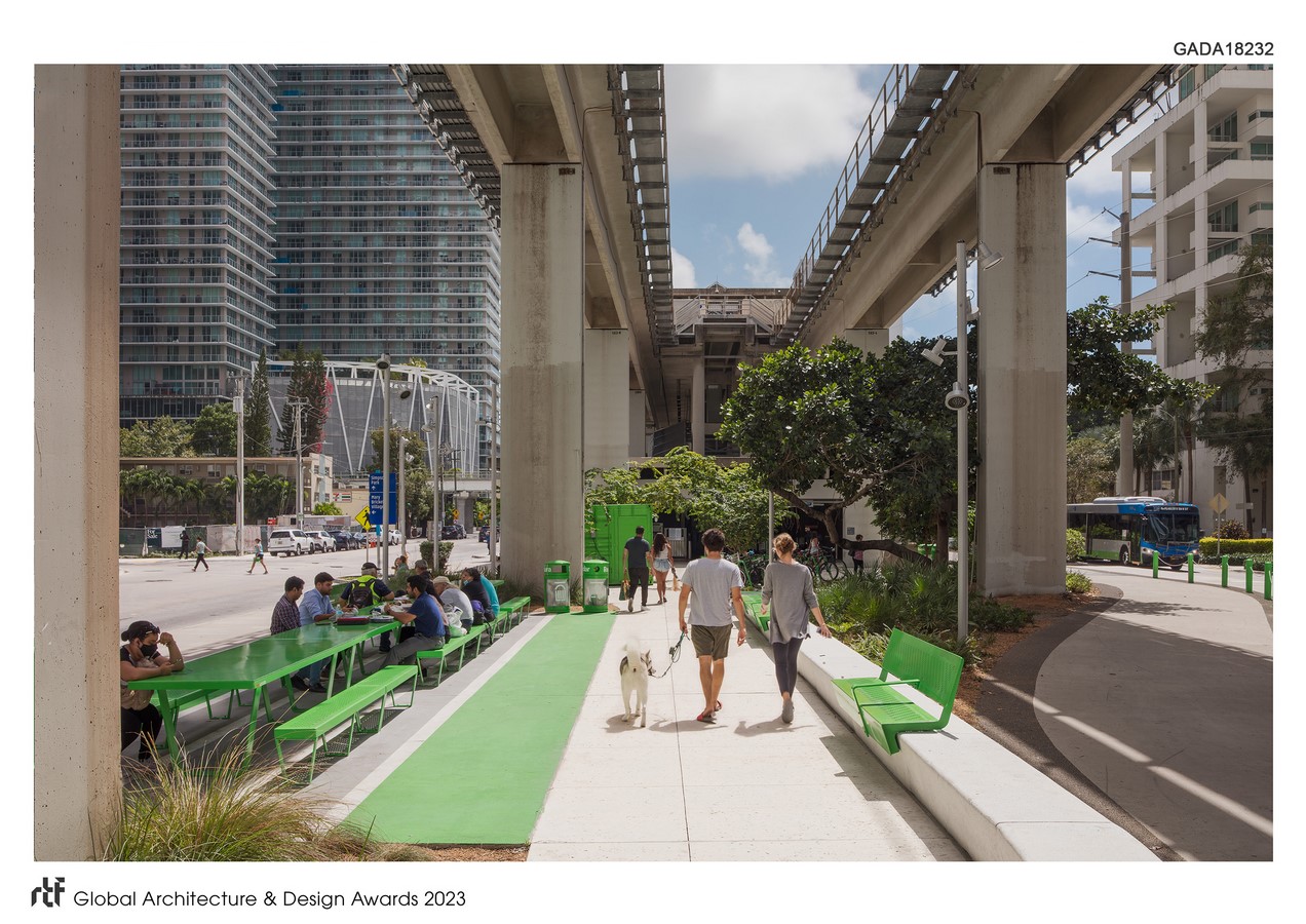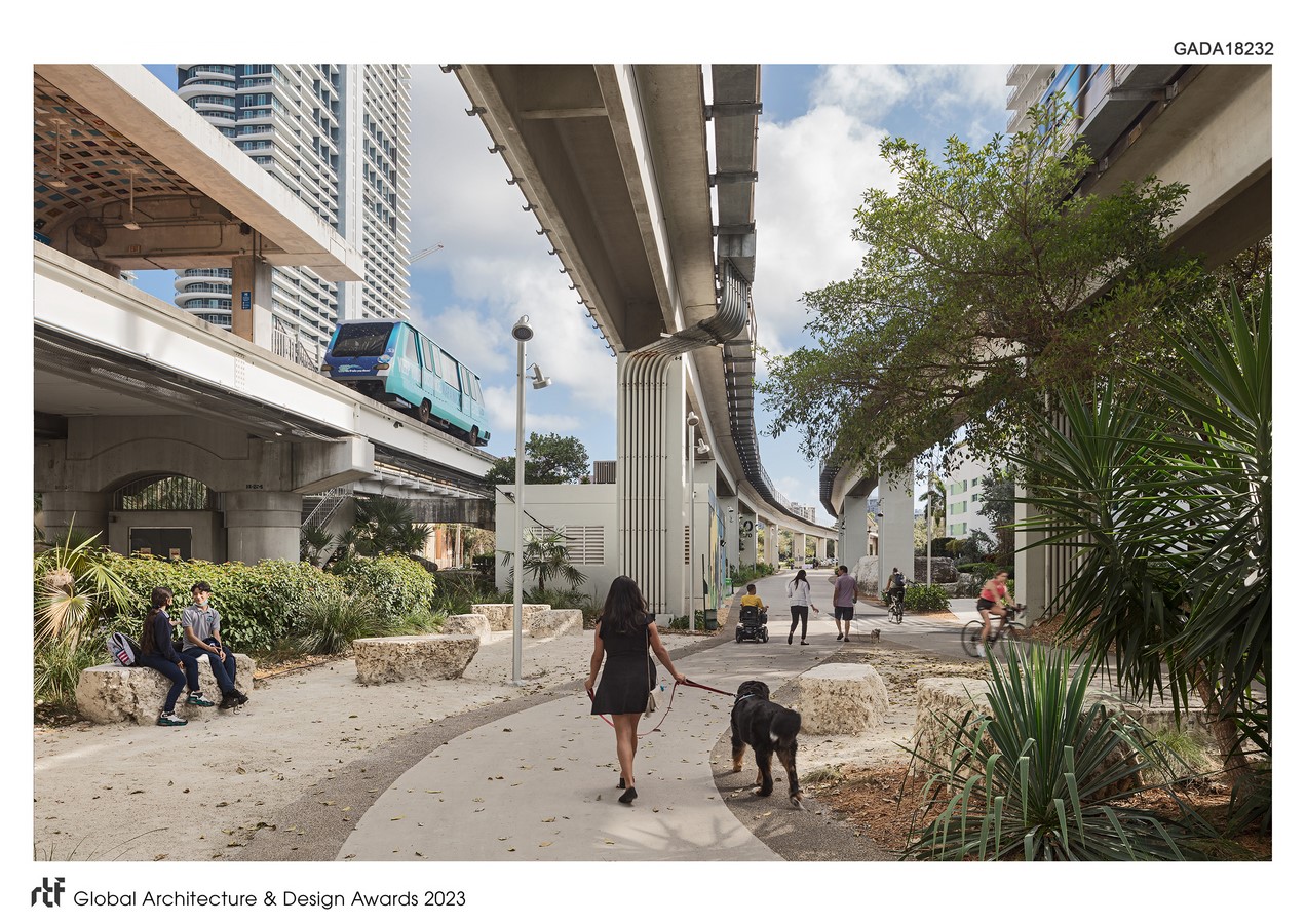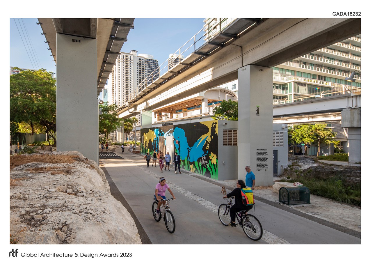 Brickell Backyard transforms the space underneath Miami’s elevated Metrorail into a lush linear park in one of Miami’s densest areas, providing a green space for the nearly 400,000 residents that live within a 10-minute walk of the park. As The Underline’s first built section, Brickell Backyard sets the tone for future phases of the 10-mile-long corridor with native gardens, improved pedestrian and bicycle pathways, and various active, passive, and cultural programs.
