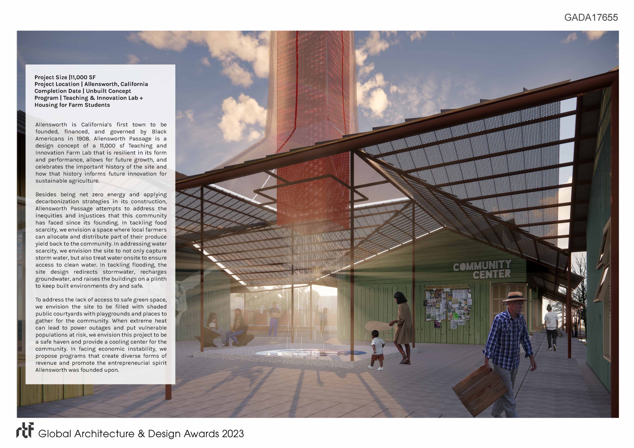 Allensworth is California’s first town to be founded, financed, and governed by Black Americans in 1908. Allensworth Passage is a design concept of a 11,000 sf Teaching and Innovation Farm Lab that is resilient in its form and performance, allows for future growth, and celebrates the important history of the site and how that history informs future innovation for sustainable agriculture.