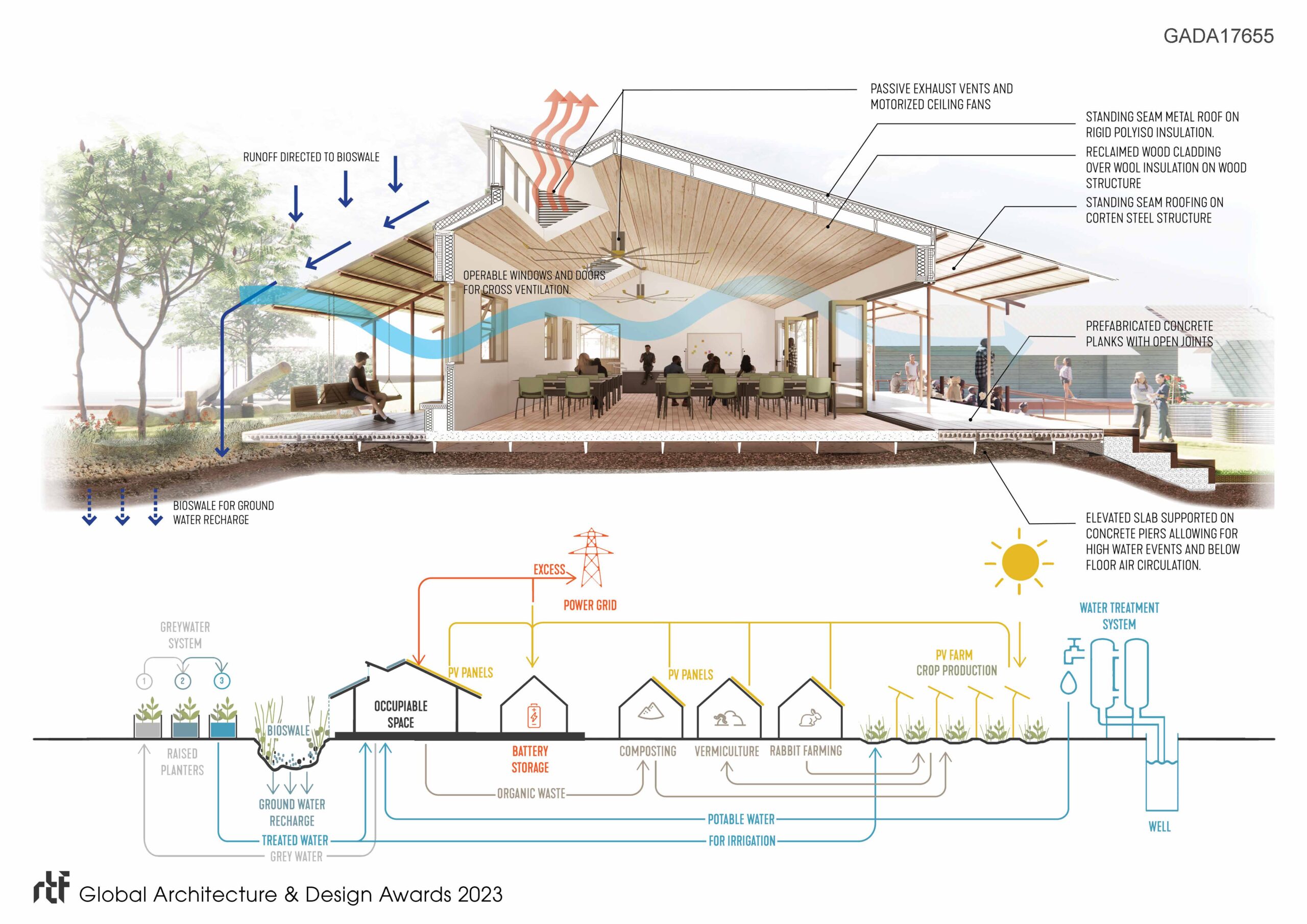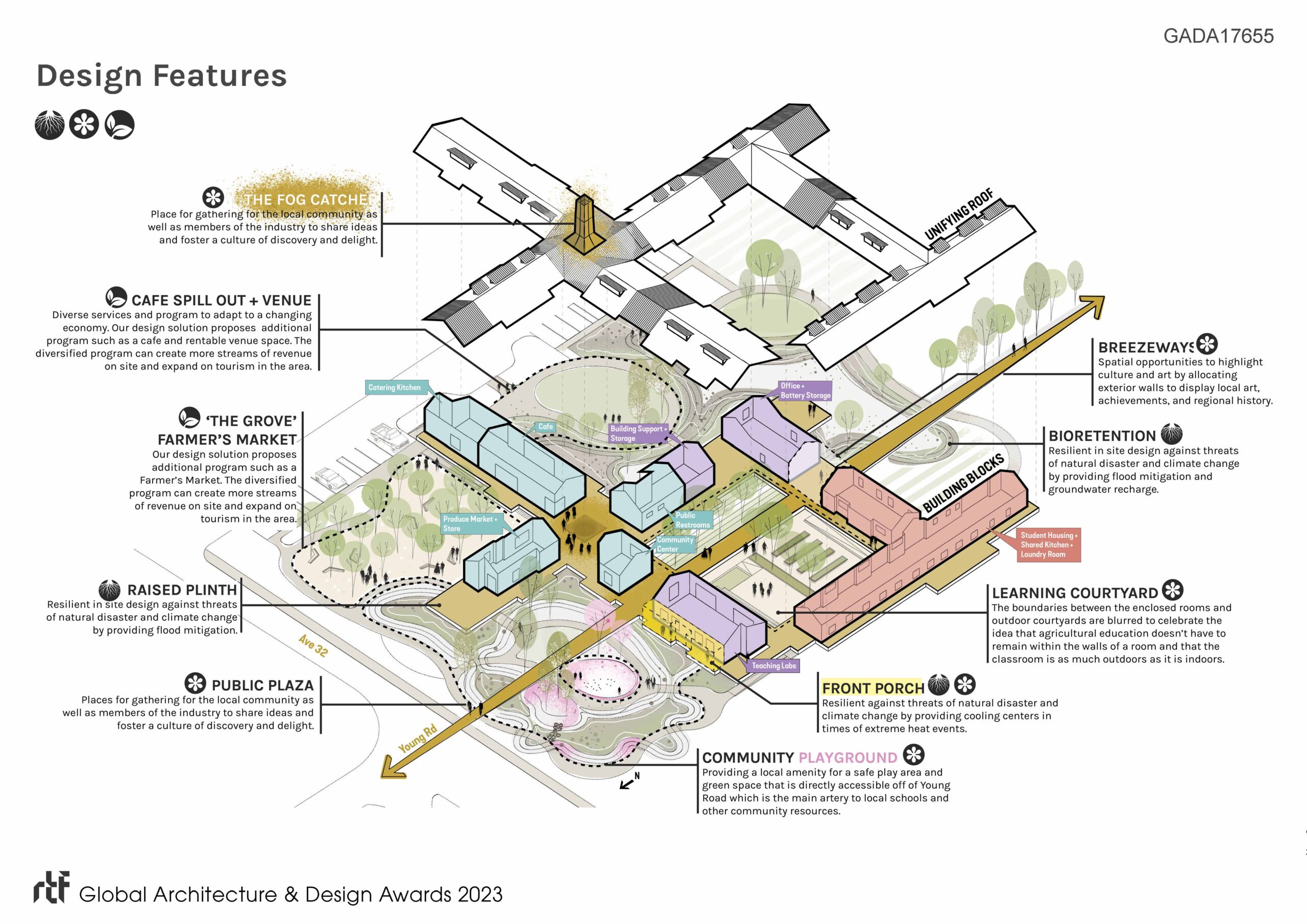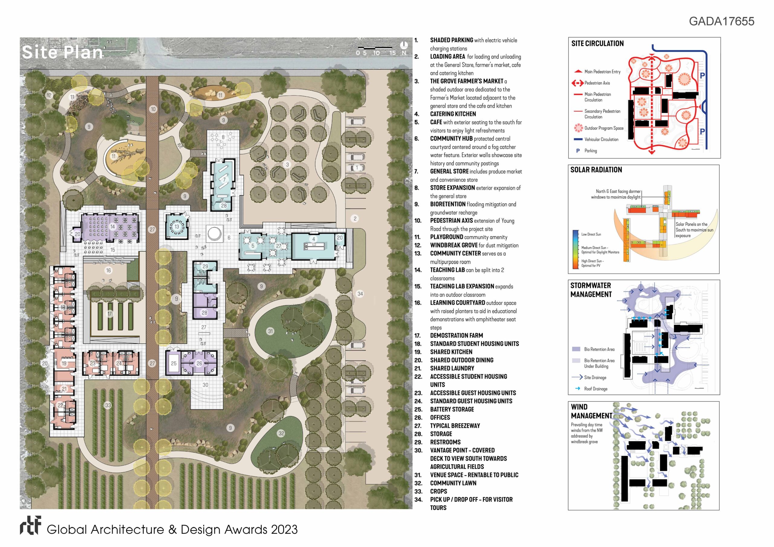 Besides being net zero energy and applying decarbonization strategies in its construction, Allensworth Passage attempts to address the inequities and injustices that this community has faced since its founding. In tackling food scarcity, we envision a space where local farmers can allocate and distribute part of their produce yield back to the community. In addressing water scarcity, we envision the site to not only capture storm water, but also treat water onsite to ensure access to clean water. In tackling flooding, the site design redirects stormwater, recharges groundwater, and raises the buildings on a plinth to keep built environments dry and safe. To address the lack of access to safe green space, we envision the site to be filled with shaded public courtyards with playgrounds and places to gather for the community. When extreme heat can lead to power outages and put vulnerable populations at risk, we envision this project to be a safe haven and provide a cooling center for the community. In facing economic instability, we propose programs that create diverse forms of revenue and promote the entrepreneurial spirit Allensworth was founded upon.