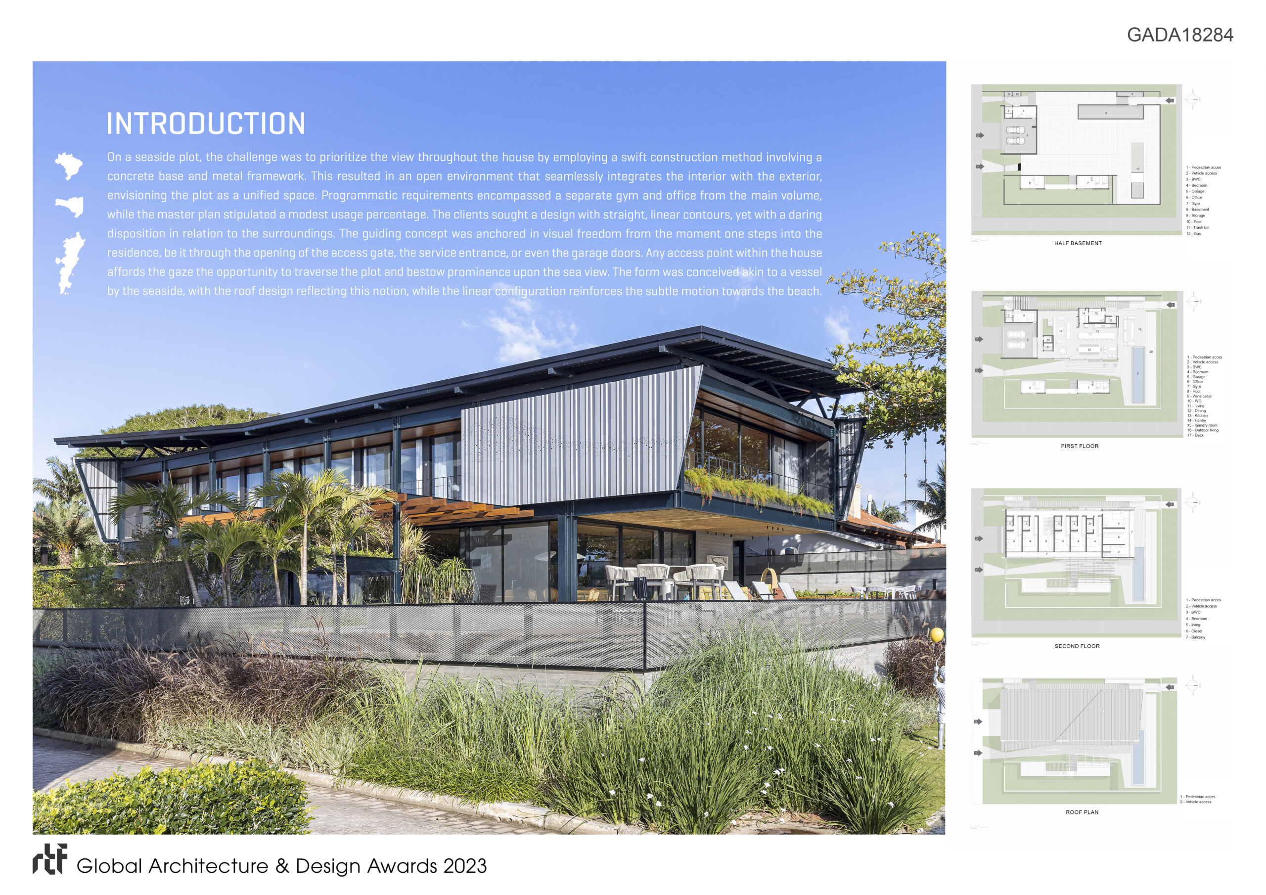 Programmatic requirements encompassed a separate gym and office from the main volume, while the master plan stipulated a modest usage percentage. The clients sought a design with straight, linear contours, yet with a daring disposition in relation to the surroundings. The guiding concept was anchored in visual freedom from the moment one steps into the residence, be it through the opening of the access gate, the service entrance, or even the garage doors. Any access point within the house affords the gaze the opportunity to traverse the plot and bestow prominence upon the sea view. The form was conceived akin to a vessel by the seaside, with the roof design reflecting this notion, while the linear configuration reinforces the subtle motion towards the beach.