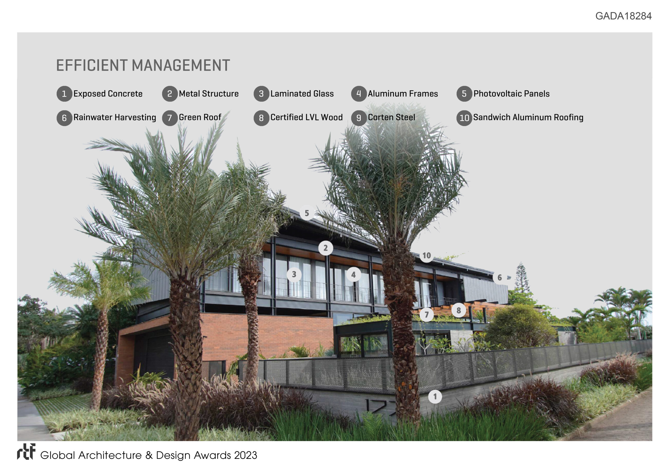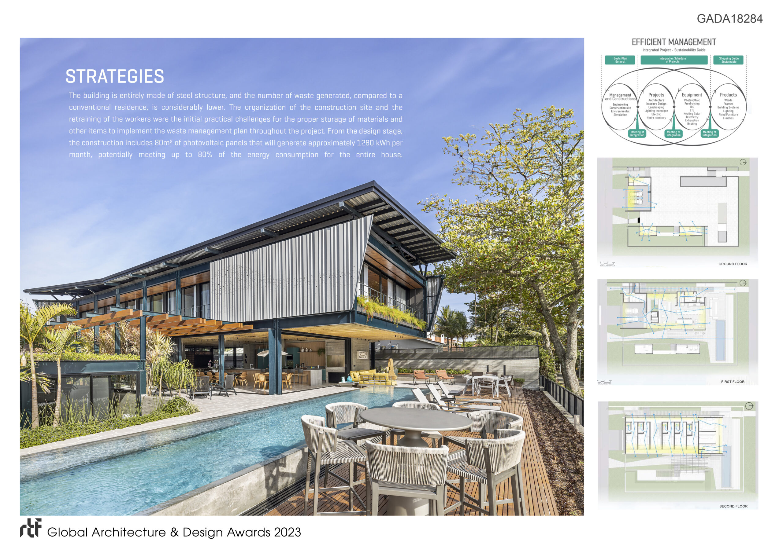 The building is entirely made of steel structure, and the number of waste generated, compared to a conventional residence, is considerably lower. The organization of the construction site and the retraining of the workers were the initial practical challenges for the proper storage of materials and other items to implement the waste management plan throughout the project. From the design stage, the construction includes 80m² of photovoltaic panels that will generate approximately 1280 kWh per month, potentially meeting up to 80% of the energy consumption for the entire house.