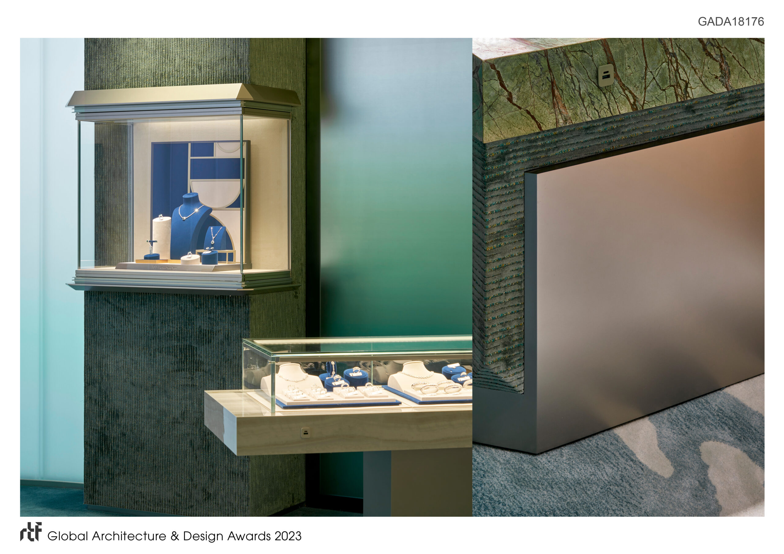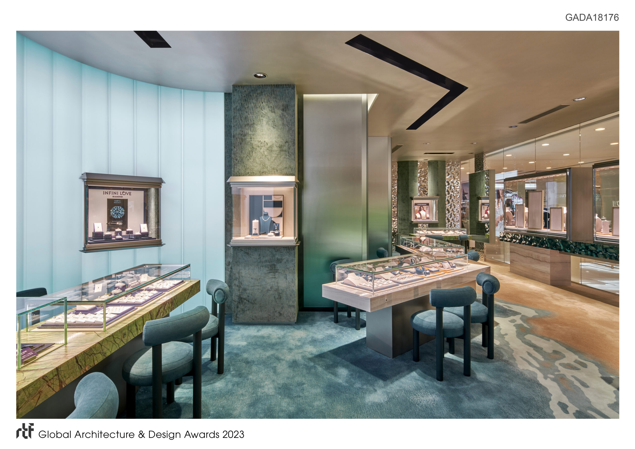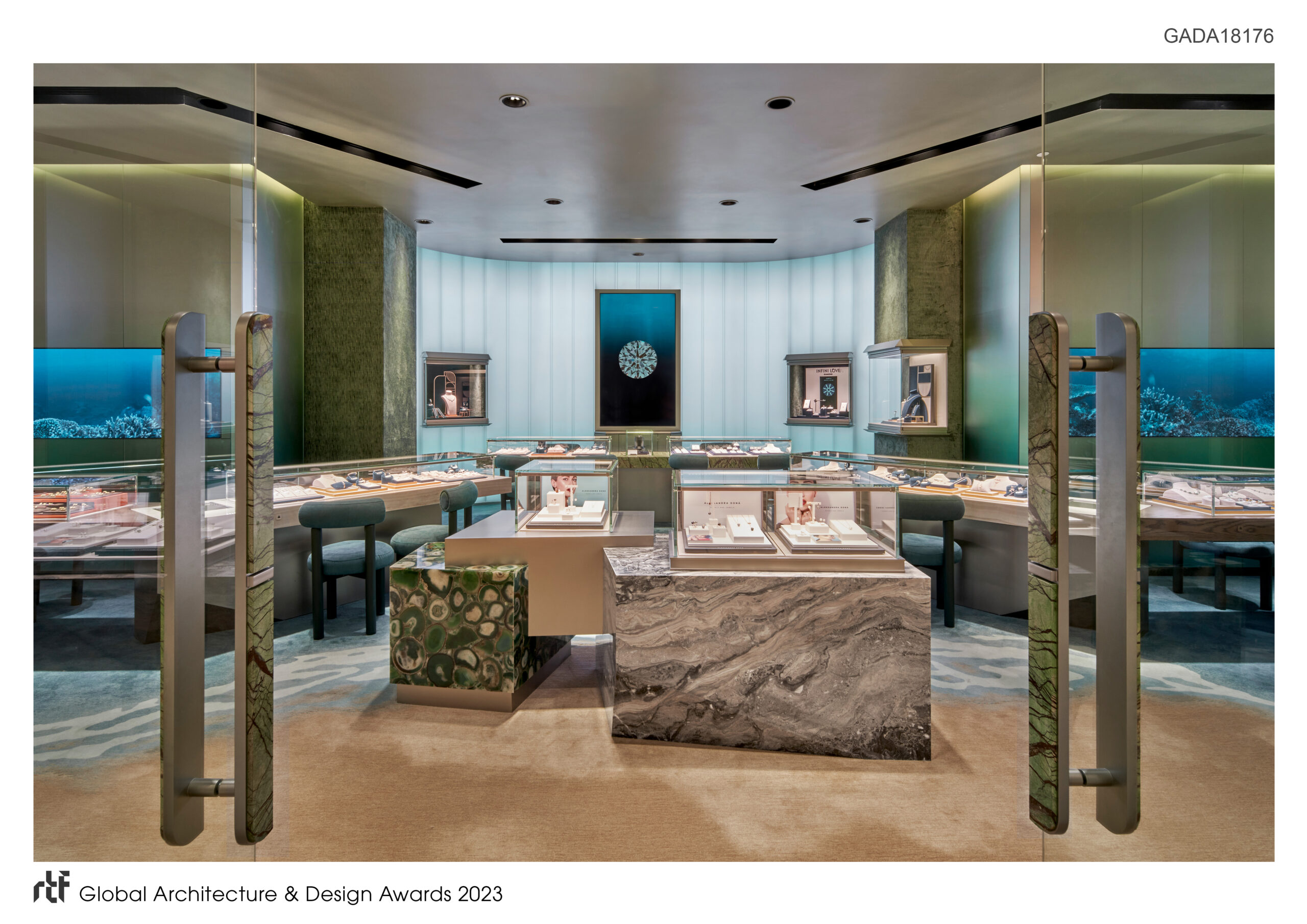 Spanning an impressive 1,700 square feet, the store’s design revolves around the notion of simplicity and geometric forms, echoing the essence of a treasure box while exuding an eye-catching minimalist aesthetic. As guests enter the store, they are immediately captivated by the mesmerizing center display fixtures crafted with exquisite green agate and sleek grey marble. These fixtures, reminiscent of treasures washed ashore, offer an abstract yet natural representation of the surrounding environment. Adjacent to the fixtures, a series of illuminated U-shaped glass walls showcase diamonds on display monitors, evoking a sense of mystery and anticipation as if the diamonds were being revealed from enigmatic boxes.