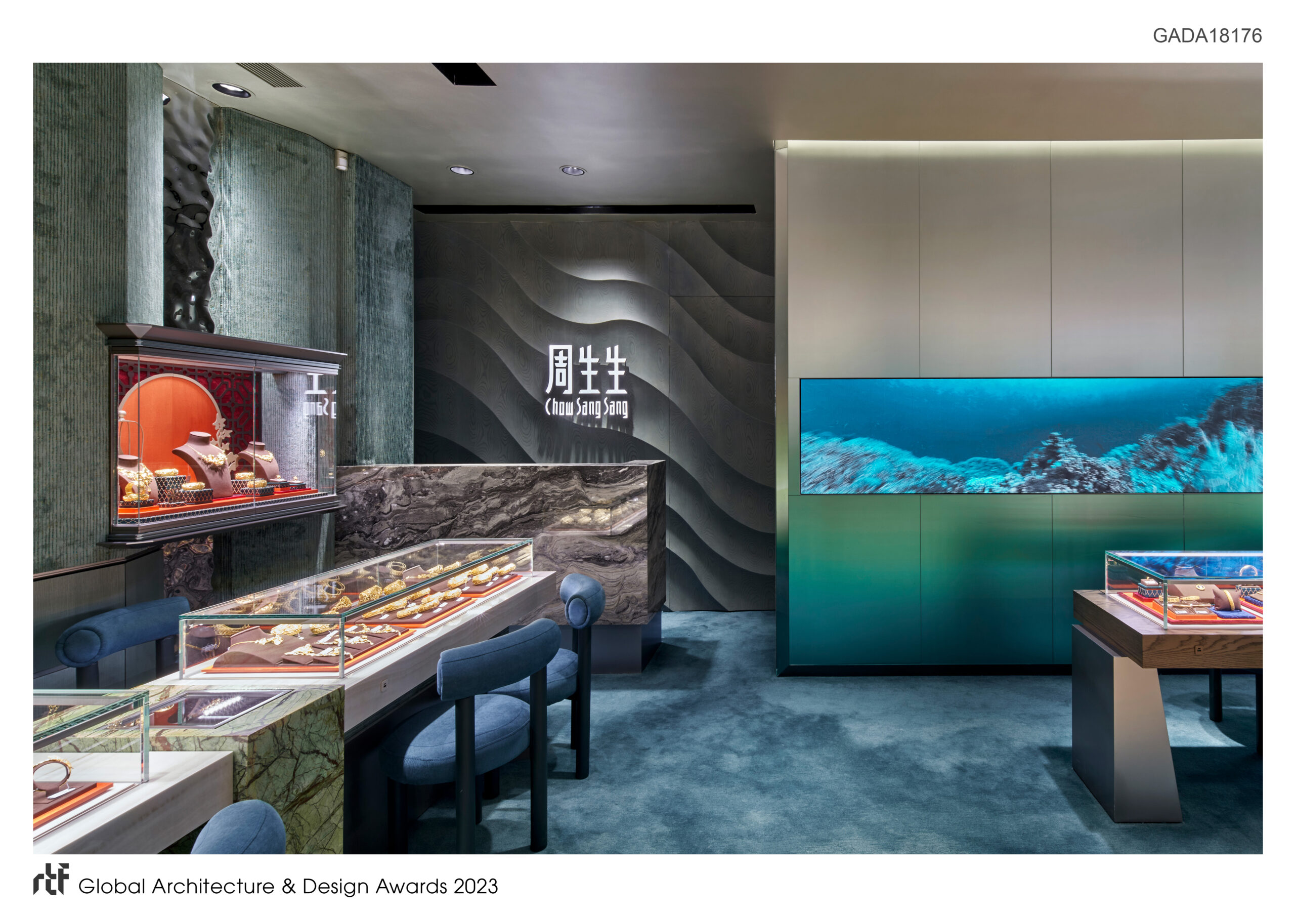 The design of the store draws inspiration from the journey of the treasure box, which has long been concealed and forgotten due to urban reclamation around Victoria Harbour and the formal waterfront reclamation that began in 1851. The abstract form and pattern of the undiscovered box are incorporated into the design, symbolizing its transformation over time. The use of a gradient mineral blue palette throughout the store subtly alludes to the depths of the ocean, situated in the vibrant location, adjacent to the picturesque Victoria Harbour, aims to redefine the jewellery retail experience by unveiling the hidden treasures of the ocean. This innovative concept store seeks to pioneer a new chapter in the jewellery industry, seamlessly merging sustainability and aesthetics to create an unforgettable and immersive retail environment. Drawing inspiration from the intriguing history of Victoria Harbour, particularly the stranded treasure box from the 1850s, the store embarks on a captivating journey of discovery and unboxing.