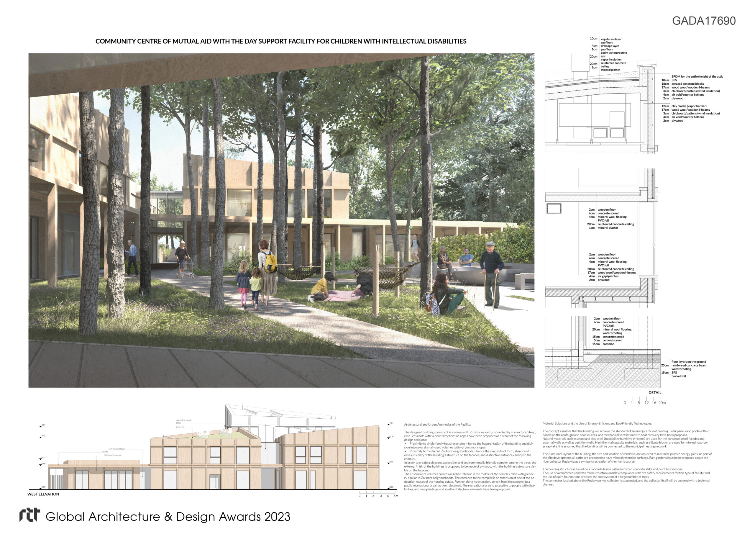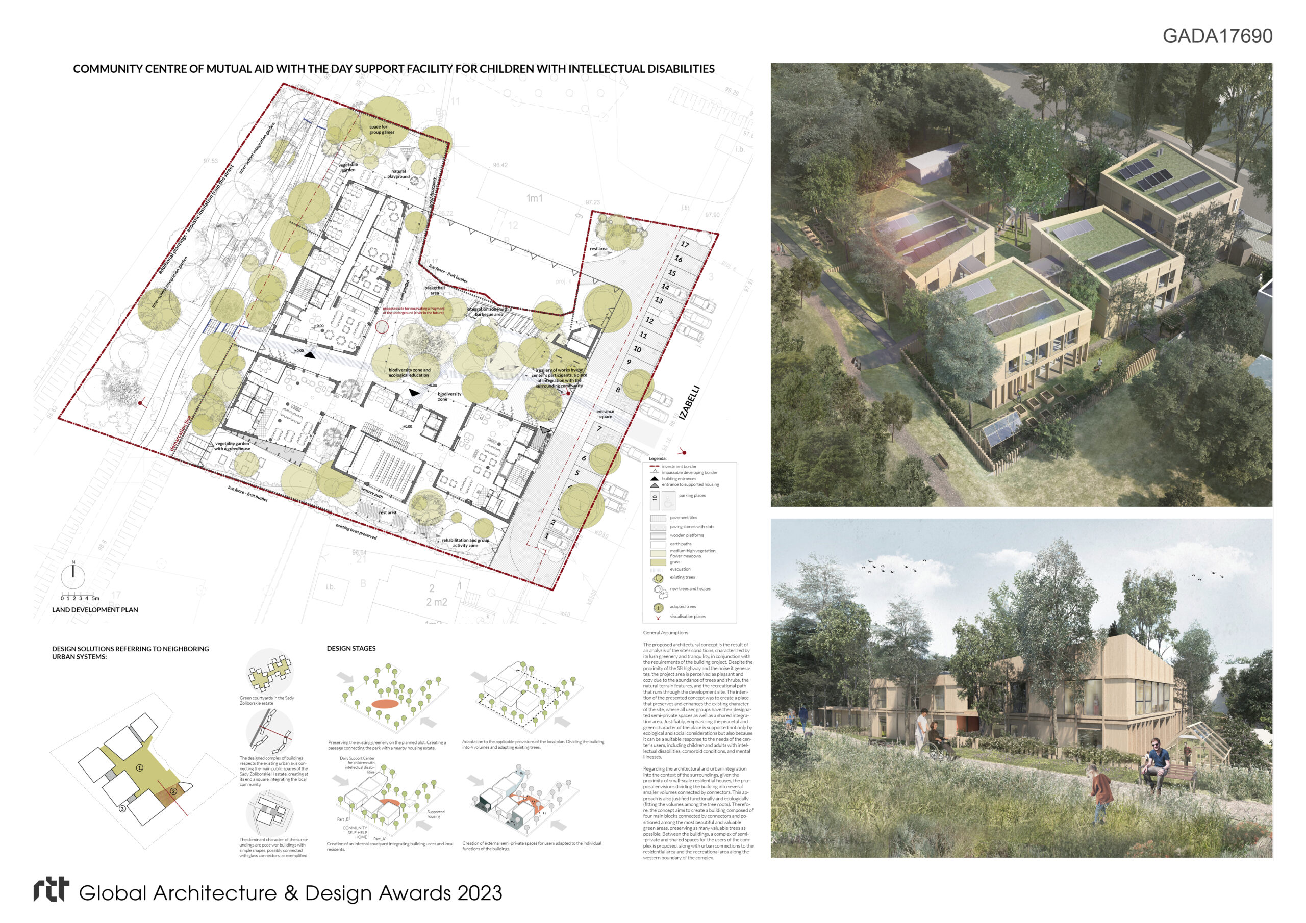 The intention of the presented concept was to create a place that preserves and enhances the existing character of the site, where all user groups have their designated semi-private spaces as well as a shared integration area. Justifiably, emphasizing the peaceful and green character of the place is supported not only by ecological and social considerations but also because it can be a suitable response to the needs of the center’s users, including children and adults with intellectual disabilities, comorbid conditions, and mental illnesses.