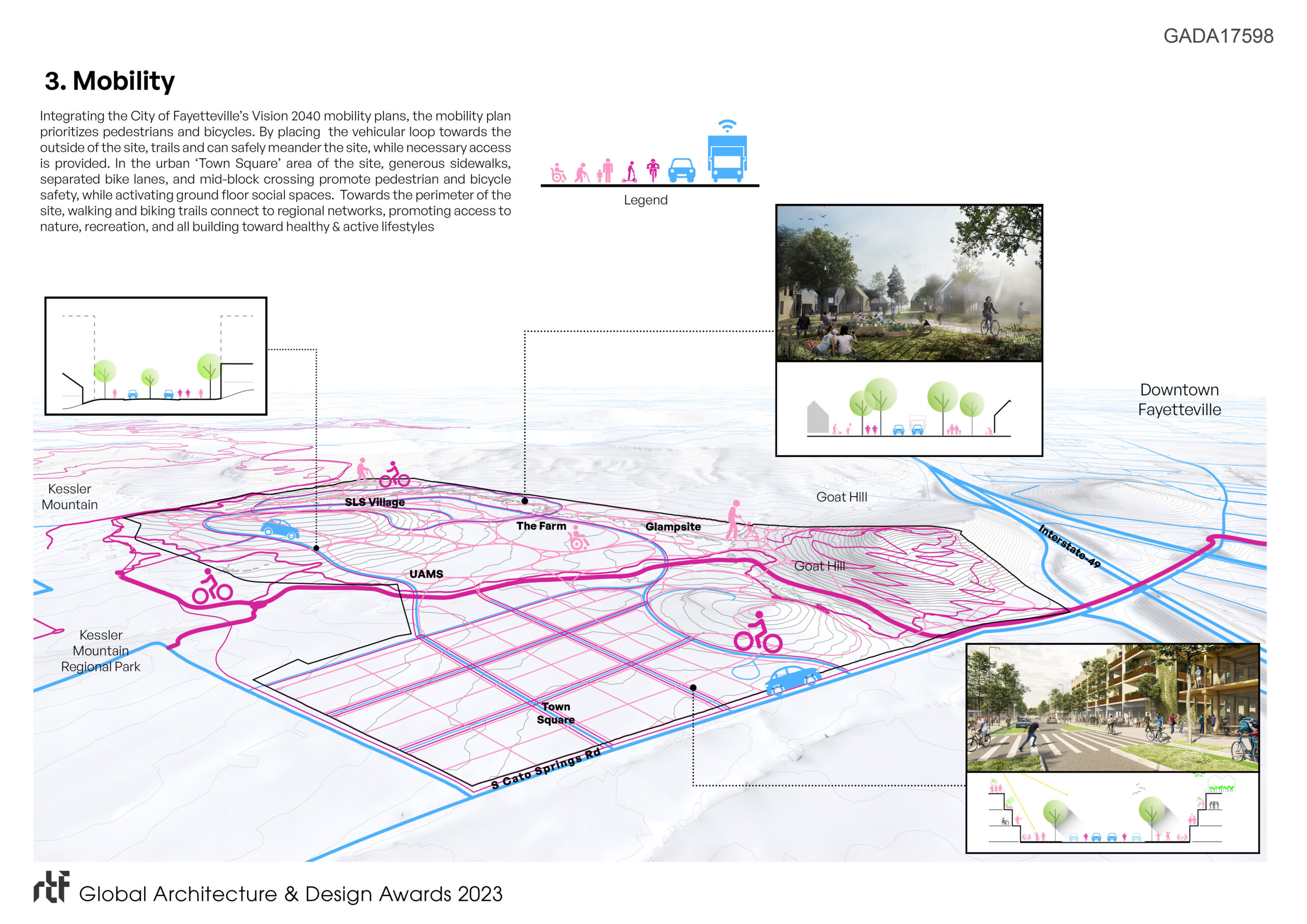 Mobility is key to providing an environment of accessibility, health, and connection. The plan expands upon the City of Fayetteville’s Vision 2040 mobility plans, by prioritizing walking and biking, and minimizing the presence of cars. By placing the vehicular loop towards the outside of the site, trails safely meander the site, while necessary access is provided. In the urban ‘Town Square’ area of the site, generous sidewalks, separated bike lanes, and mid-block crossing promote pedestrian and bicycle safety, while activating ground floor social spaces. Towards the perimeter of the site, walking and biking trails connect to regional networks, promoting access to nature, recreation, and building healthy lifestyles.