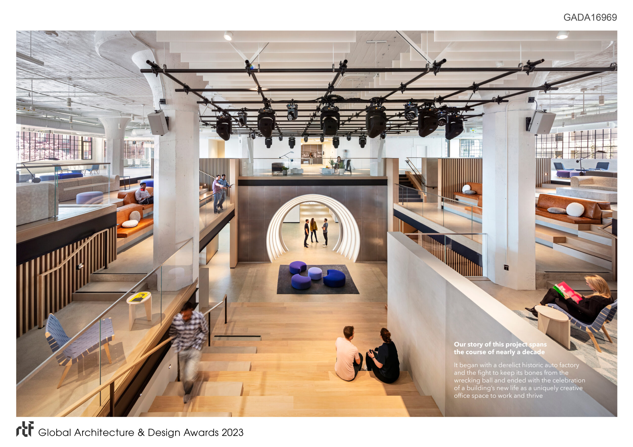 Our story of this project spans the course of nearly a decade. It began with a derelict historic auto factory and the fight to keep its bones from the wrecking ball and ended with the celebration of a building’s new life as a uniquely creative office space to work and thrive.