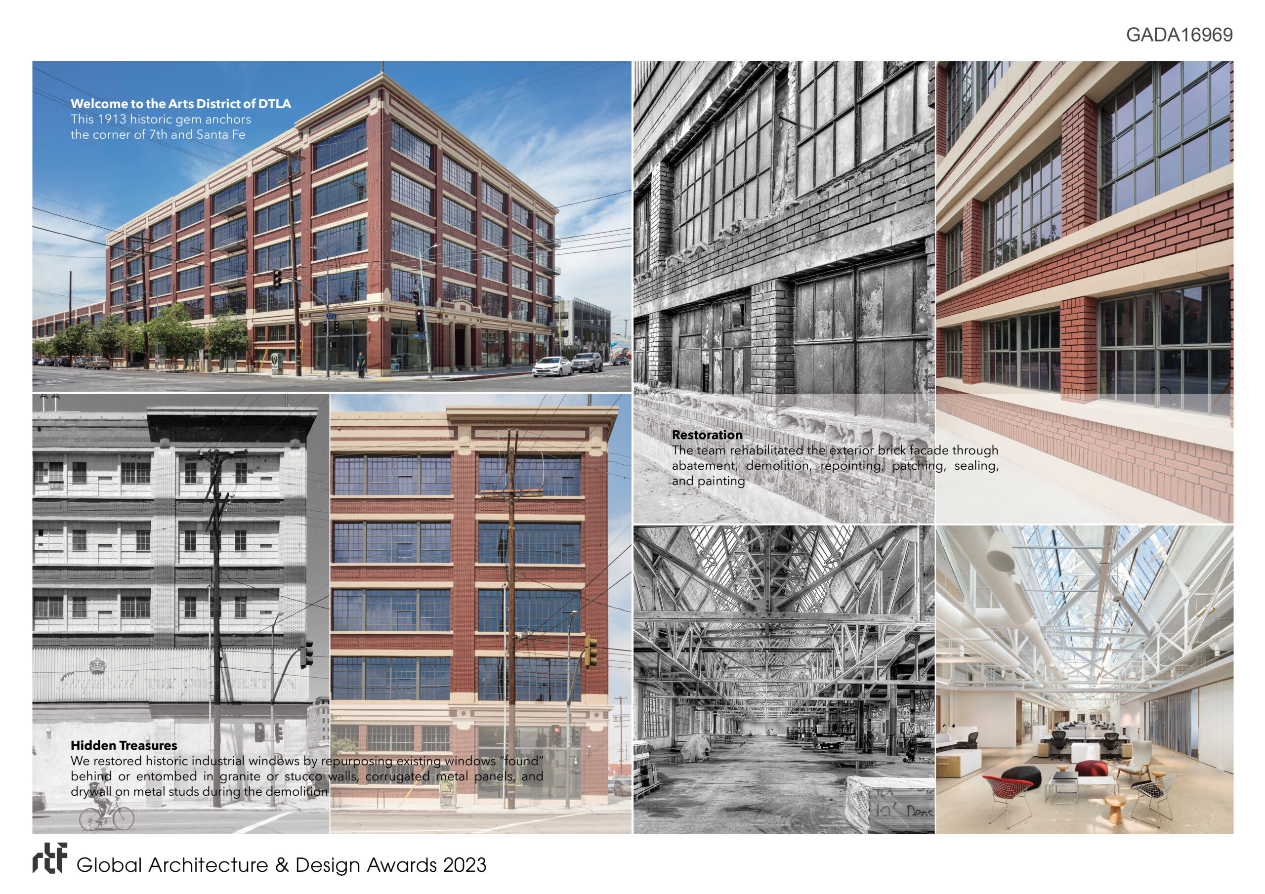 Located in the Arts District neighborhood of downtown Los Angeles, the Ford Motor Company Factory building was initially built as a five-story office tower and Model T showroom (1913) and a two-story, nearly 300 ft long factory Assembly Building (1923). It was designed by John Parkinson, one of LA’s most prolific architects responsible for designing the Los Angeles Memorial Coliseum and iconic Los Angeles City Hall, and George Bergstrom, who later designed the Pentagon. In the 1980s, a simple two-story masonry structure was added at the very end of the Assembly Building to infill the site. The building later hosted several other tenants and, over time, fell into disrepair and neglect.