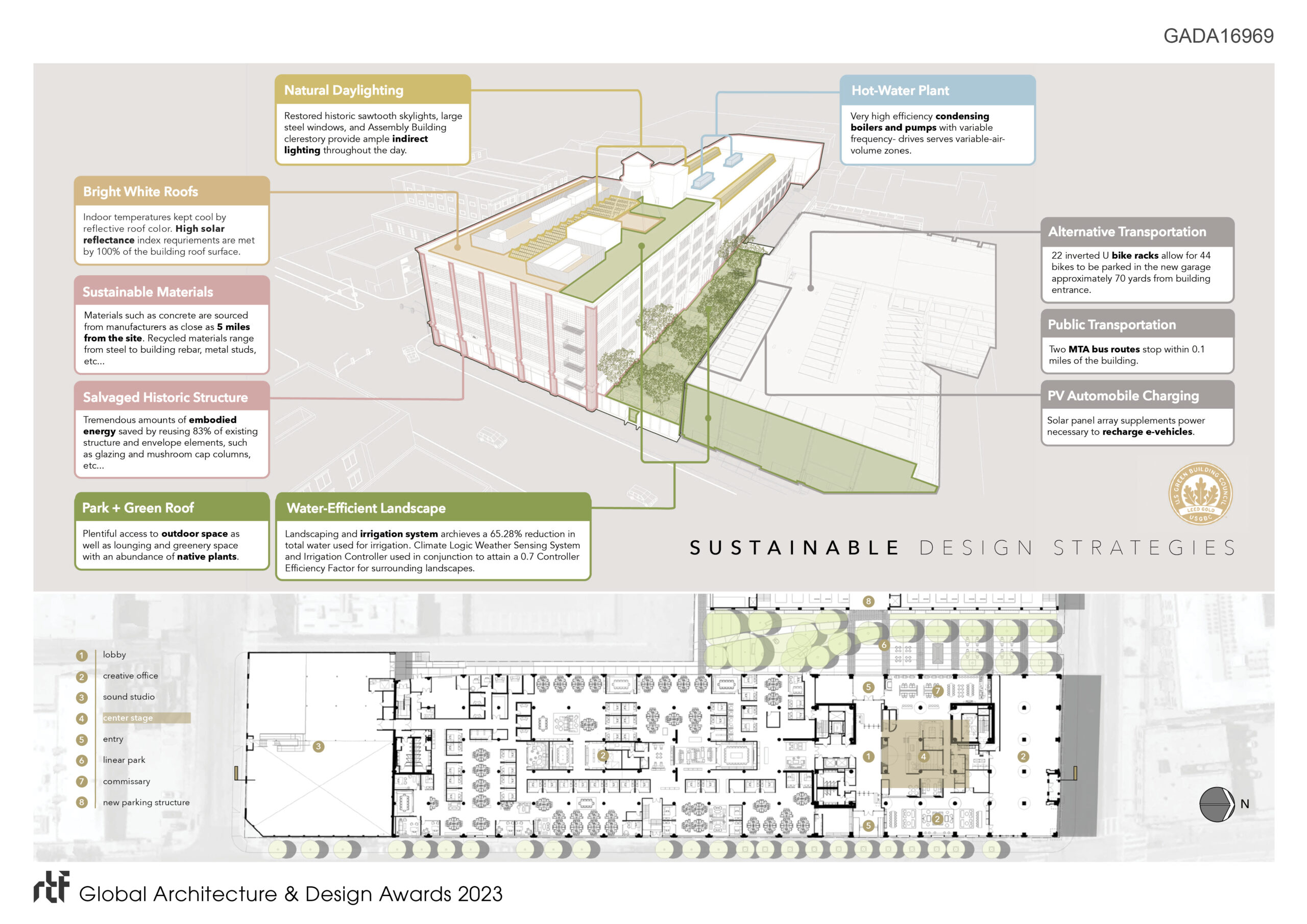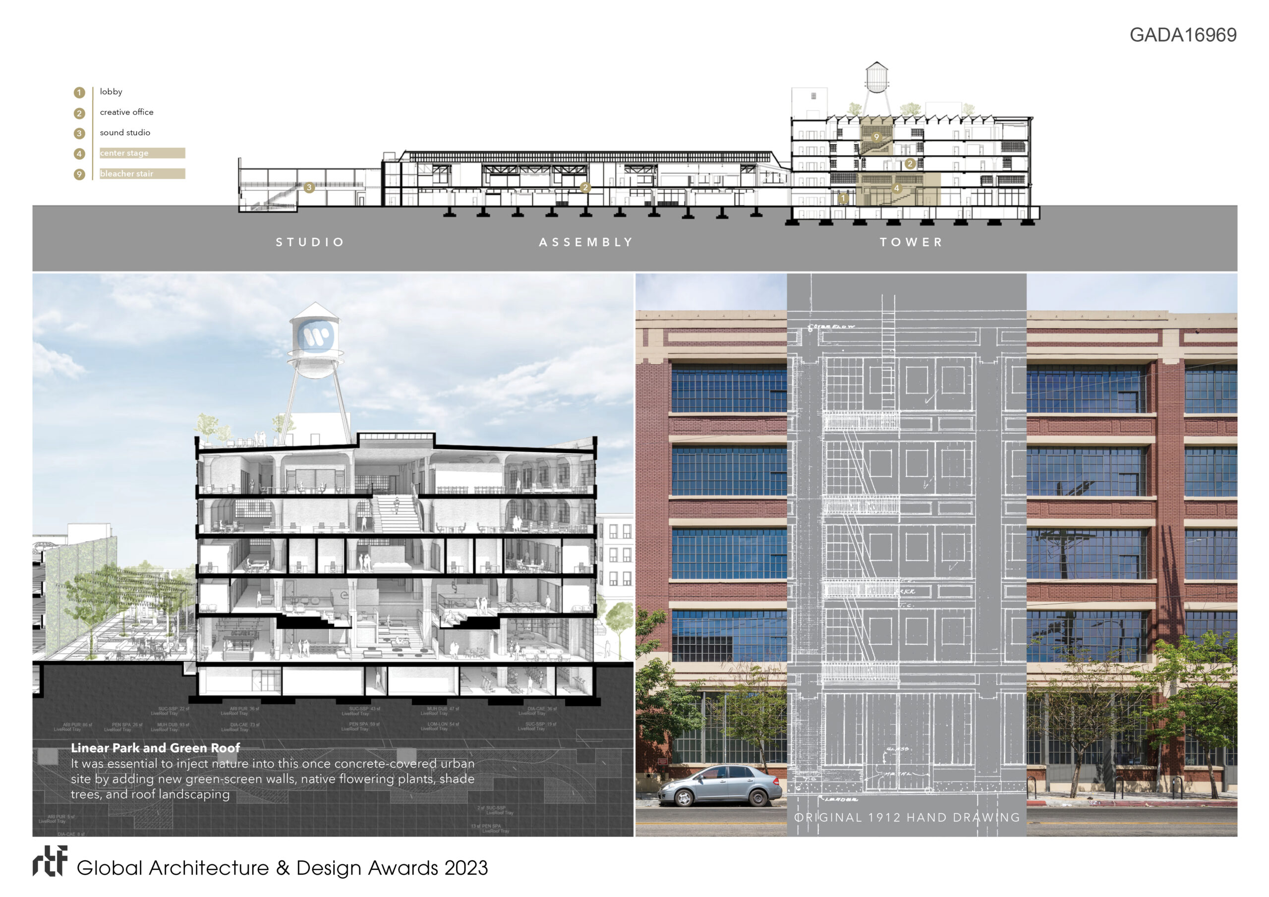 In 2014 our first objective was to preserve the historic architectural fabric and restore the building to a usable state. It included modernizing the building with critical infrastructure updates and making it as energy efficient as possible. Additionally, we created an outdoor linear park and a natural green roofscape. Restoring the building rather than demolishing it resulted in enormous (embodied) energy savings while preserving a Los Angeles architectural icon.