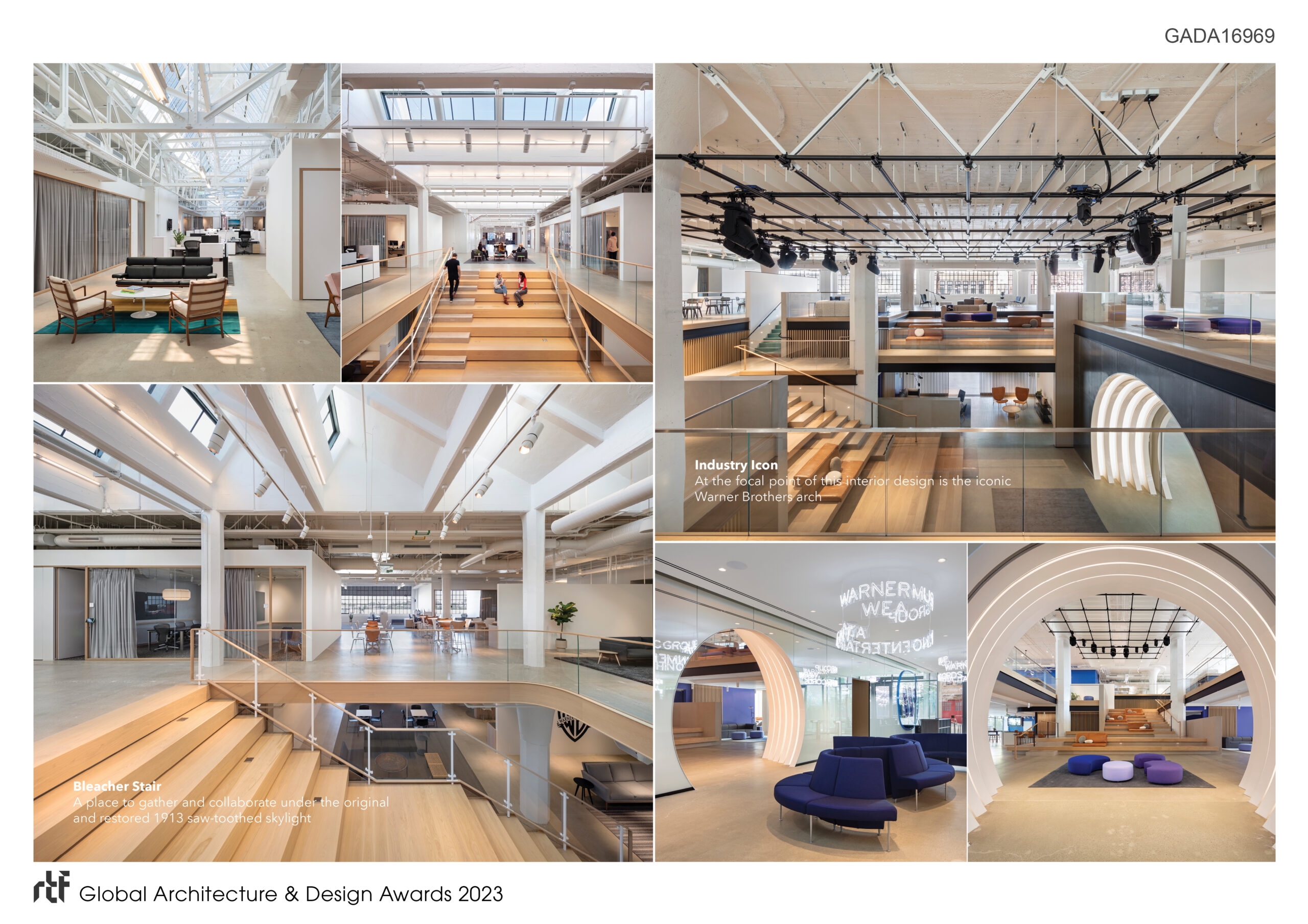 The project team’s second objective brought this building back to life as creative office space for Warner Music Group as their new headquarters. The historic building and its original (newly restored) daylighting strategies were exploited to help create an open, bright, and spacious work environment. Likewise, the design team strategically cut floor openings at two locations of the Tower. One, to create a Center Stage for WMG music performances and corporate gatherings. The other, beneath the historic saw-toothed skylight and its natural daylight to connect the two floors with a Bleacher Stair for communal gathering and collaboration.