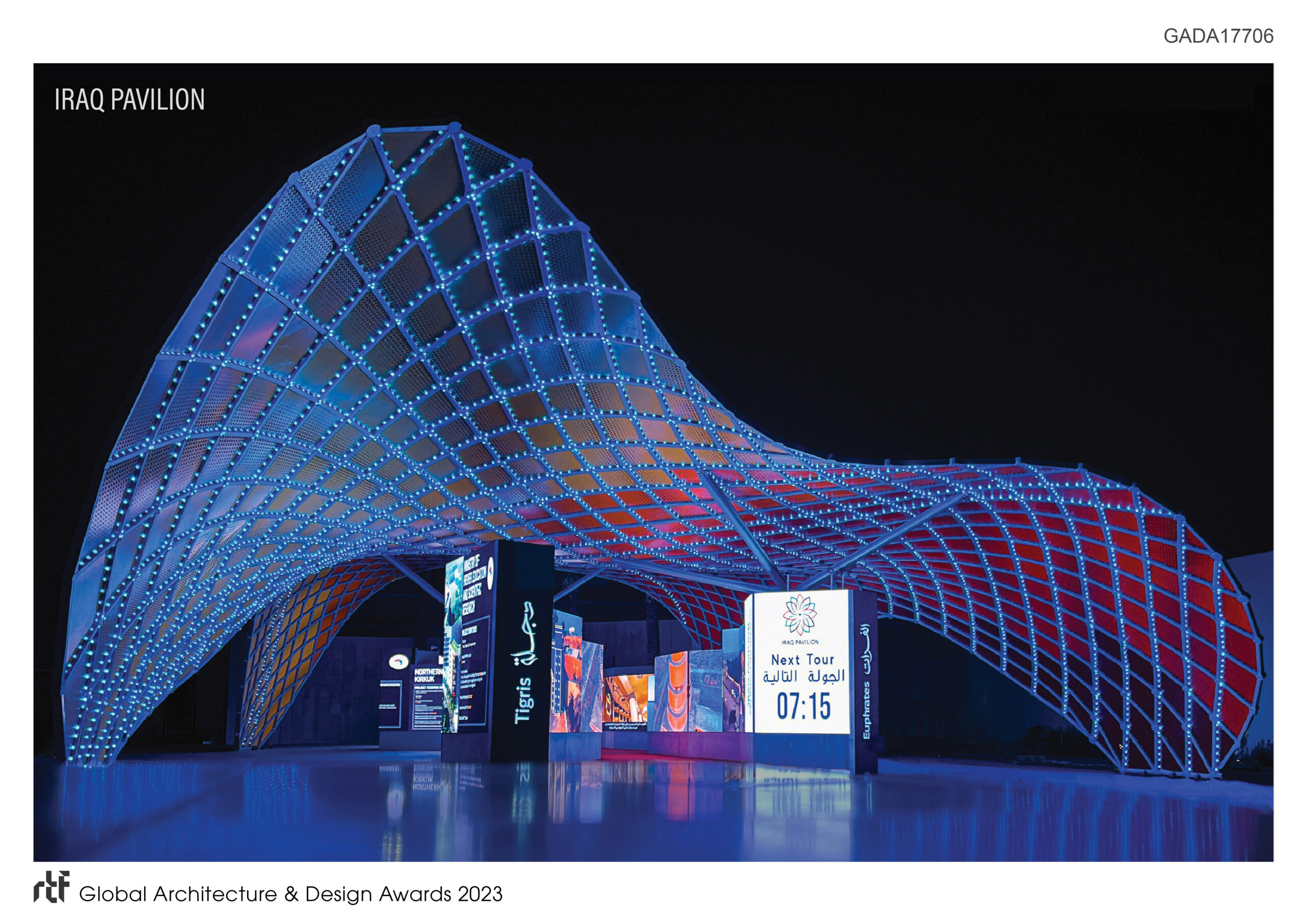 The shell structure hovers over two media walls incorporated to outline the pattern of the two major rivers in Iraq, the Tigris and Euphrates. While traveling down the river, the visitor experience was designed to create engagement with the rich history of Mesopotamian culture through film. Further, as one traveled around the rivers, the display showcased future possibilities for Iraq, promoting business collaboration, opening up development opportunities, and building relationships on a global level.