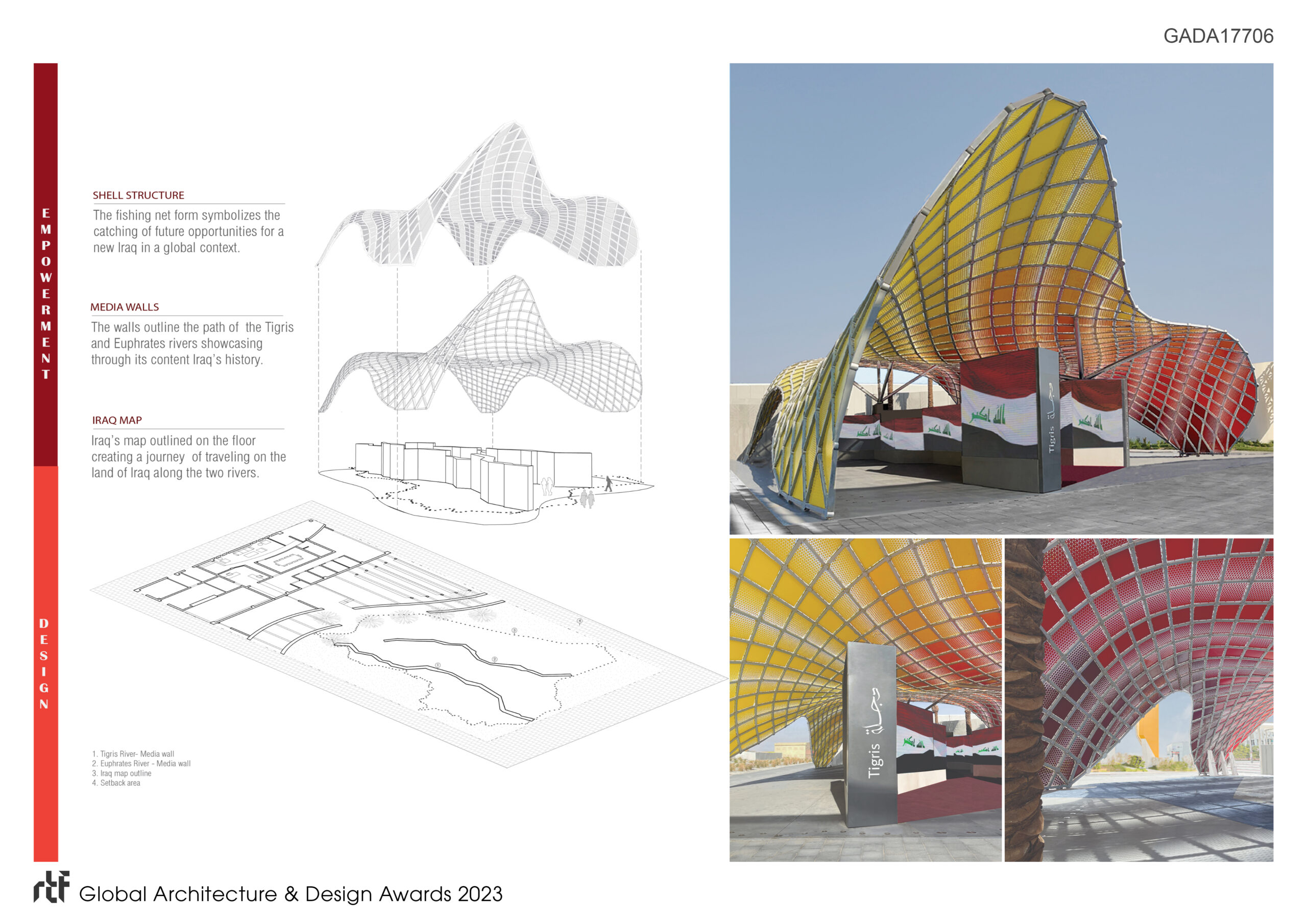 Al Saliya, a traditional fishing net symbolizing wealth, wisdom, and goodness in Mesopotamian culture, inspired the shell structure of the Iraq Pavilion. The design embodies the organic, flowing form of the net-casting technique, symbolizing the capture of future opportunities for a new Iraq in a global development context.
