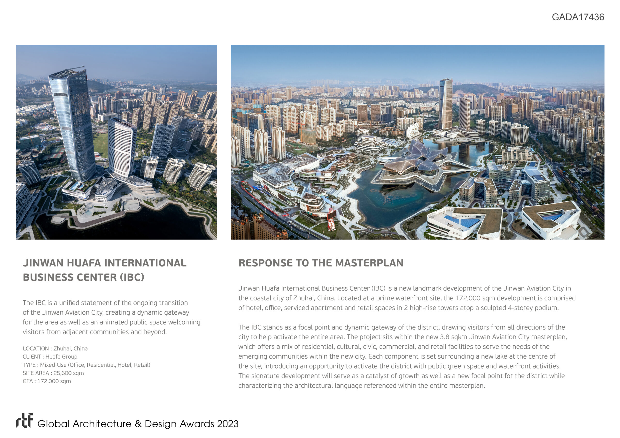 Jinwan Huafa International Business Center(IBC) is a new landmark development of the Jinwan Aviation City in the coastal city of Zhuhai, China. Located at a prime waterfront site, the 172,000sqm development is comprised of hotel, office, serviced apartment and retail spaces in 2 high-rise towers atop a sculpted 4-storey podium.The IBC stands as a focal point and dynamic gateway of the district, drawing visitors from all directions of the city to help activate the entire area.