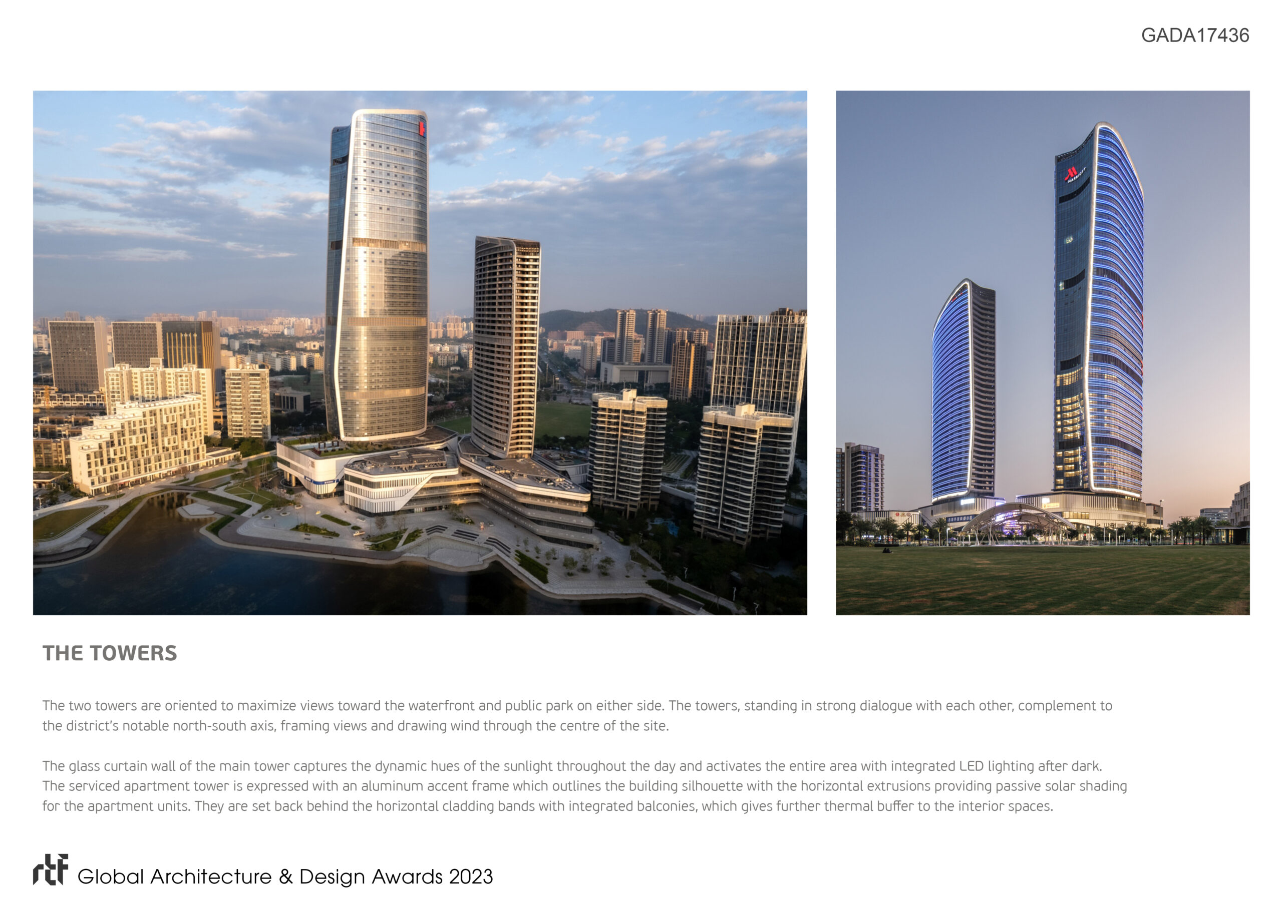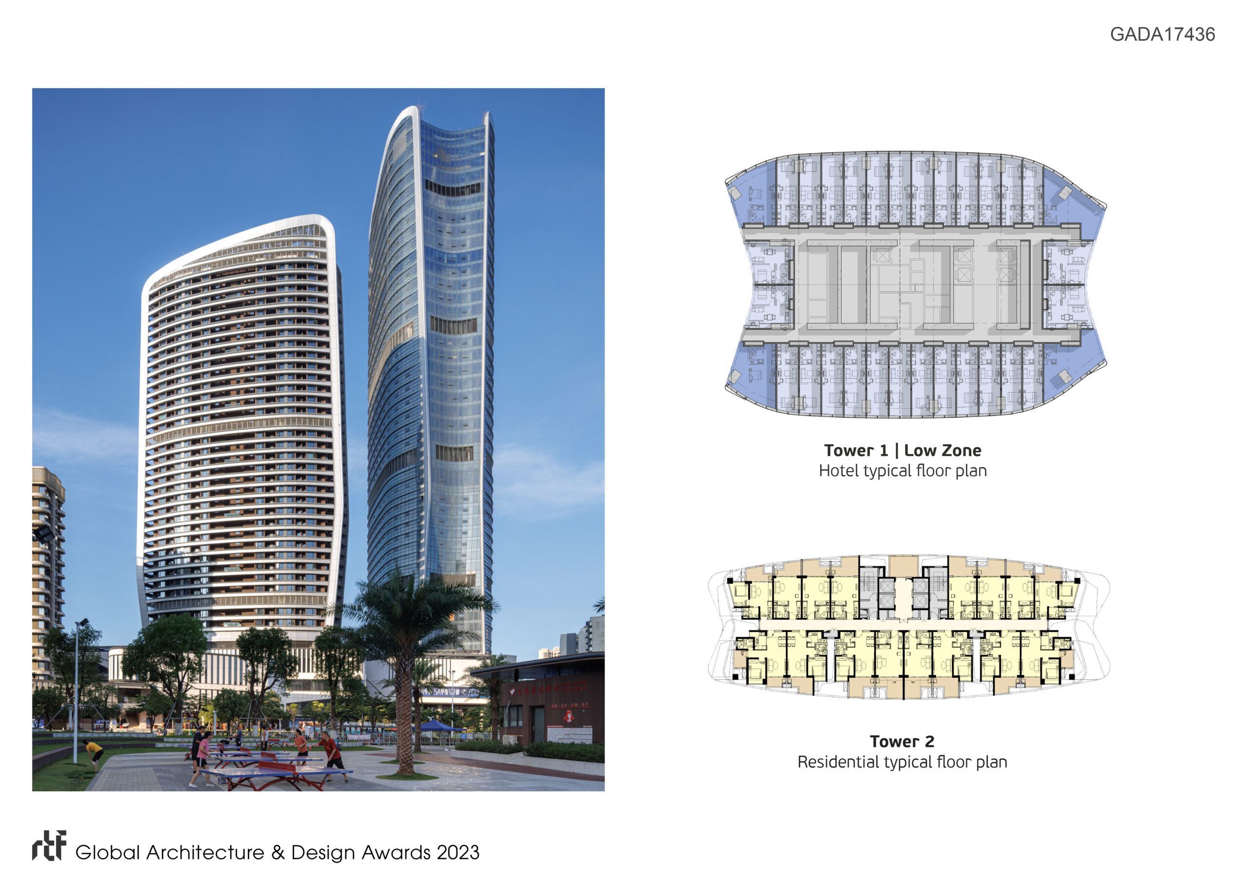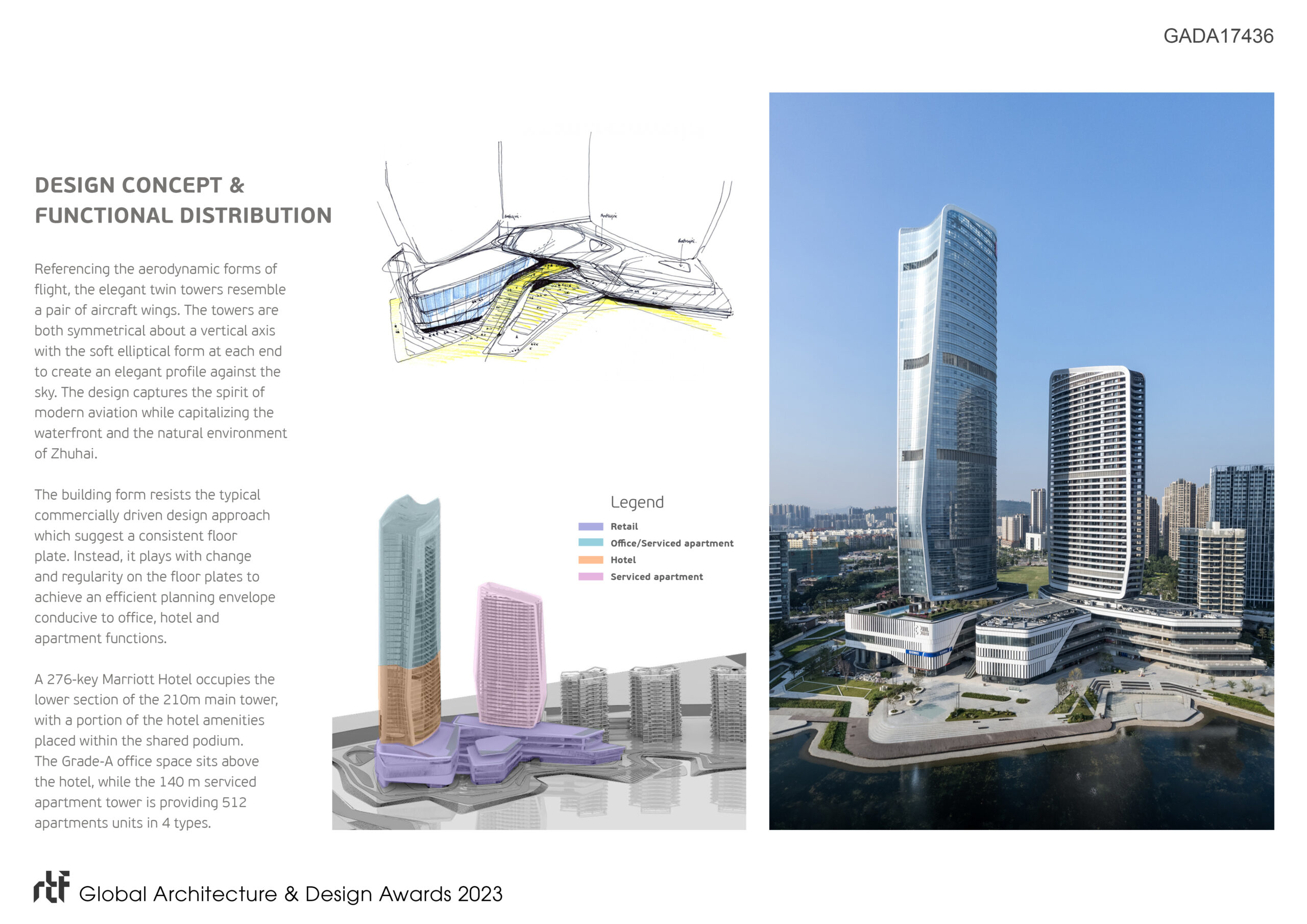 Referencing the aerodynamic forms of flight, the elegant twin towers resemble a pair of aircraft wings. The towers are both symmetrical about a vertical axis with the soft elliptical form at each end to create an elegant profile against the sky. The building form resists the typical commercially driven design approach which suggest a consistent floor plate. Instead, it plays with change and regularity on the floor plates to achieve an efficient planning envelope conducive to office, hotel and apartment functions.