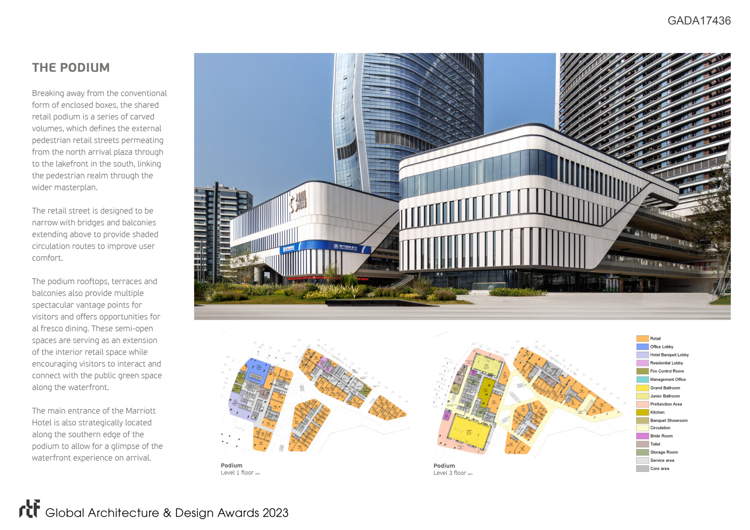 The podium rooftops, terraces and balconies also provide multiple spectacular vantage points for visitors and offers opportunities for al fresco dining. These semi-open spaces are serving as an extension of the interior retail space while encouraging visitors to interact and connect with the public green space along the waterfront.