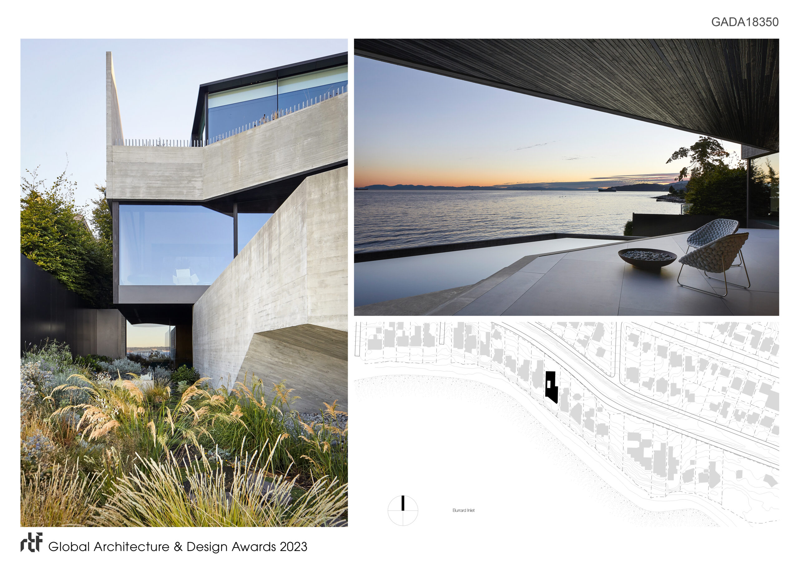 The project site straddles the interstice between a suburban neighbourhood and West Vancouver’s stony seashore. Positioned on an expanded border between land and sea, the building form references the creatures that occupy this interstitial territory, whose physiology has adapted to such challenging conditions. In the same spirit, the house establishes itself in concrete, stained Accoya wood, and aluminum plate—enduring materials that can resist the battering effect of a shore environment.