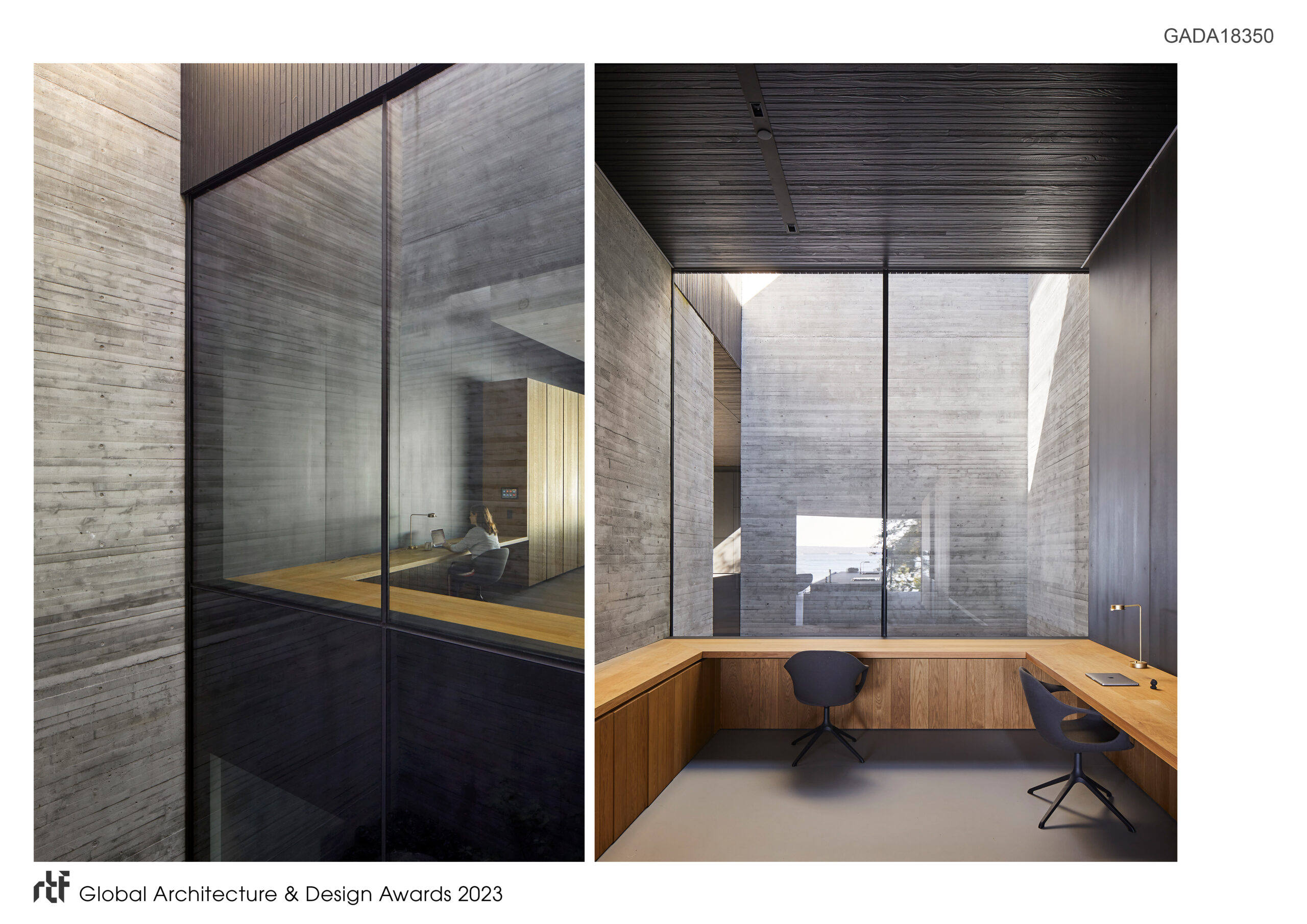 The changing outdoor atmosphere at the shore not only animates the house, but is in turn animated by the house. Views are framed between solid walls and walls of glass—their images duplicated by a dark pool at the edge of the property and by the glazing of internal courtyards. Reflections and refractions of the outdoors evoke a feeling of being neither here nor there, but somewhere in between.
