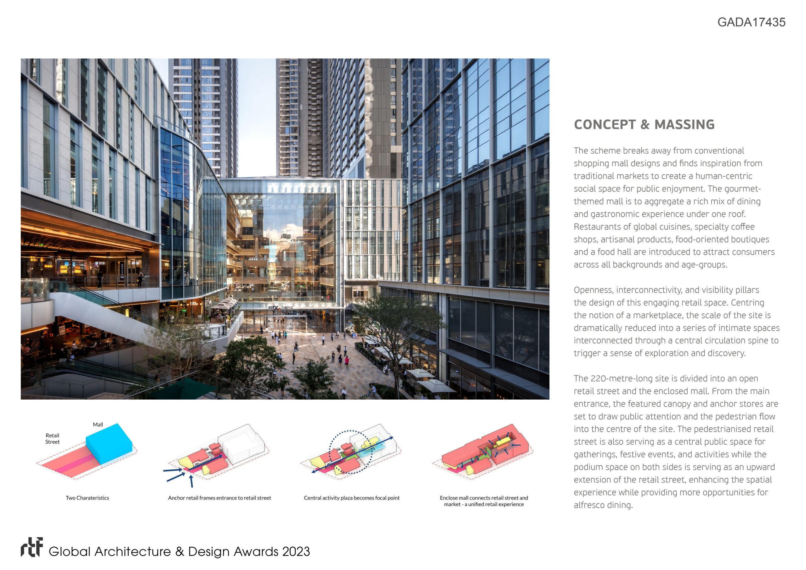 The scheme breaks away from conventional shopping mall designs and finds inspiration from traditional markets to create a human-centric social space for public enjoyment. The gourmet-themed mall is to aggregate a rich mix of dining and gastronomic experience under one roof. Restaurants of global cuisines, specialty coffee shops, artisanal products, food-oriented boutiques and a food hall are introduced to attract consumers across all backgrounds and age-groups.