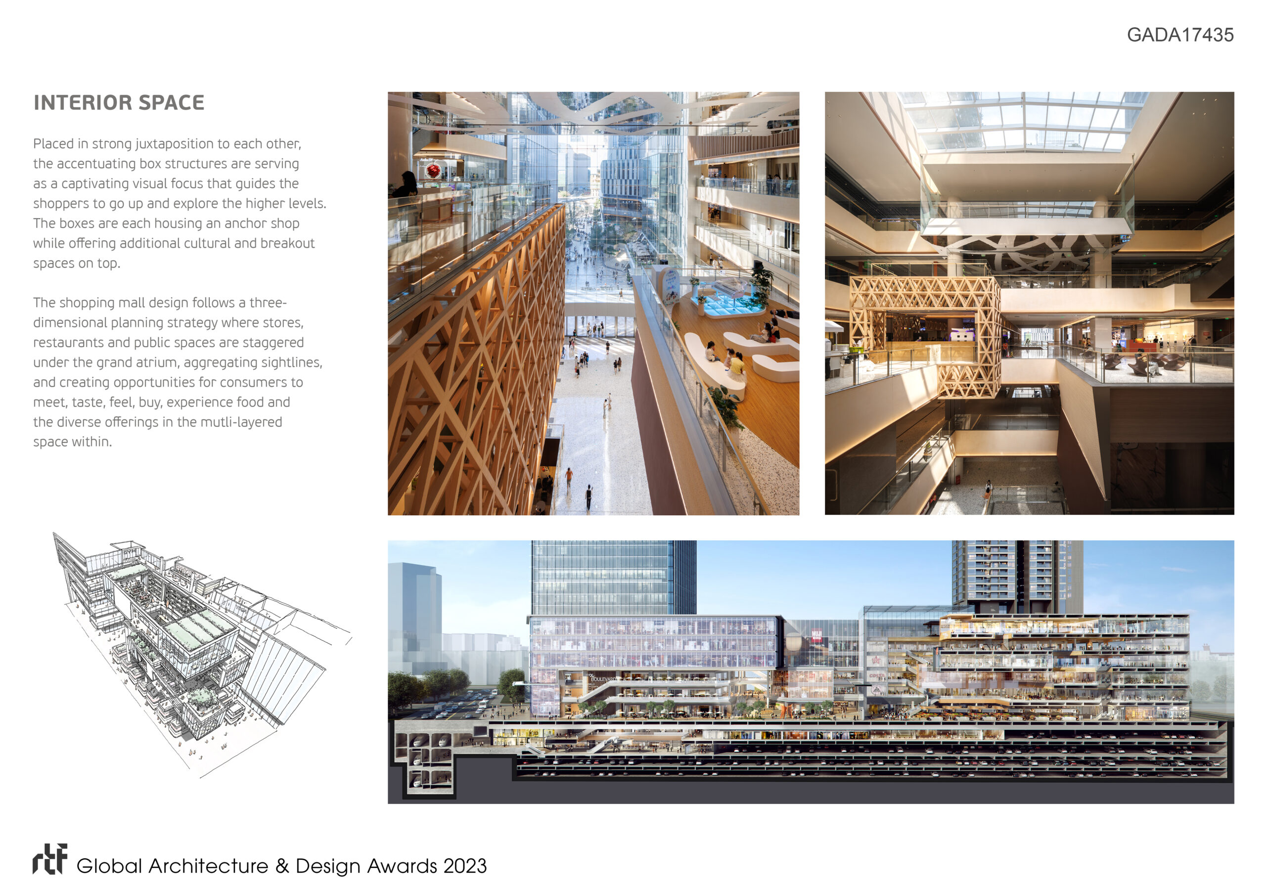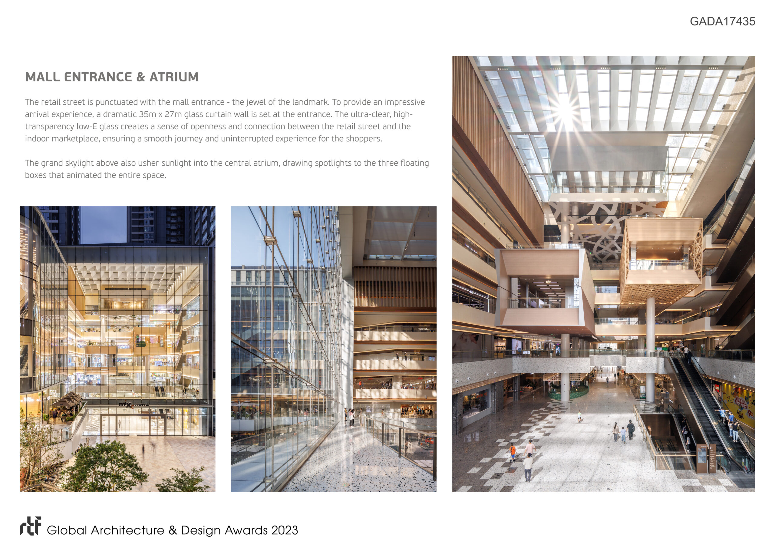 The shopping mall design follows a threedimensional planning strategy where stores, restaurants and public spaces are staggered under the grand atrium, aggregating sightlines, and creating opportunities for consumers to meet, taste, feel, buy, experience food and the diverse offerings in the mutli-layered space within. The design is to create a quality urban space for the area which invites communication and interaction between the community.