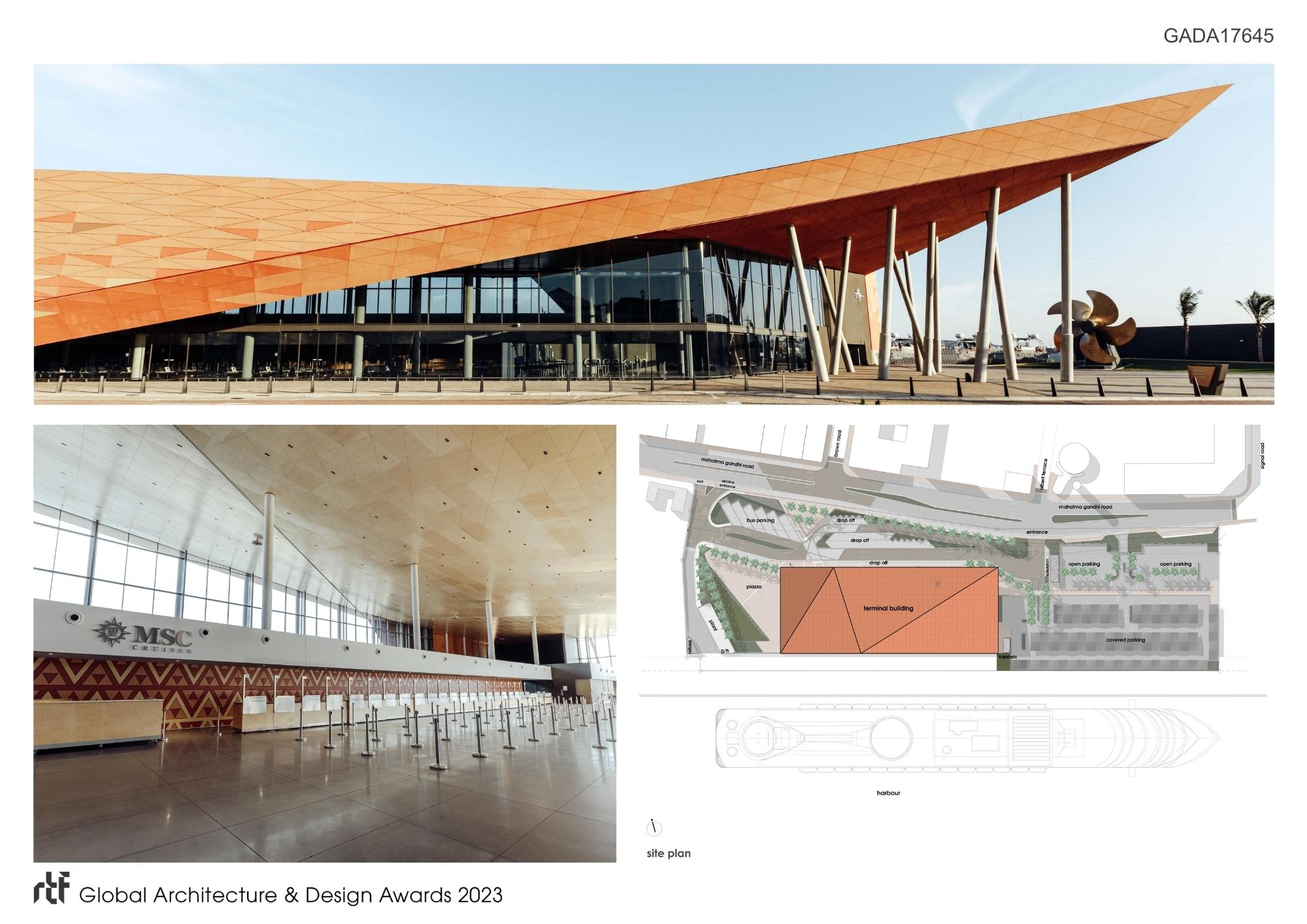 The terminal was conceived as the new portal to the Kingdom of the Zulus, welcoming tourists to the province and traditional culture. Dwarfed by docked cruise liners wharf side, the powerful form asserts itself as a memorable landmark object interfacing harbour and city. Conceived with an overt African identity, the envelope draws inspiration from the earthy colours, vibrant textures and traditional triangular-motifs displayed in Zulu craft. The African colouration inspired by Zulu artwork, is unique, contextual and demands attention, boldly contrasting the conventional neutral ‘treatment’ characterising most transportation buildings globally. This over-sailing construct and its folded form of the facades and roof, characterise the terminal to generate a simple, yet intricate architectural expression. Where the external envelope angles away, large glazed expanses promote visual connection between interior and urban exterior.