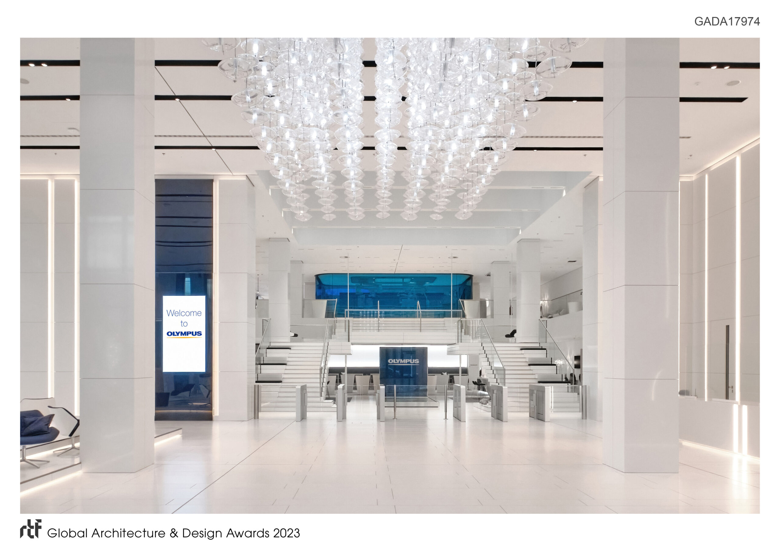 Founded in Japan in 1919, the company’s legacy in scientific research inspired the guiding concept for the entrance area and ground floor lobby and café: the lens. Transparency and lighting effects are complemented by the calming minimalism of contemporary “Japanease” style. Inspired by Japanese screens, white wall cladding backlit with floor-to-ceiling LEDs uses illumination to create patterns without adding additional materials or colours while also emphasising the entrance’s soaring height.