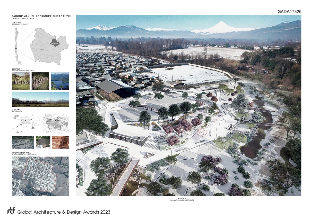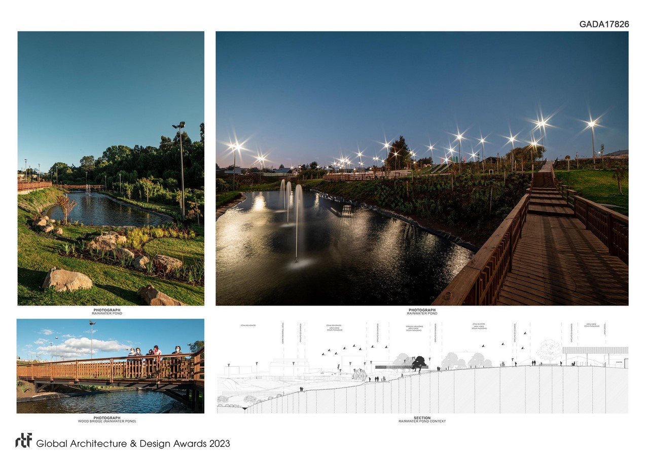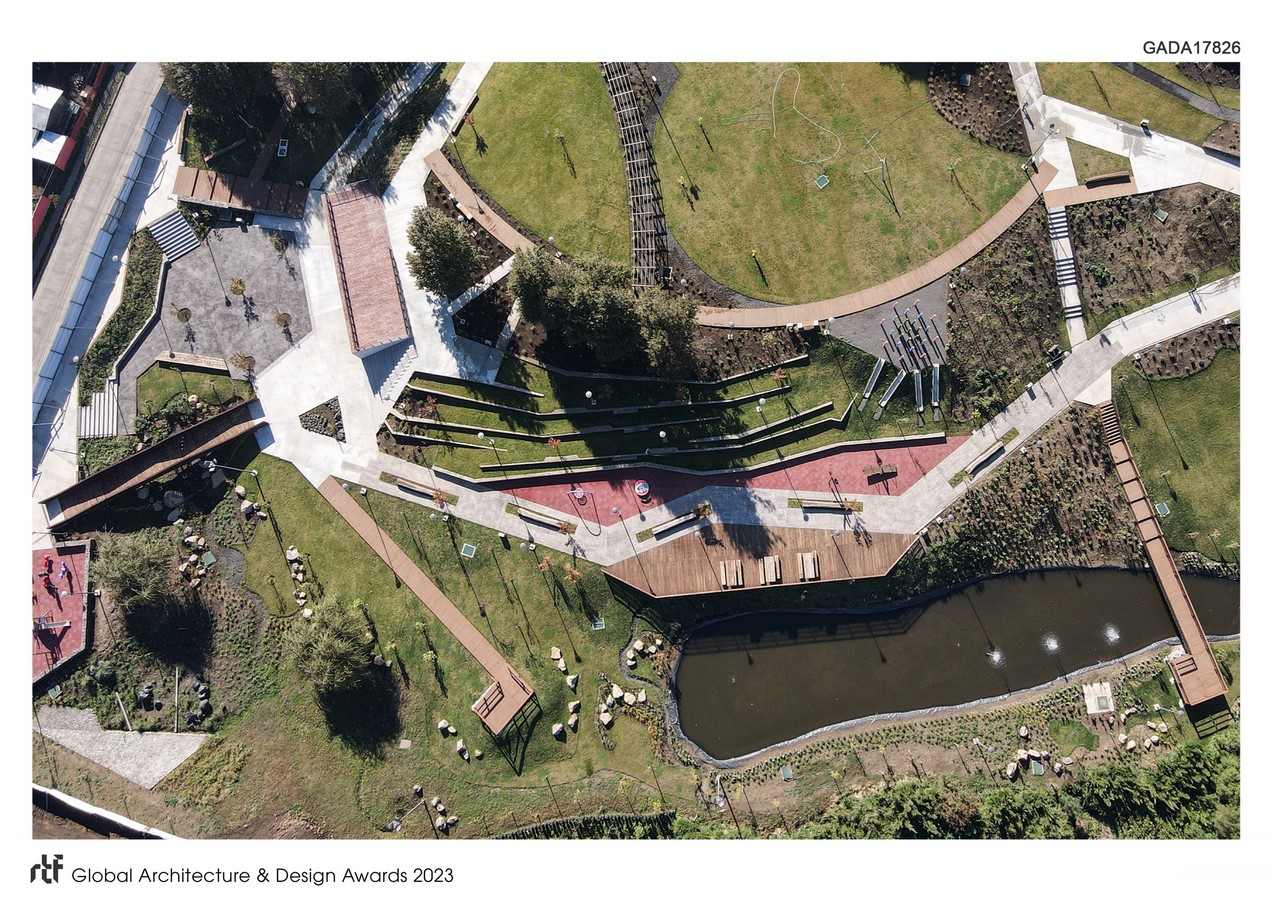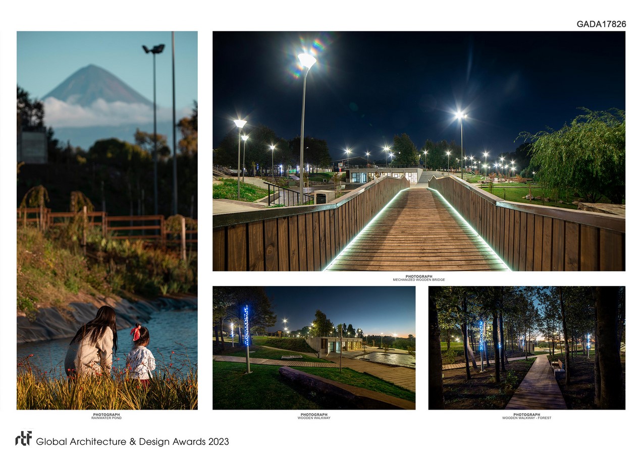 On the other hand, a greater intervention towards the neighborhood is defined, consolidating the urban edge of the park with the built-up fabric of the neighborhood, and towards its other edge specific interventions that value the local natural landscape and its distant mountain context, connecting its borders by means of bridges, sidewalks and footbridges that cross the small forest of Raulies and do not modify its topography in general terms, allowing the water to maintain its surface runoff courses, forming terraced areas until reaching the landscape terrace which proposes to collect the rainwater in a pond generating a sustainable irrigation system that optimizes rainwater generating a natural ecosystem that in landscape terms optimizes water resources through the selection of vegetation and endemic species according to the climate of the area and low water consumption accompanied of volcanic rocks and wooden terraces that refer to a mountain landscape and its history that in built terms recognizes a material identity of the city linked to its logging and railway past.