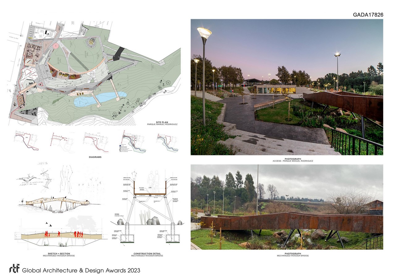 An accessible ring is proposed as the main circulation of the park, which surrounds the edge of the urban hill as an ordering axis that allows to travel the entire park with accesses that cross the low areas passing over the wild areas as bridges that refer to the trunks fallen from the forests of the Araucanian territory.