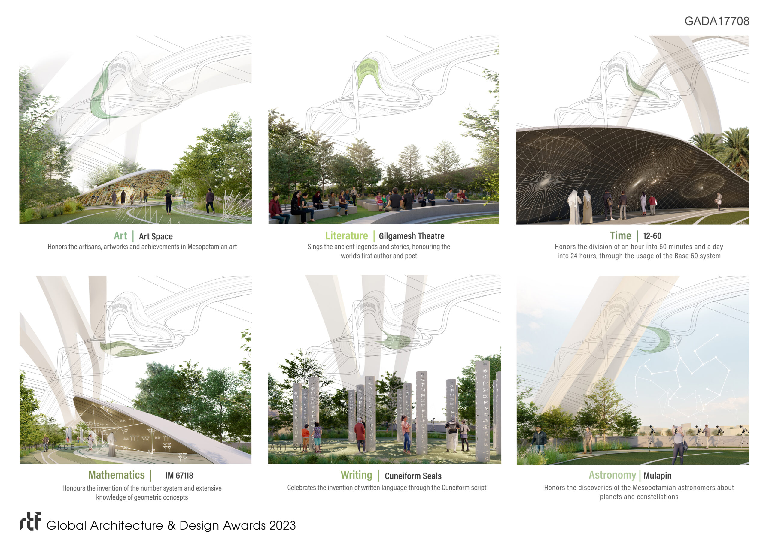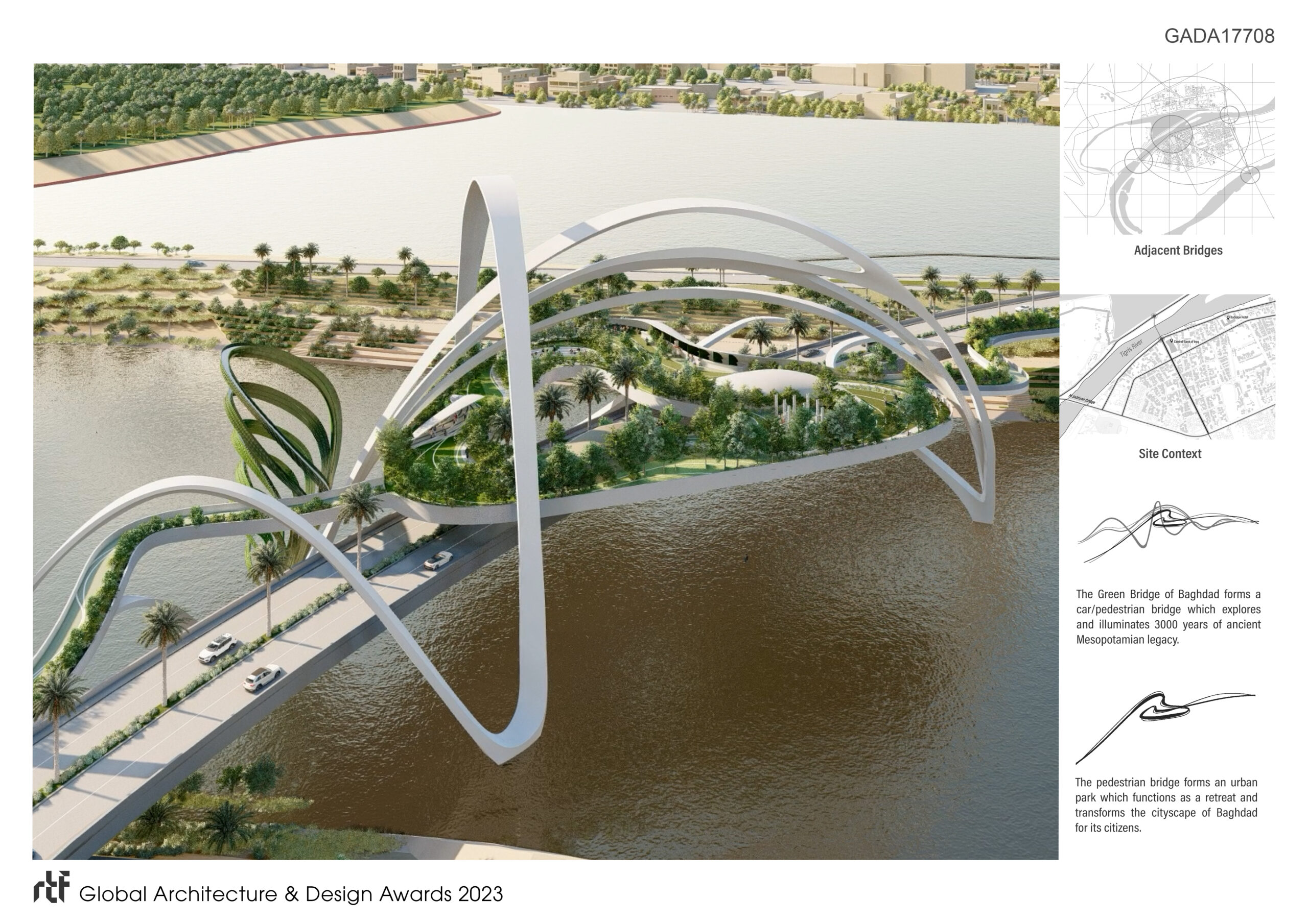 The design of the “Green Bridge of Baghdad” expands on the concept of a car/pedestrian bridge, by creating an urban public space that overlooks the Tigris river running underneath. The pedestrian bridge inspired by the shape of the heart and its different zones, forms a floating urban park that transforms the cityscape of Baghdad for its citizens. It comprises six distinct zones, each celebrating a unique aspect of Mesopotamian achievements and illuminating more than 3000 years of ancient legacy.