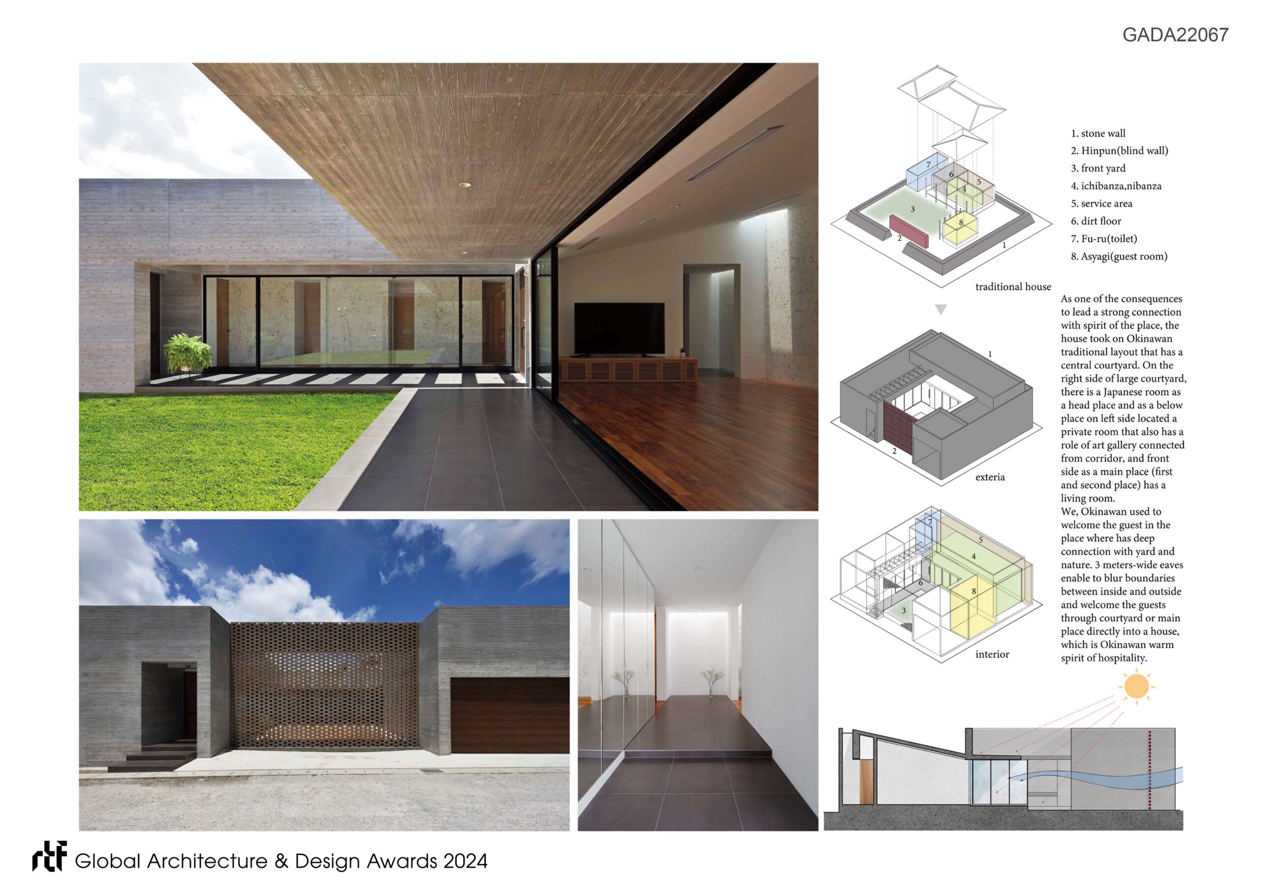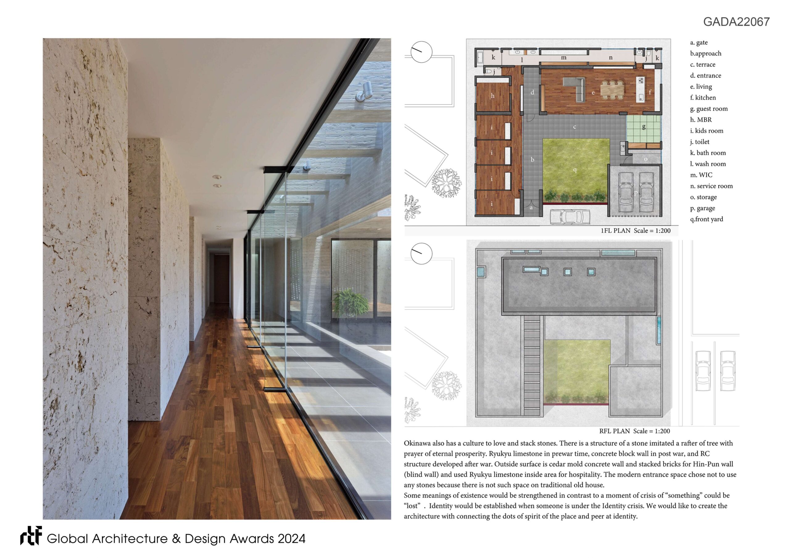 Okinawa also has a culture to love and stack stones. There is a structure of a stone imitated a rafter of tree with prayer of eternal prosperity. Ryukyu limestone in prewar time, concrete block wall in post war, and RC structure developed after war. Outside surface is cedar mold concrete wall and stacked bricks for Hin-Pun wall (blind wall) and used Ryukyu limestone inside area for hospitality. The modern entrance space chose not to use any stones because there is not such space on traditional old house.