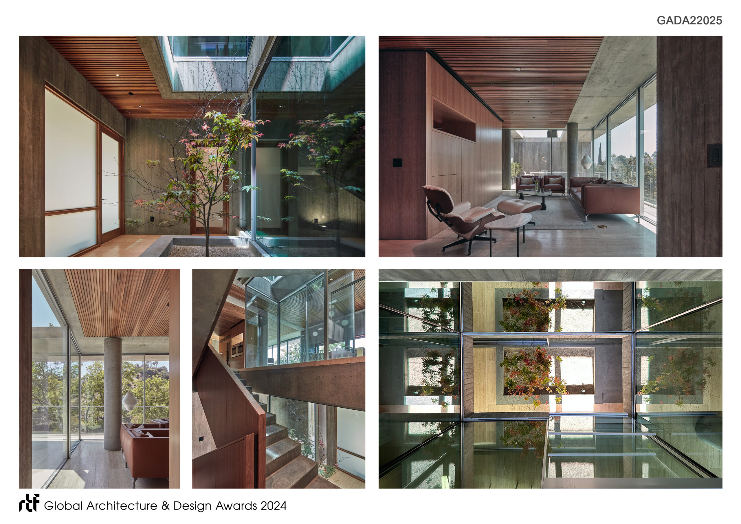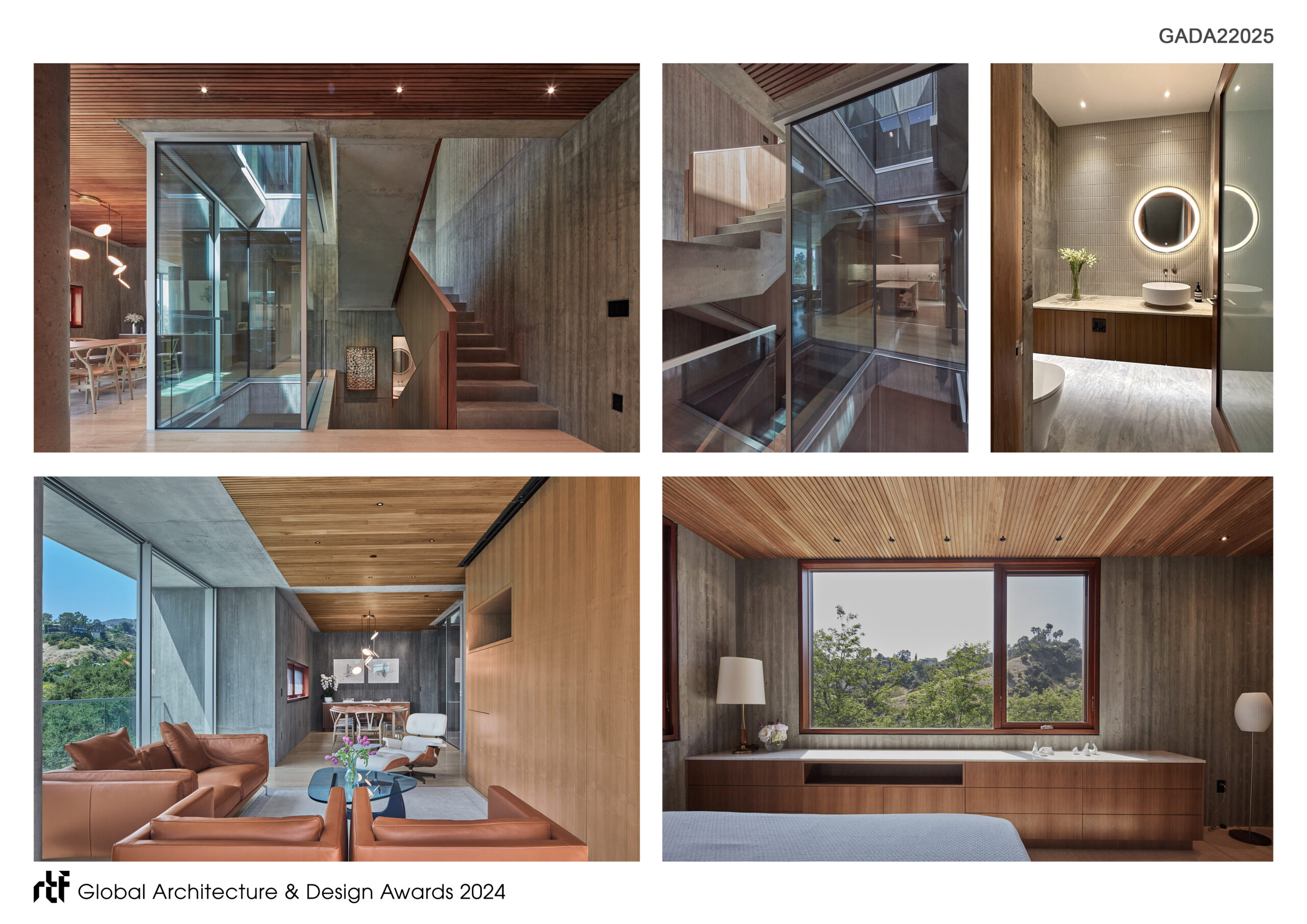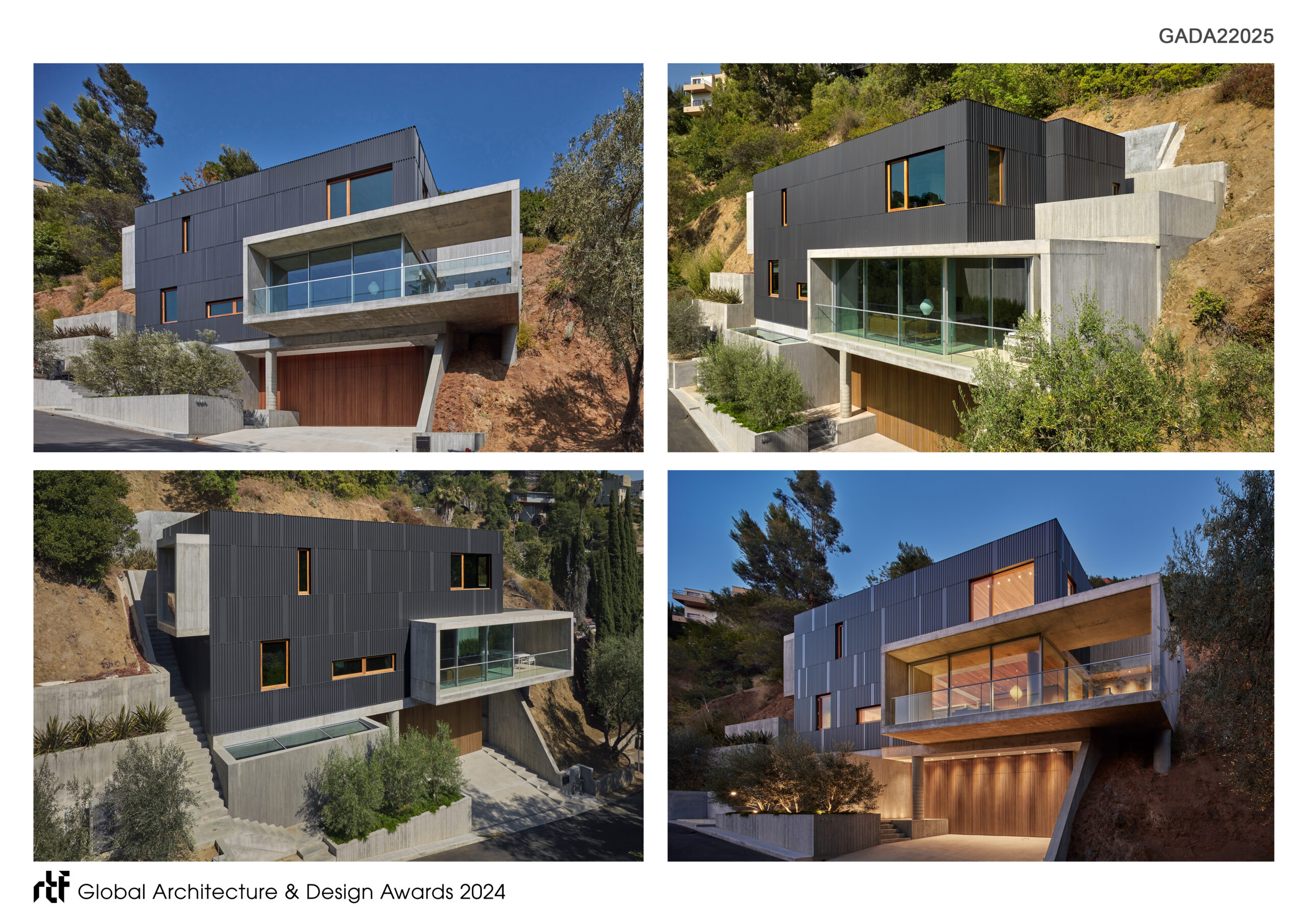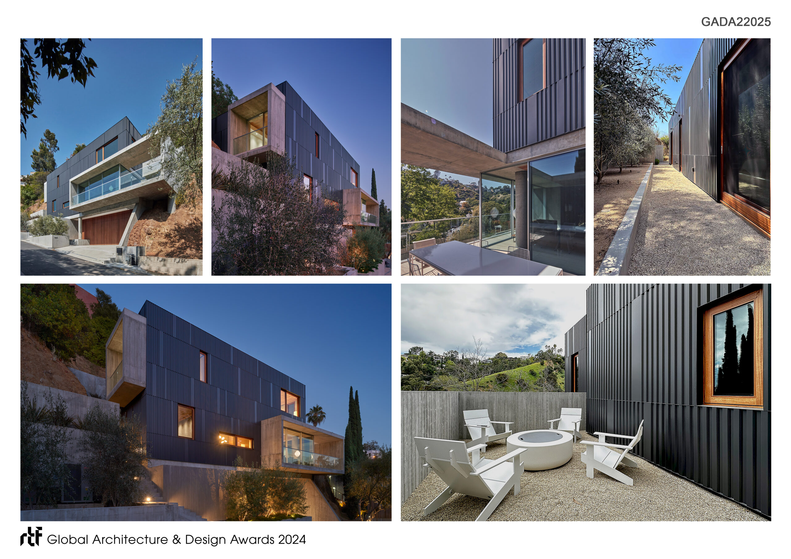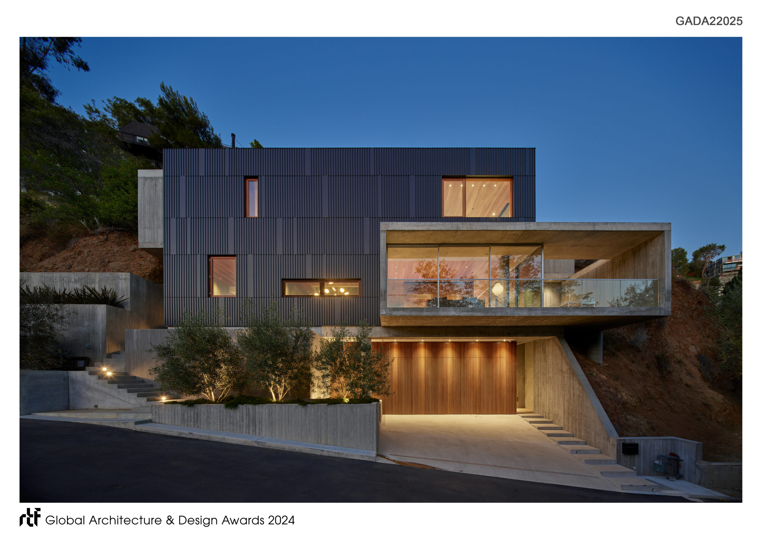 C House is nestled into an upslope lot in the historic Hollywood Hills Oaks neighborhood of Los Angeles. It utilizes the ‘house as the retaining wall’ planning and engineering approach like many architecturally noteworthy homes dotting the hillsides of Los Angeles. The lower two stories are mostly embraced on 3-sides by the hill, with the 3rd floor completely breaking free and offering day light on all 4-sides of the home.