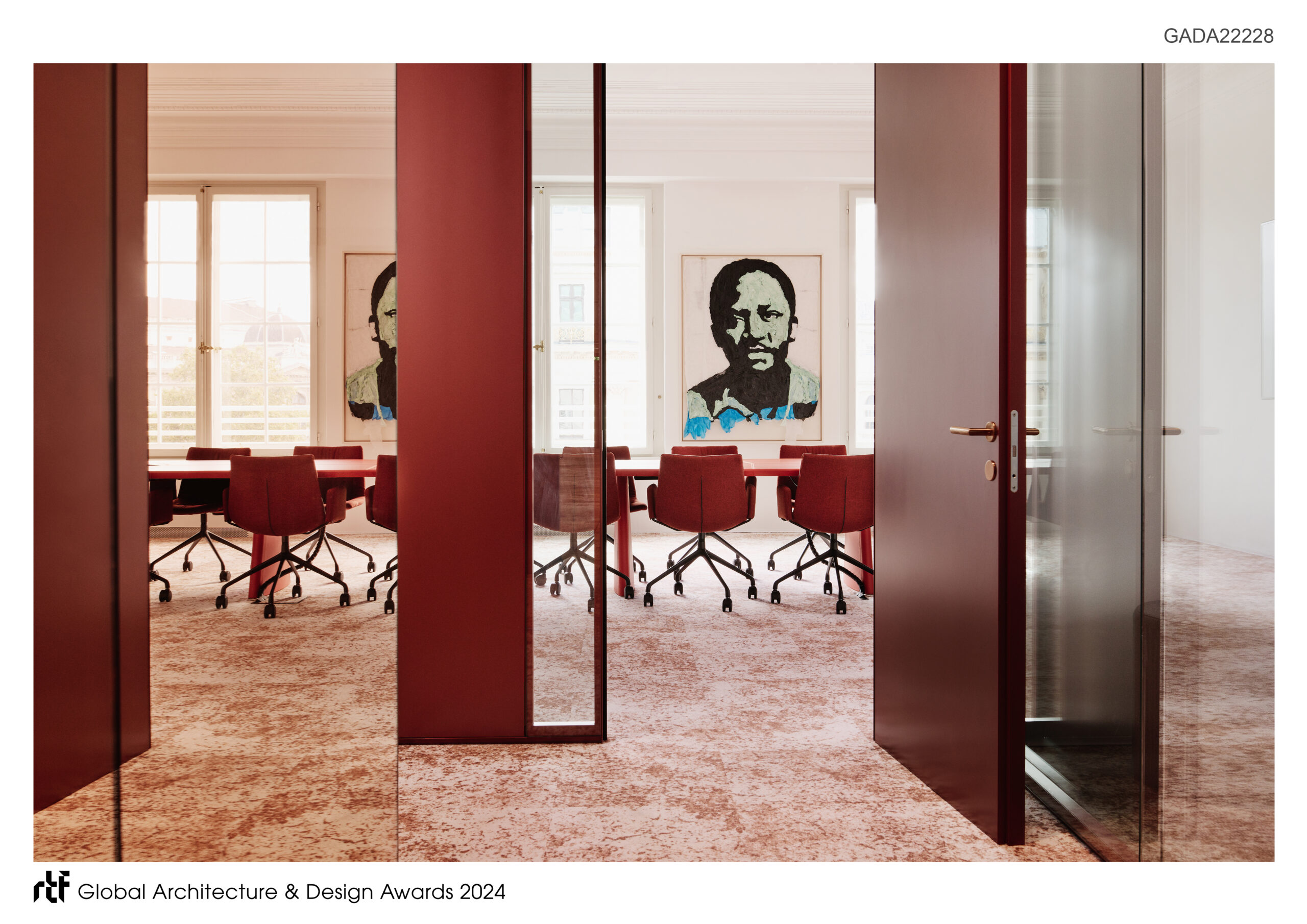 The company headquarters are located on the second floor, with the offices extending over the entire length of the wing on Schottenring and two thirds of the length of the wing on Heßgasse. They offer space for around 100 employees. The architectural concept is designed to create a clear, linear axial structure that harmoniously unites the different areas. The space is divided into clearly defined zones along these axes.